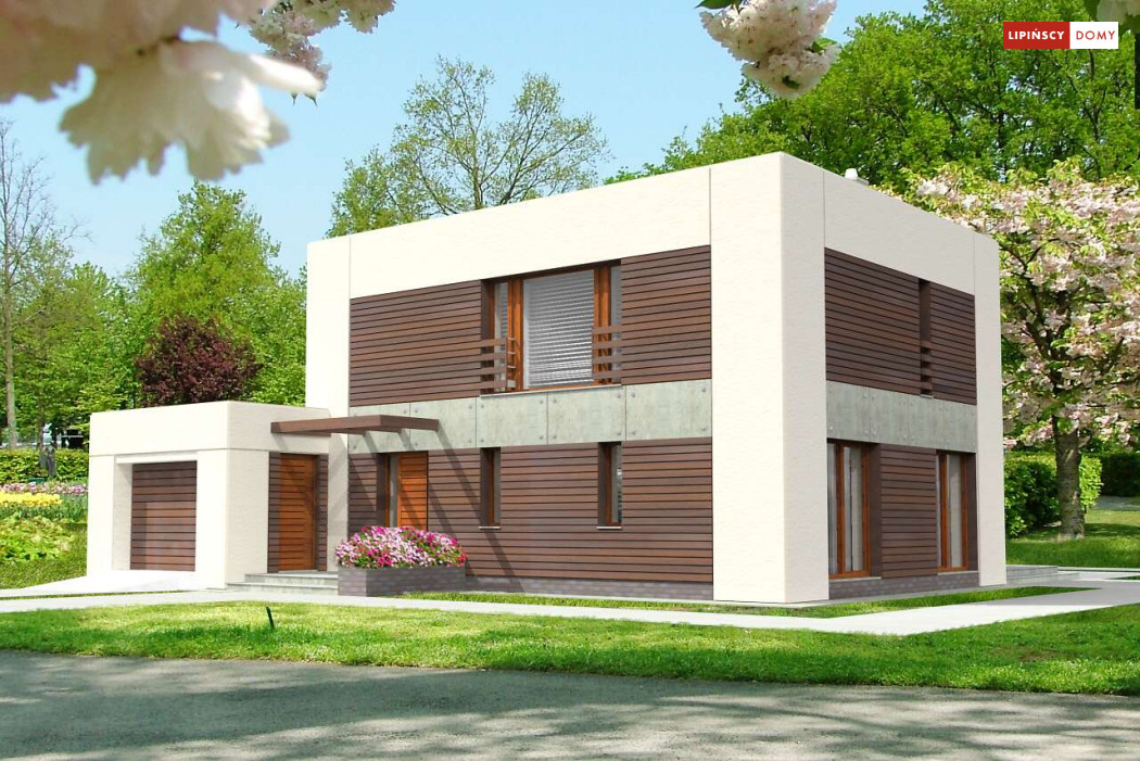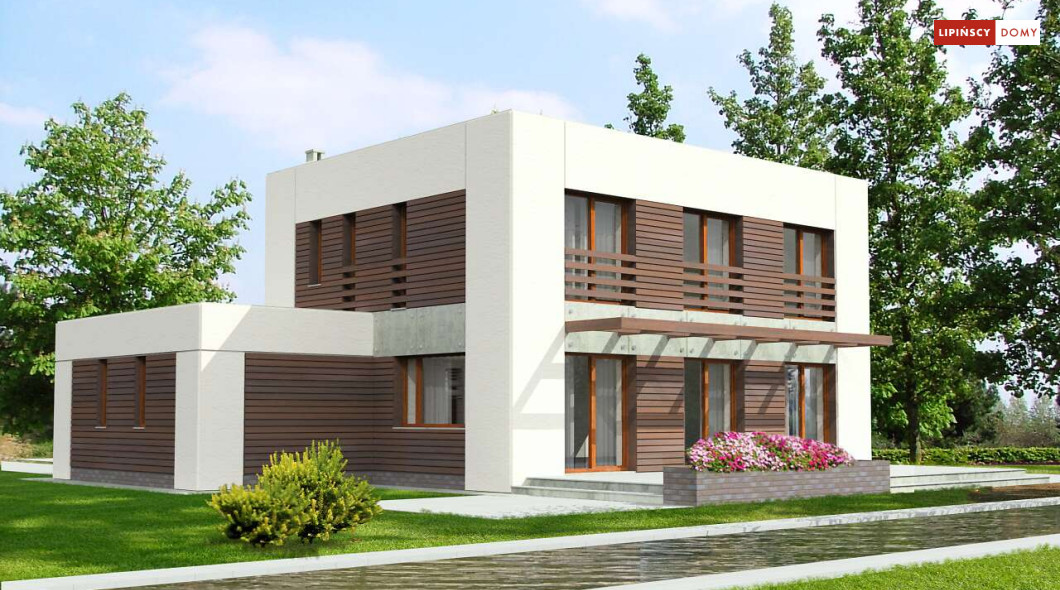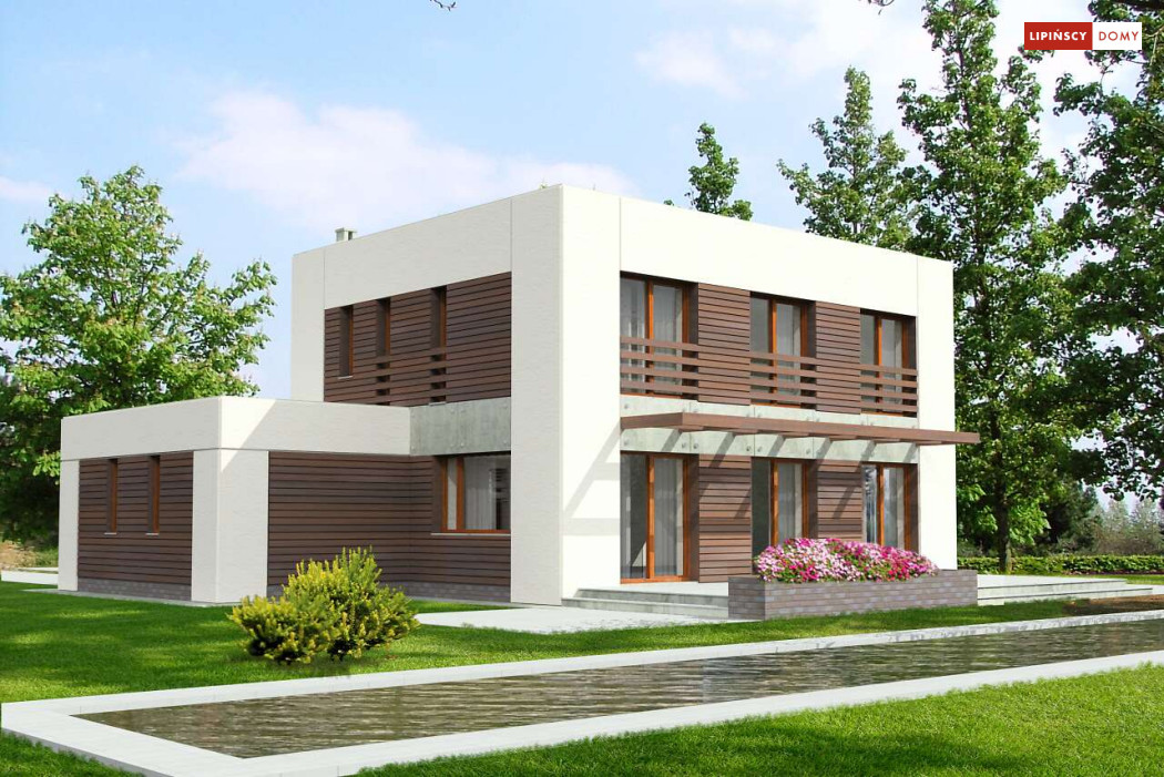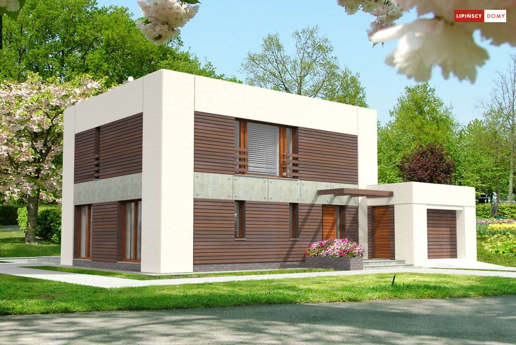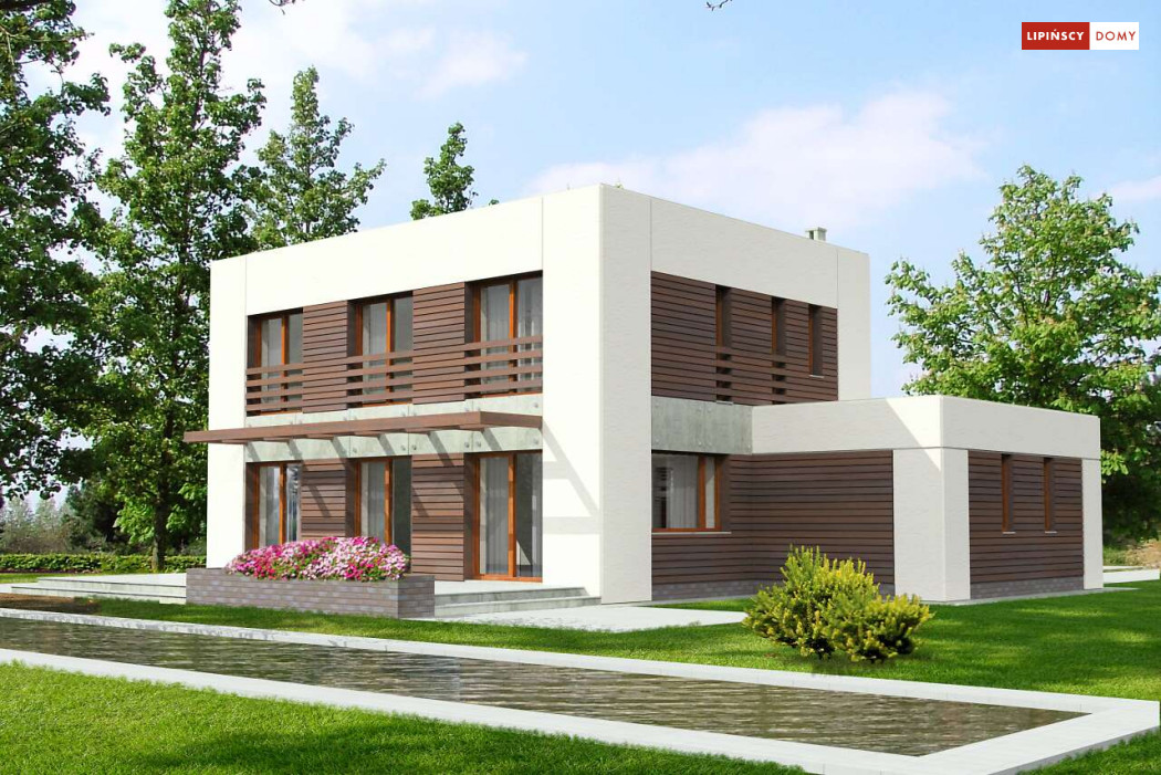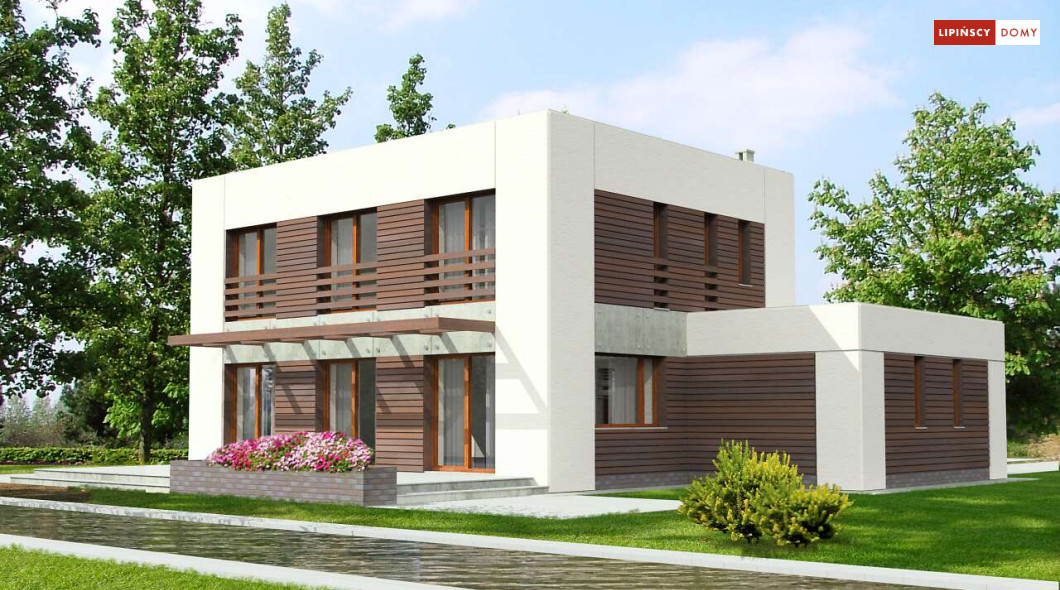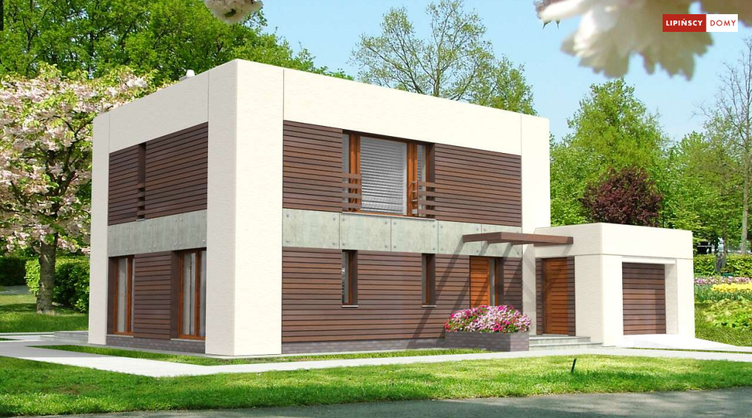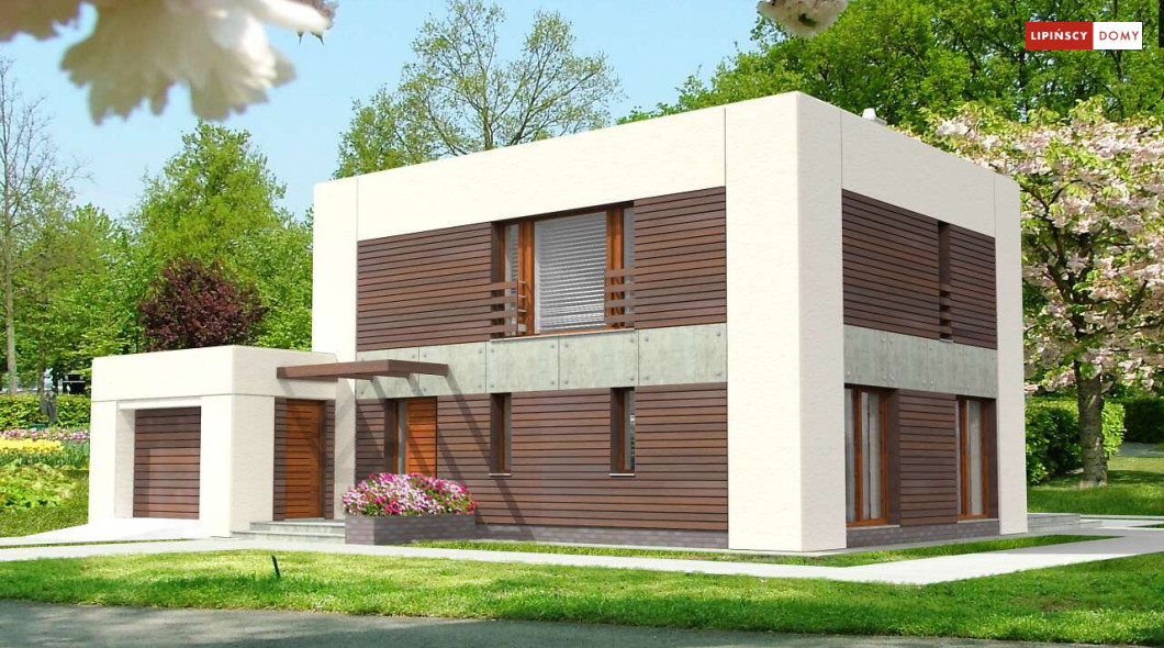 Dom pasywny o zdecydowanej, harmonijnej bryle i perfekcyjnie skrojonym wnętrzu. Wszystkie sypialnie na piętrze są usytuowane od strony południowej, a pomieszczenia gospodarcze od strony północnej. Jedna z sypialni posiada własną garderobę i łazienkę. Na parterze natomiast salon sąsiaduje z dużą i dobrze doświetloną kuchnią oraz tarasem przekrytym ażurowym zadaszeniem. Harmonijne elewacje w zaproponowanej kolorystyce prezentują się spokojnie i elegancko.