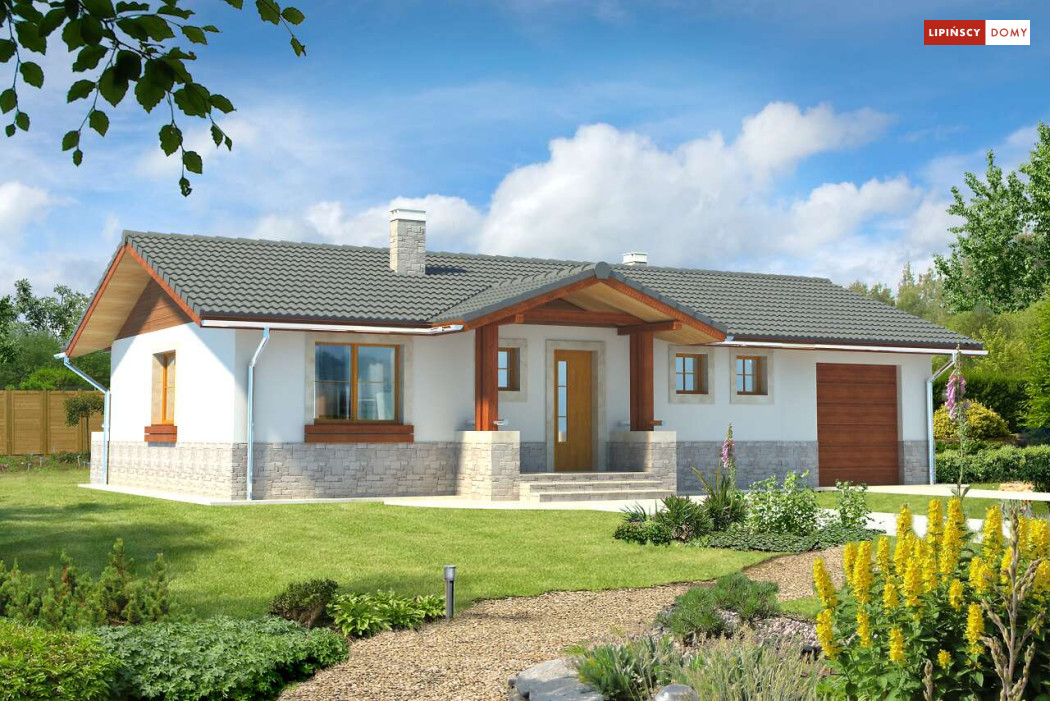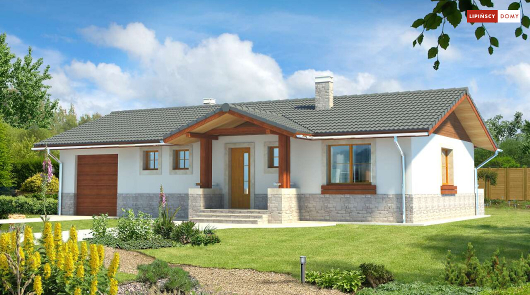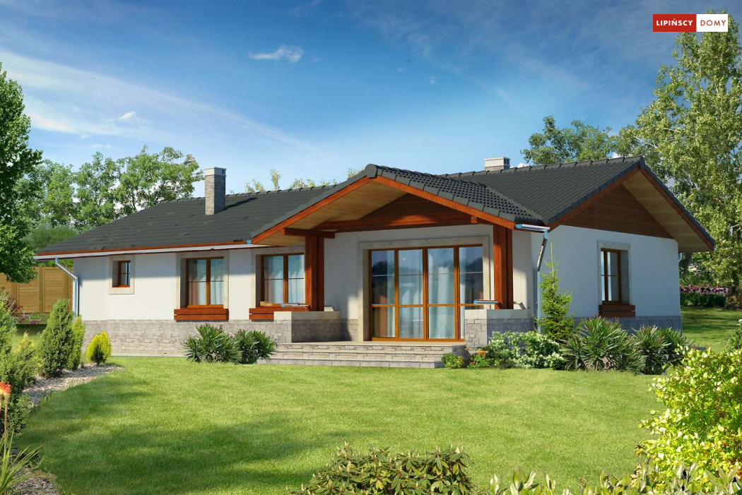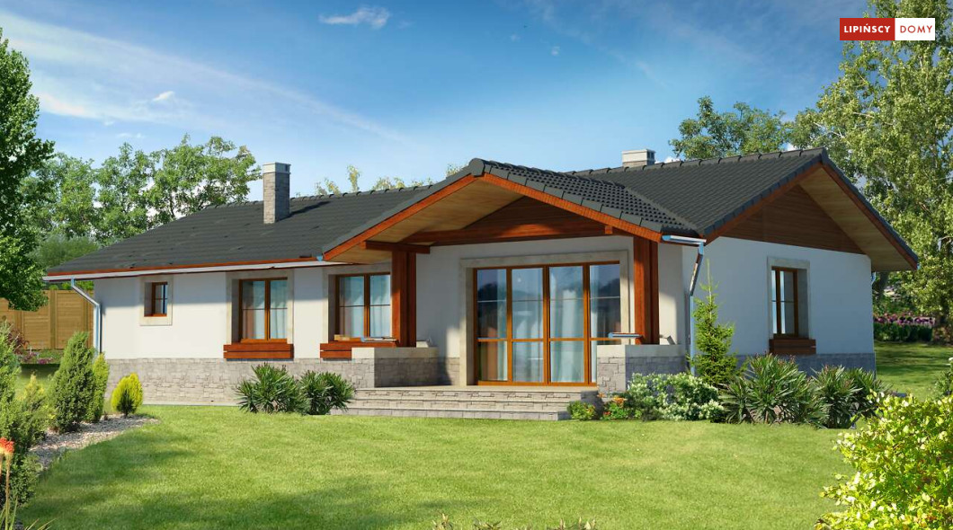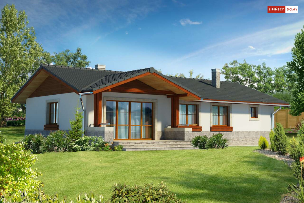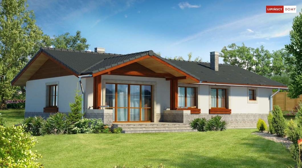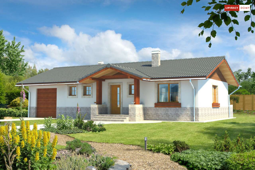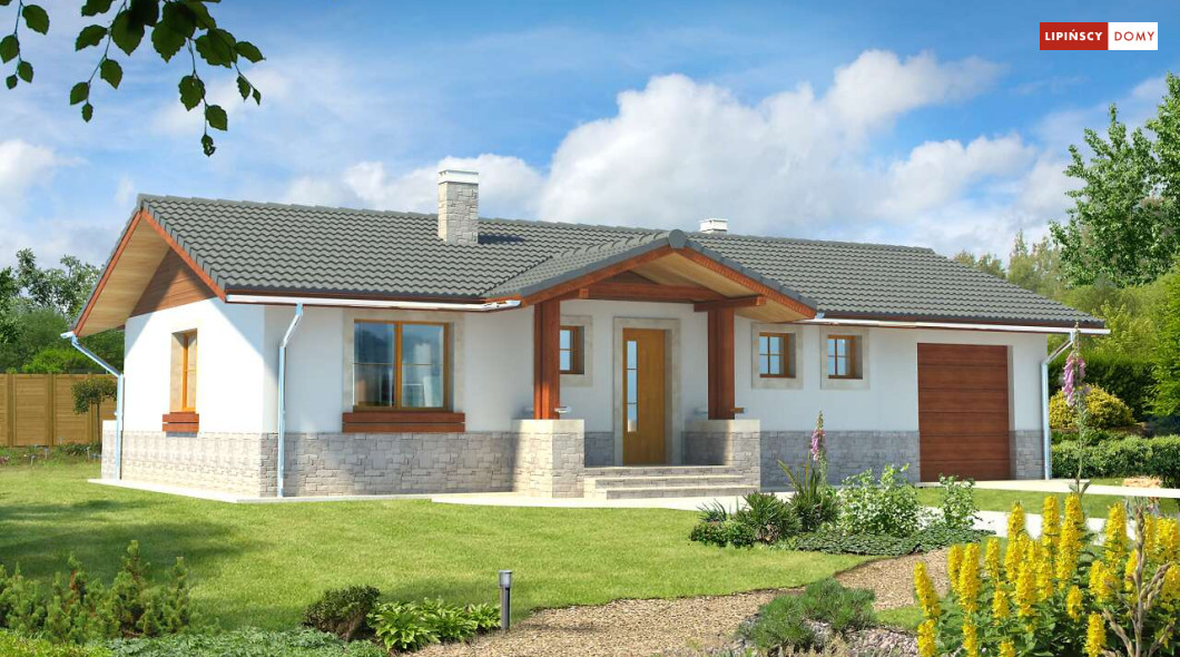 Niewielki, zgrabny domek parterowy z dwuspadowym dachem i zadaszeniami nad wejściem i tarasem. Oprócz wygodnej strefy dziennej zaplanowano dwie sypialnie i dużą łazienkę oraz kilka pomieszczeń pomocniczych. Z domu można przejść bezpośrednio do garażu, poprzez niewielki schowek. Za garażem znajduje się osobna kotłownia, która może być także zaadaptowana na piec na paliwo stałe. Pomieszczenie przy wejściu może natomiast pełnić rolę spiżarni.