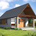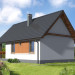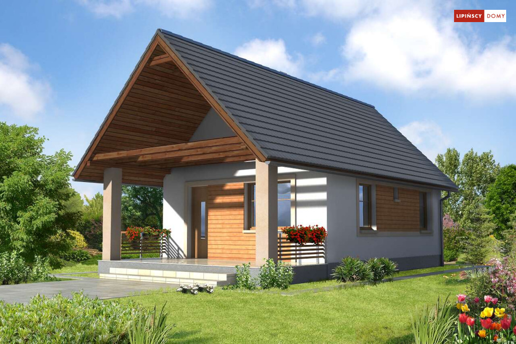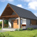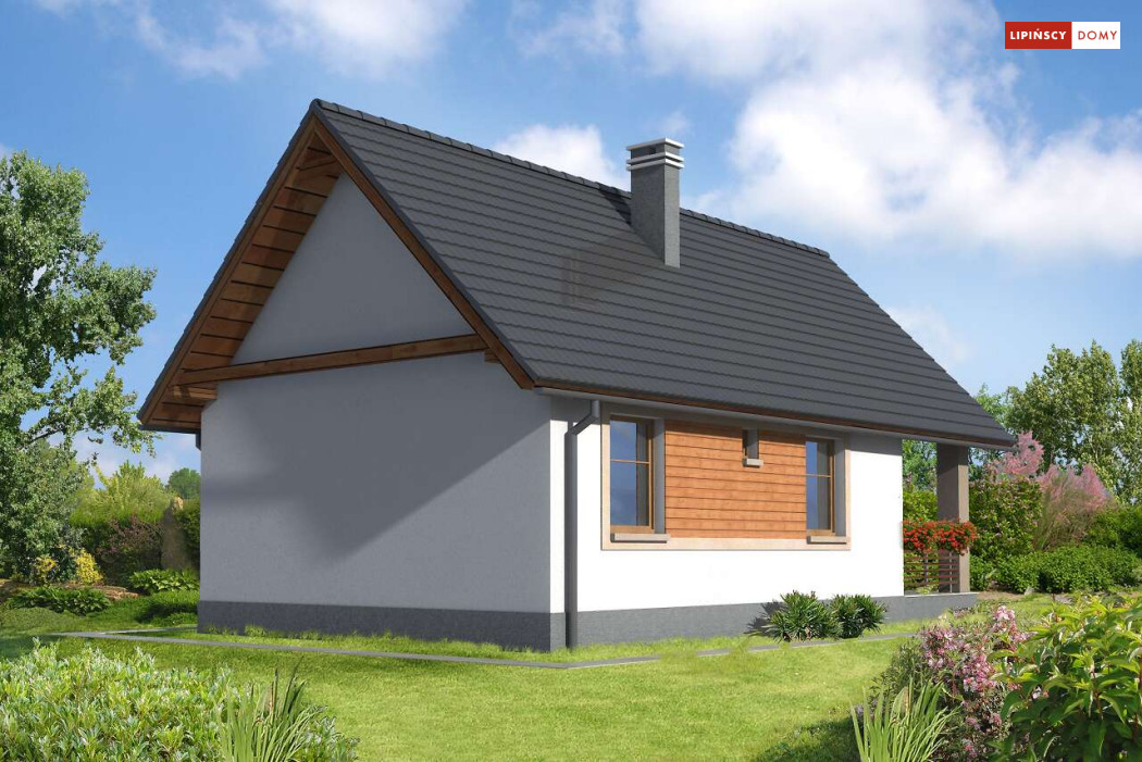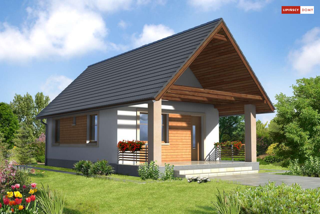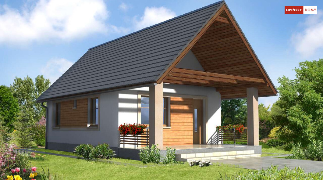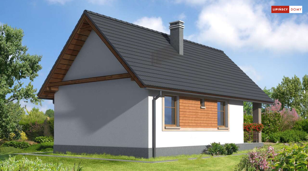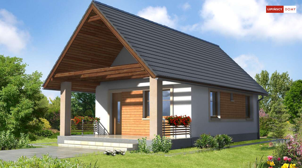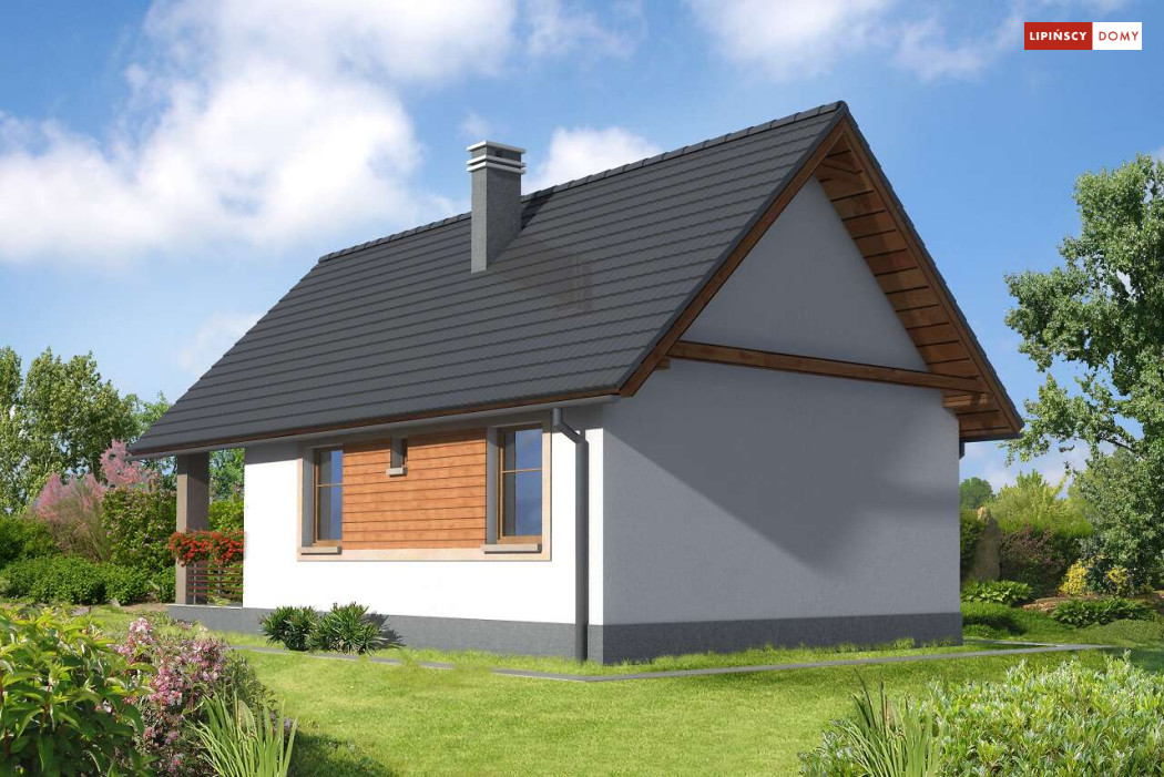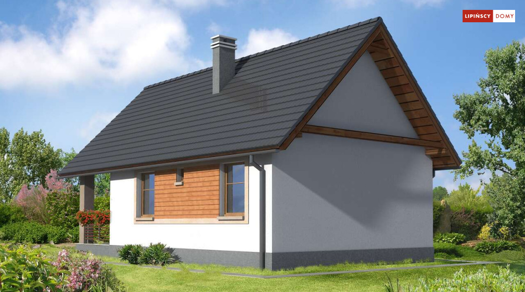 Weekendowy dom z dużym tarasem i dwiema sypialniami. Część dzienna to wspólna przestrzeń saloniku z kominkiem i aneksu kuchennego. W domku można wykorzystać stryszek, dostępny poprzez składane schody.