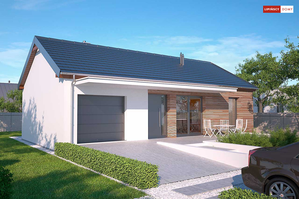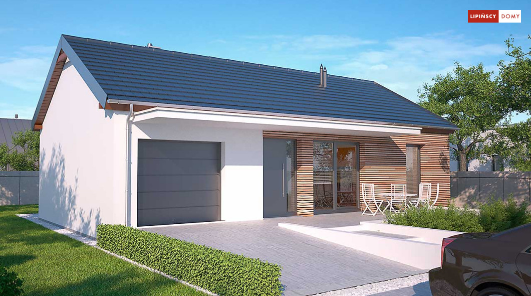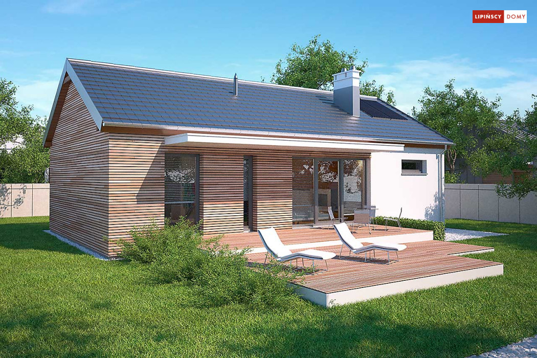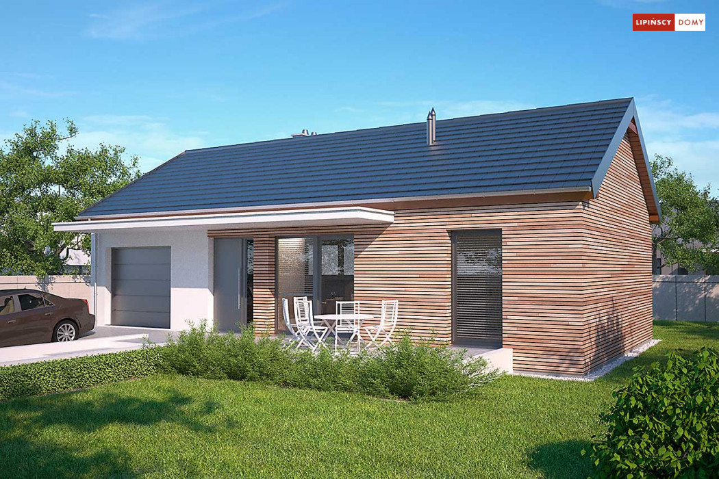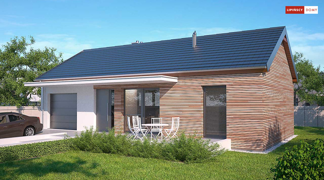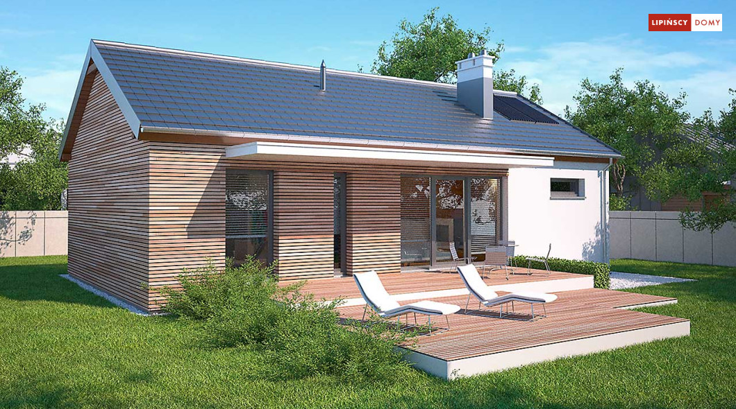 Prosty w budowie dom parterowy z dwuspadowym dachem, idealny dla pary seniorów lub niewielkiej rodziny. Funkcjonalny i przemyślany układ pomieszczeń gwarantuje mieszkańcom wygodne użytkowanie. Ustawną kuchnię z miejscem na rodzinny stół otworzono na salon z kominkiem, z którego można wyjść na zadaszony taras. Znajduje się tu również sypialnia, dodatkowy pokój oraz doświetlona oknem łazienka. W prostą bryłę wpisano garaż na jedno auto, za którym zlokalizowano pomieszczenie gospodarcze z kotłem gazowym. Nowoczesny wygląd nadają domowi przede wszystkim elewacje wykończone drewnem łączonym z białym tynkiem, jedynie minimalnie wysunięty okap dachu, proste zadaszenia tarasów oraz duże przeszklenia o nietradycyjnych formatach. Bardzo praktycznym rozwiązaniem są dwa trasy - wejściowy i ogrodowy, dzięki czemu z wypoczynku na słońcu i świeżym powietrzu będzie można korzystać o każdej porze dnia.<br>