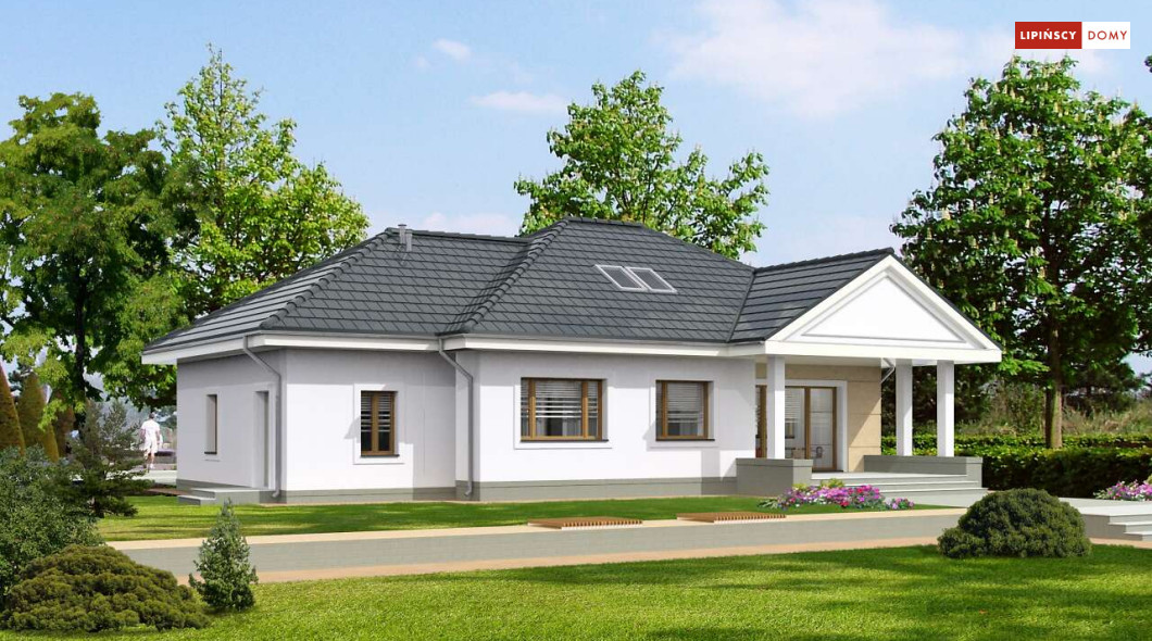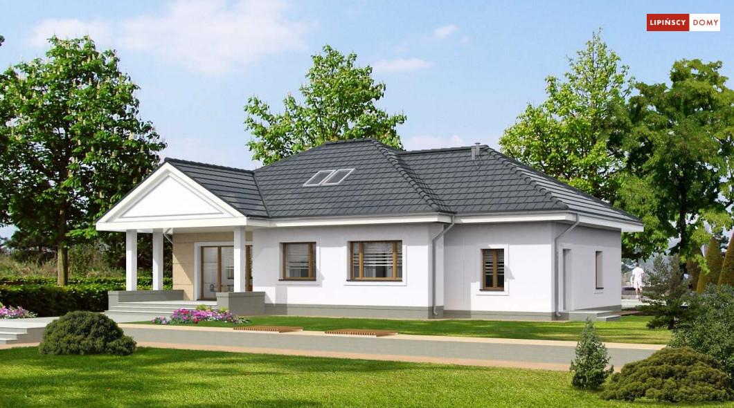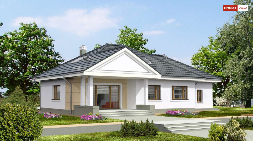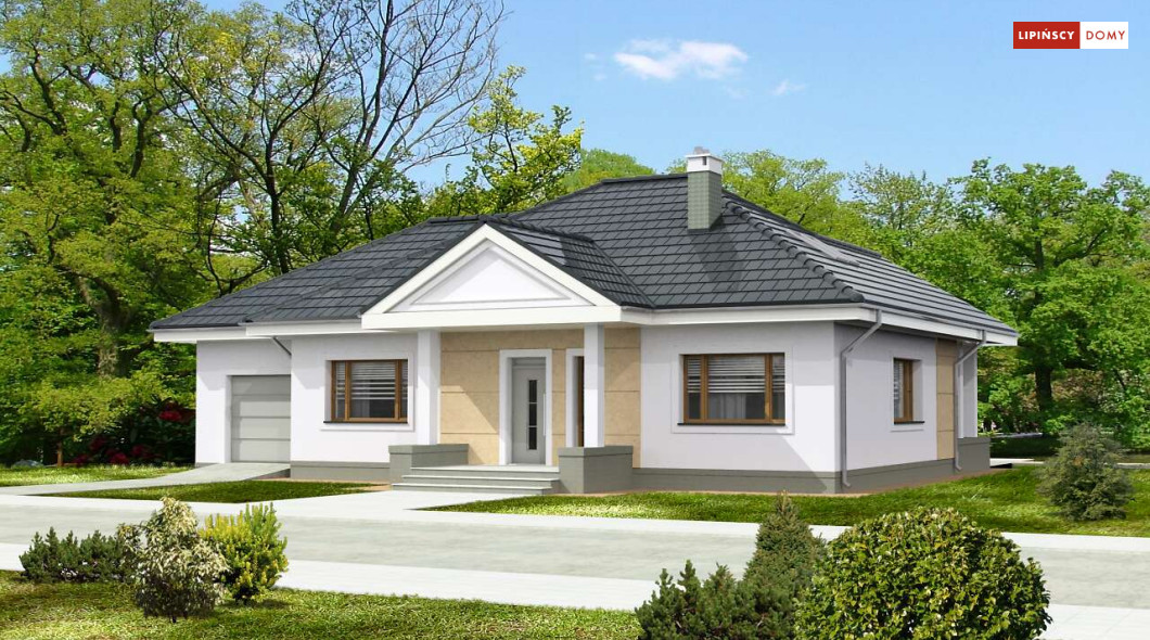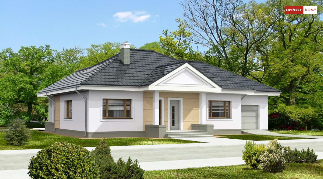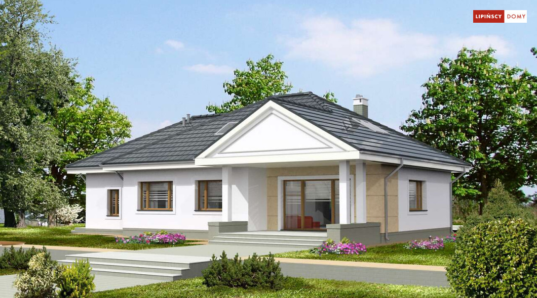 Nieduży dom energooszczędny, parterowy, z zaplanowanymi stałymi schodami, dzięki czemu w późniejszym etapie można na część mieszkalną zaadaptować strych. Prostą bryłę zdobi wielospadowy dach oraz ciekawie zaaranżowane, zadaszone wejście i taras ogrodowy. Wnętrze domu zostało wyraźnie podzielone na dwie strefy – dzienną z wygodnym, jasnym salonem i otwartą na niego kuchnią, obok której zlokalizowano przydatne pomieszczenie gospodarcze oraz strefę prywatną z trzema ustawnymi sypialniami i dużą łazienką. W bryłę wkomponowano garaż na jedno stanowisko, za którym znajduje się pomieszczenie gospodarcze z wyjściem na zewnątrz, idealne do przechowywania rowerów czy sprzętu ogrodowego.