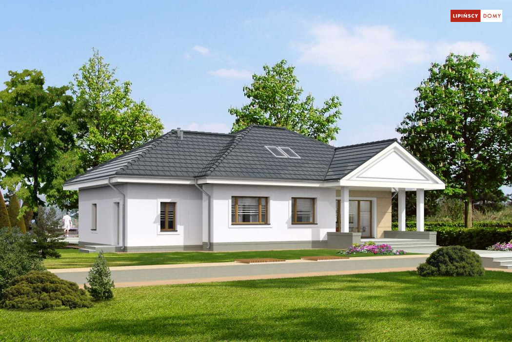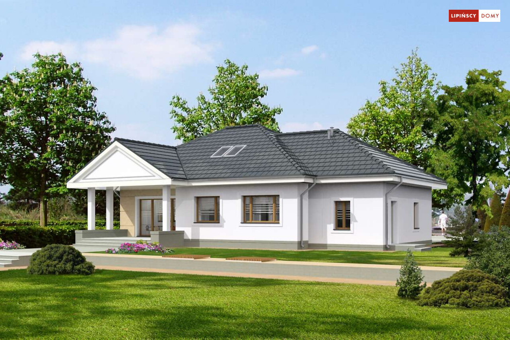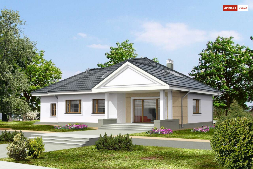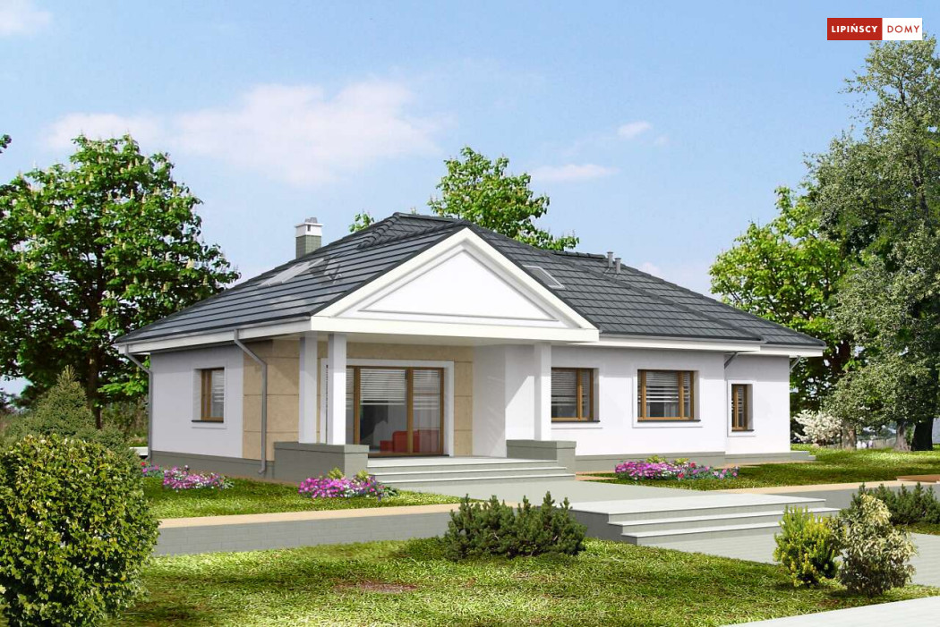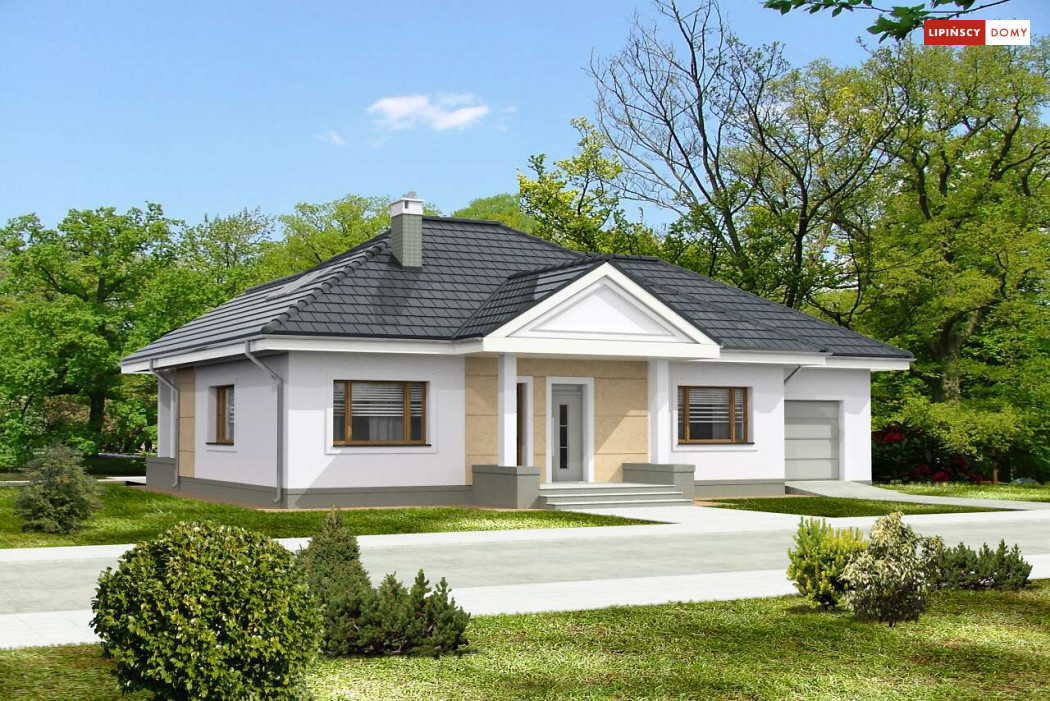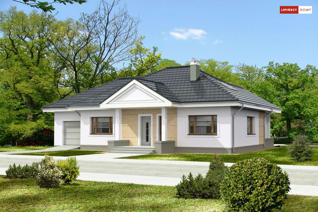 Nieduży dom energooszczędny, parterowy, z zaplanowanymi stałymi schodami, dzięki czemu w późniejszym etapie można na część mieszkalną zaadaptować strych. Prostą bryłę zdobi wielospadowy dach oraz ciekawie zaaranżowane, zadaszone wejście i taras ogrodowy. Wnętrze domu zostało wyraźnie podzielone na dwie strefy – dzienną z wygodnym, jasnym salonem i otwartą na niego kuchnią, obok której zlokalizowano przydatne pomieszczenie gospodarcze oraz strefę prywatną z trzema ustawnymi sypialniami i dużą łazienką. W bryłę wkomponowano garaż na jedno stanowisko, za którym znajduje się pomieszczenie gospodarcze z wyjściem na zewnątrz, idealne do przechowywania rowerów czy sprzętu ogrodowego.