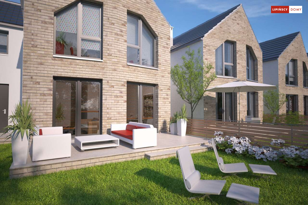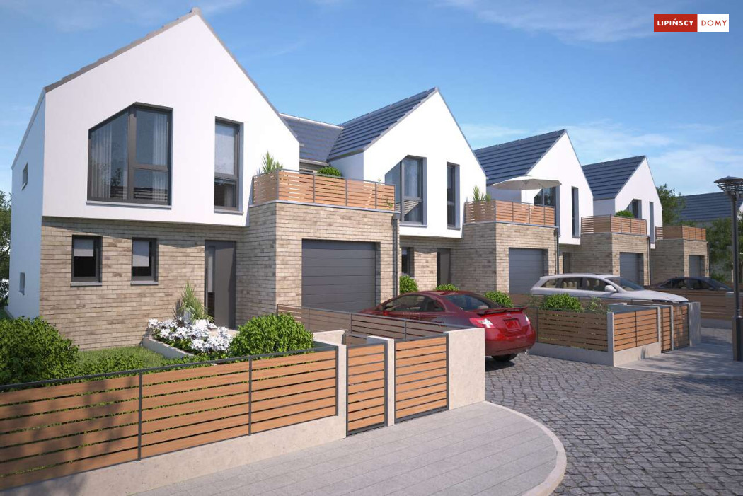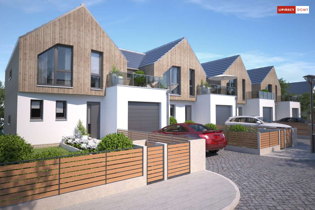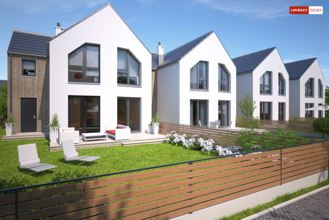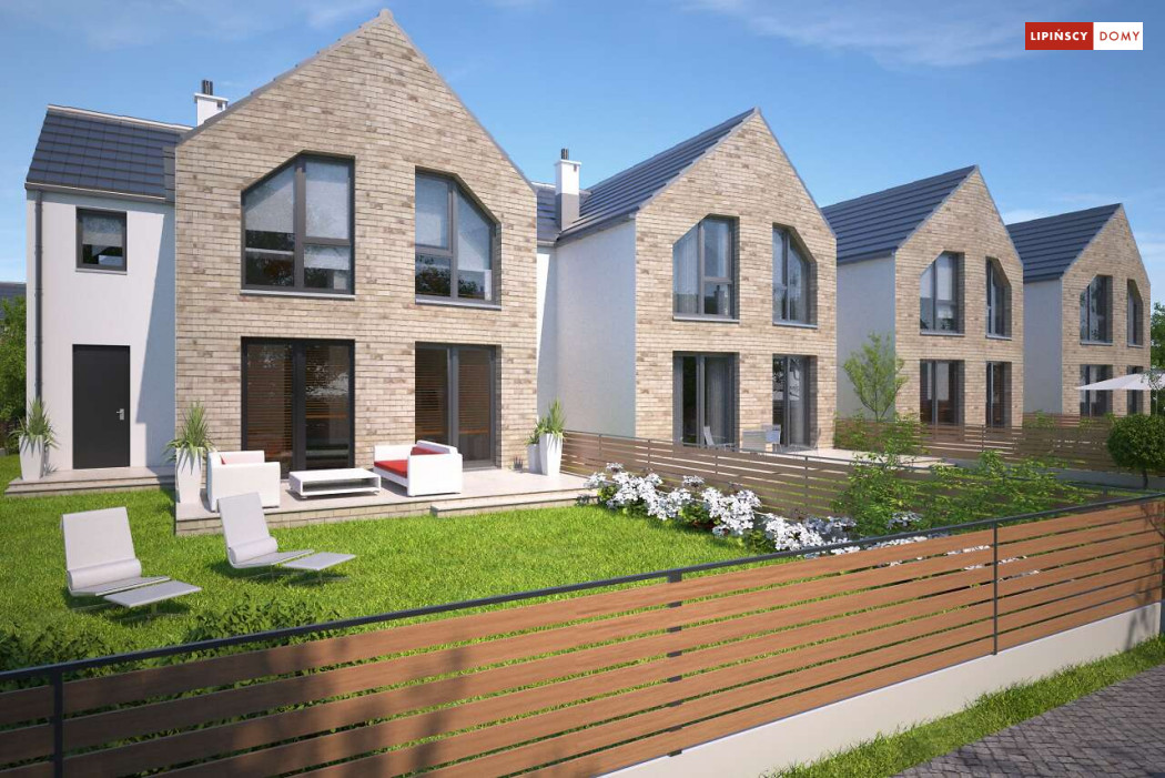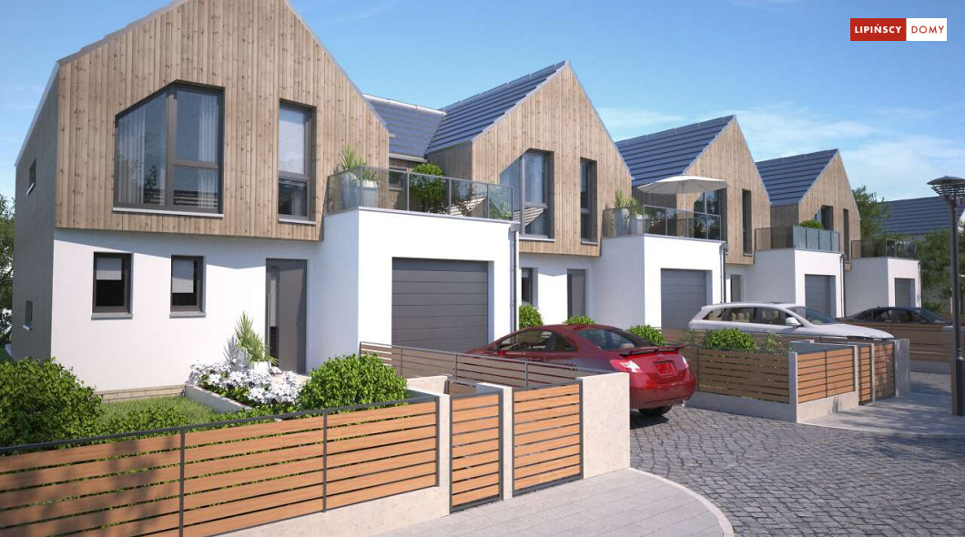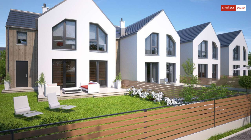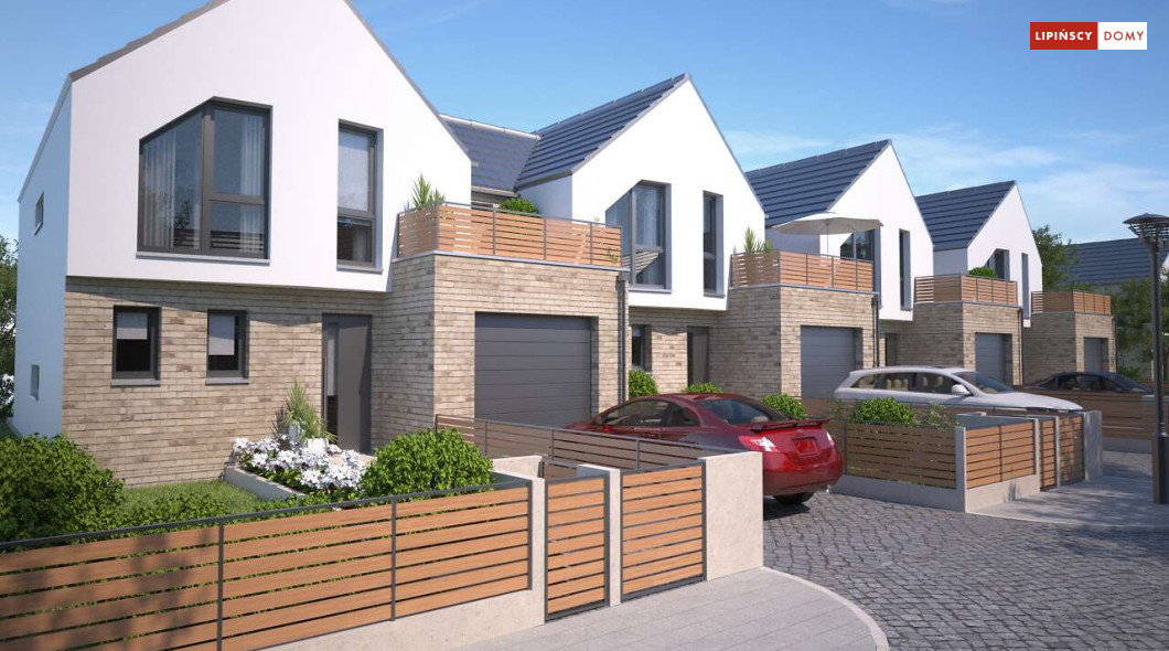 Ciekawy projekt domu jednorodzinnego w zabudowie szeregowej. Nietypowy rzut oraz interesująca elewacja frontowa niewątpliwie wyróżnia ten projekt spośród innych szeregówek. Na parterze przy garażu znajduje się pomieszczenie gospodarcze z bezpośrednim przejściem do ogrodu. Jest również słoneczny salon, kuchnia oraz spiżarnia i toaleta. Na piętrze są natomiast trzy sypialnie, w tym jedna z tarasem. Zaprojektowano również dużą wygodną łazienkę oraz osobną pralnię i suszarnię.