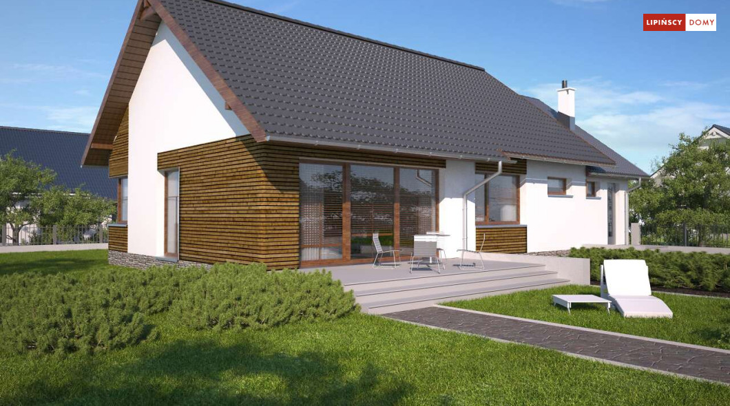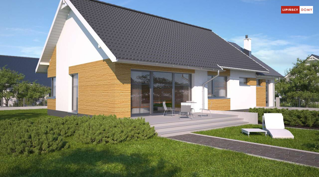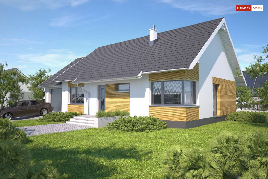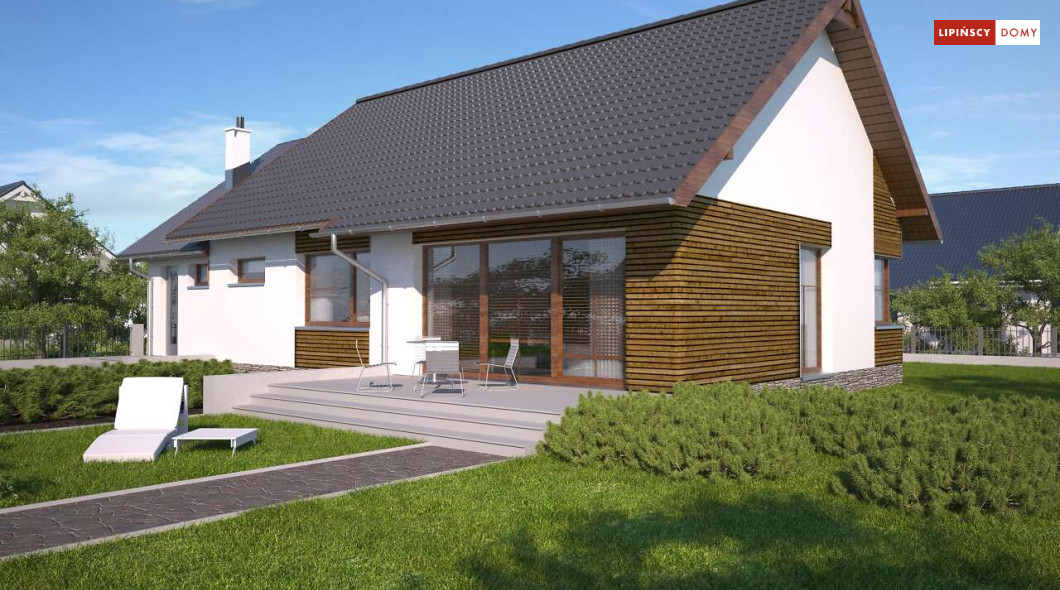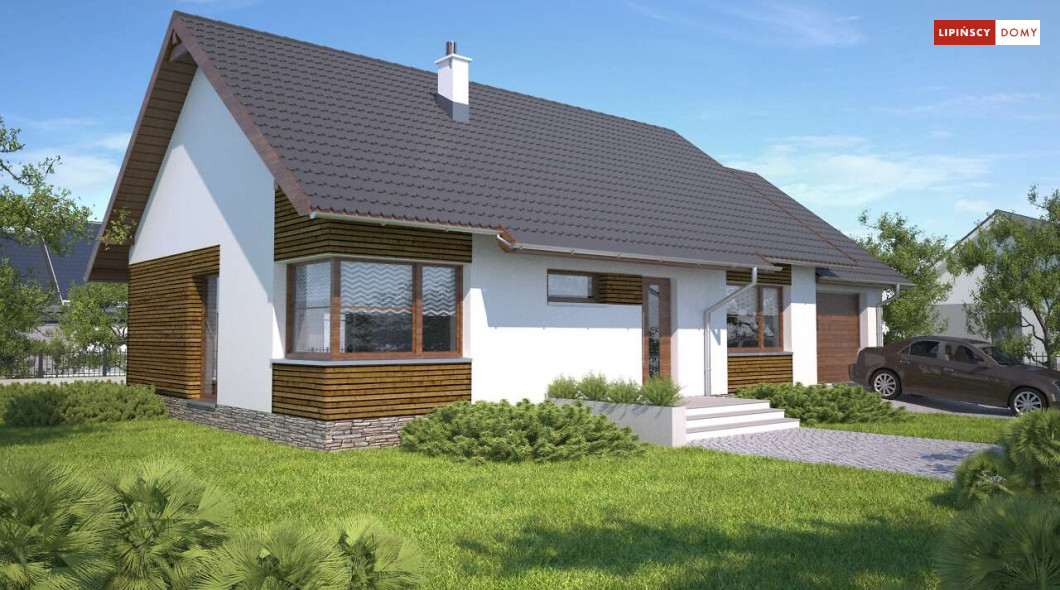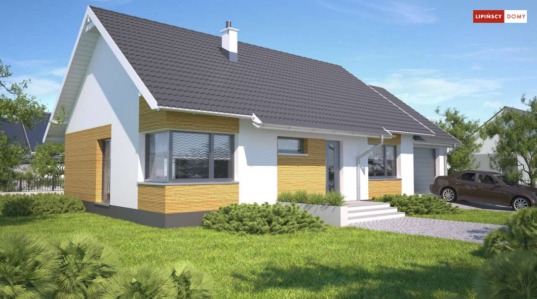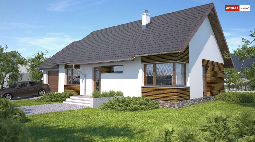 Projekt niedużego domku o przykuwającej uwagę elewacji. Do dyspozycji mieszkańców jest przeszklony duży salon z kominkiem oraz zamknięta kuchnia. Atutem projektu jest także kotłownia z wyjściem na zewnątrz oraz garaż z przejściem bezpośrednio do domu. W tej wersji atutem jest też zwiększona poprzez zmianę kąta nachylenia dachu przestrzeń strychu.