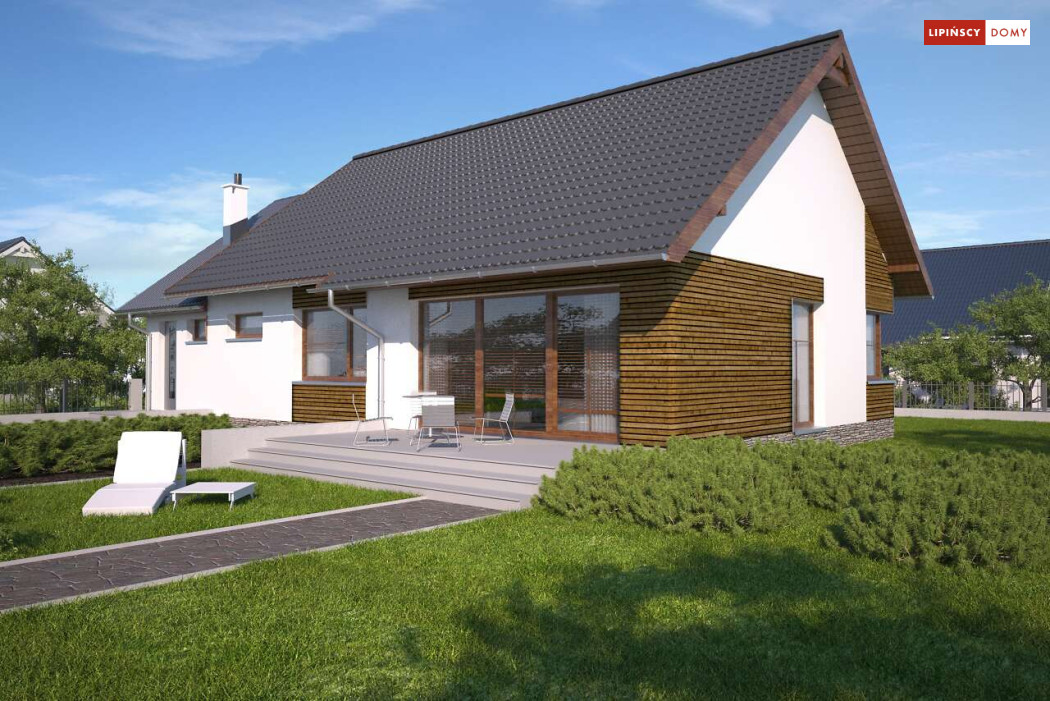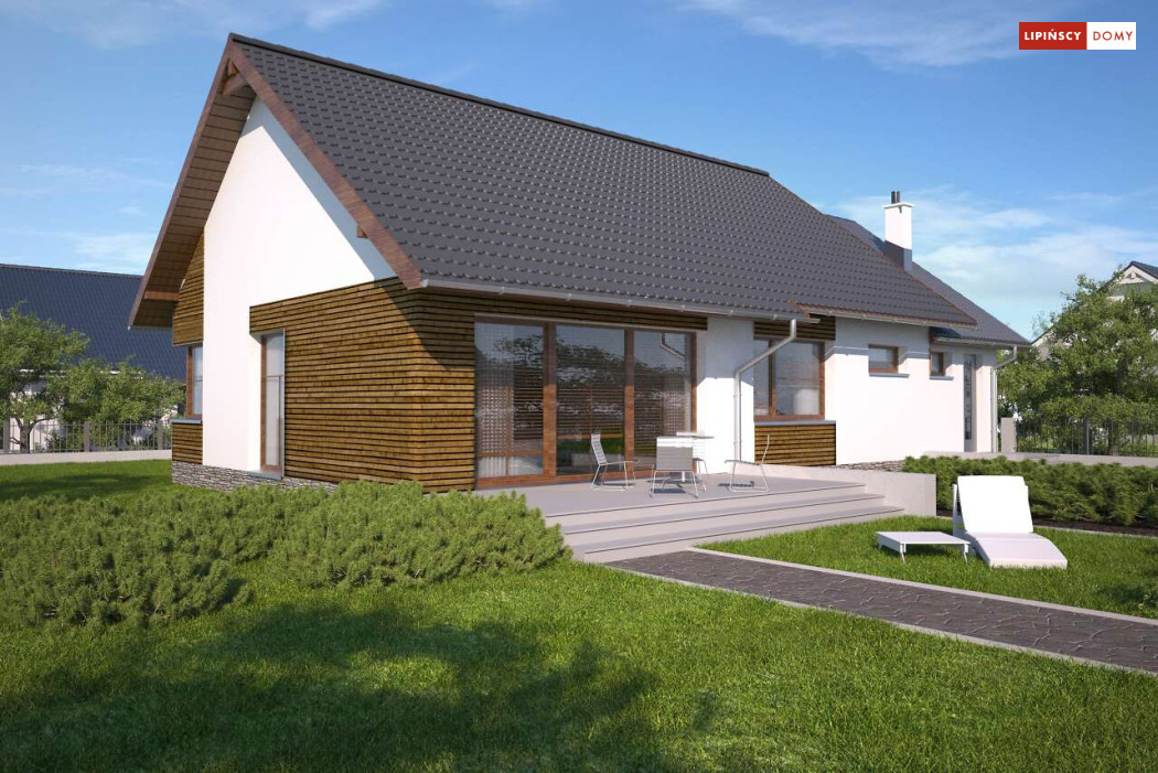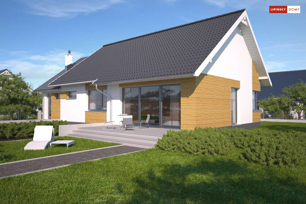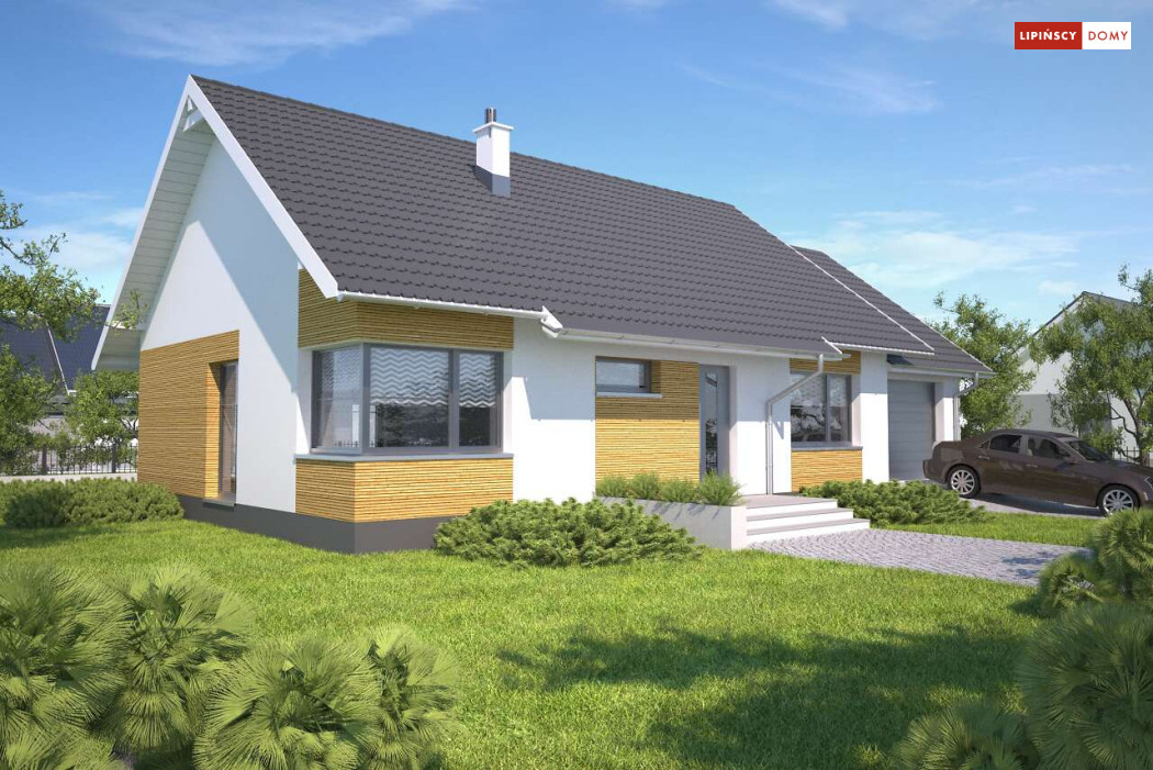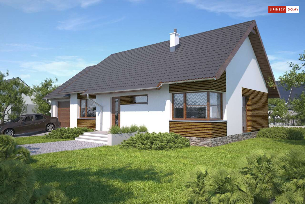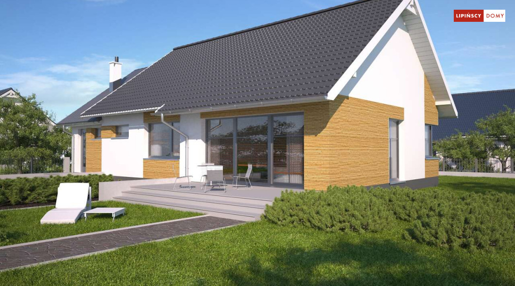 Projekt niedużego domku o przykuwającej uwagę elewacji. Do dyspozycji mieszkańców jest przeszklony duży salon z kominkiem oraz zamknięta kuchnia. Atutem projektu jest także kotłownia z wyjściem na zewnątrz oraz garaż z przejściem bezpośrednio do domu. W tej wersji atutem jest też zwiększona poprzez zmianę kąta nachylenia dachu przestrzeń strychu.