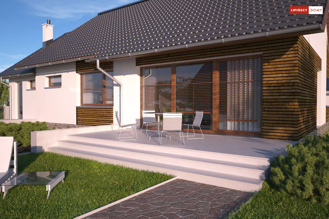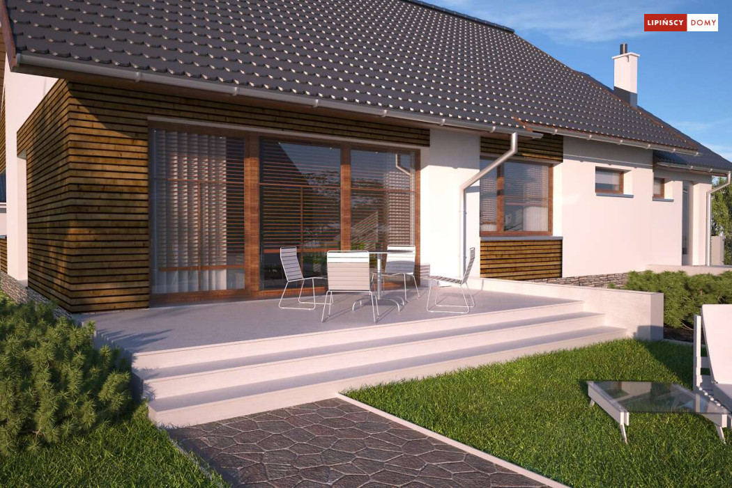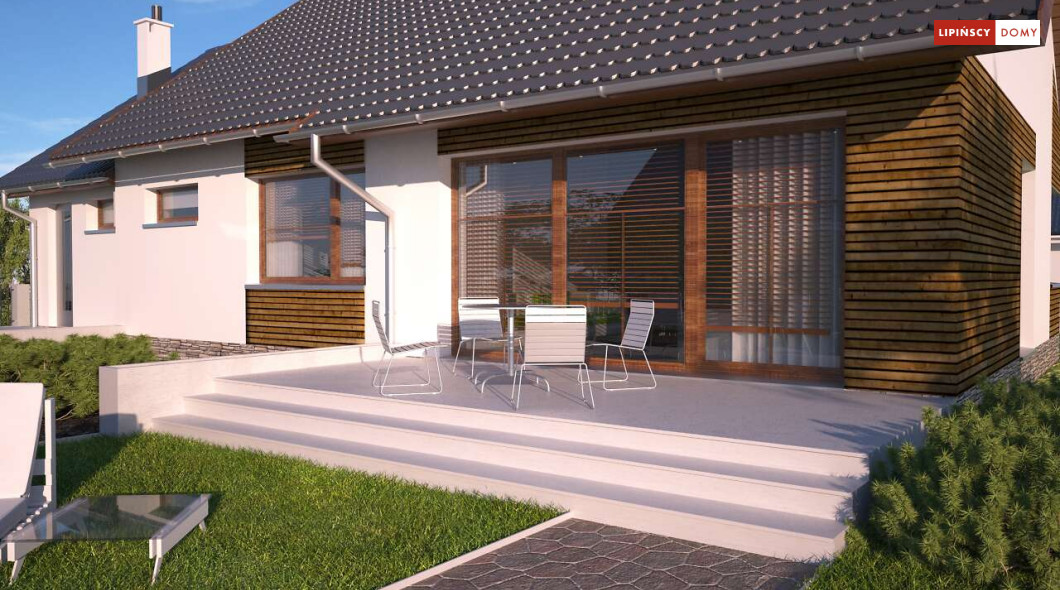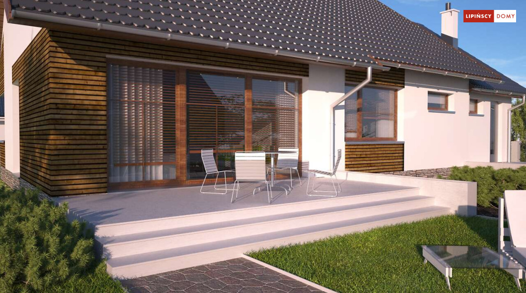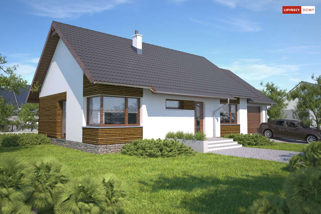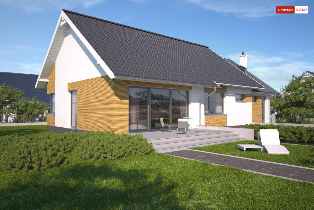Projekt niedużego domku o przykuwającej uwagę elewacji. Do dyspozycji mieszkańców jest przeszklony duży salon z kominkiem oraz zamknięta kuchnia. Atutem projektu jest także kotłownia z wyjściem na zewnątrz oraz garaż z przejściem bezpośrednio do domu. W tej wersji atutem jest też zwiększona poprzez zmianę kąta nachylenia dachu przestrzeń strychu.