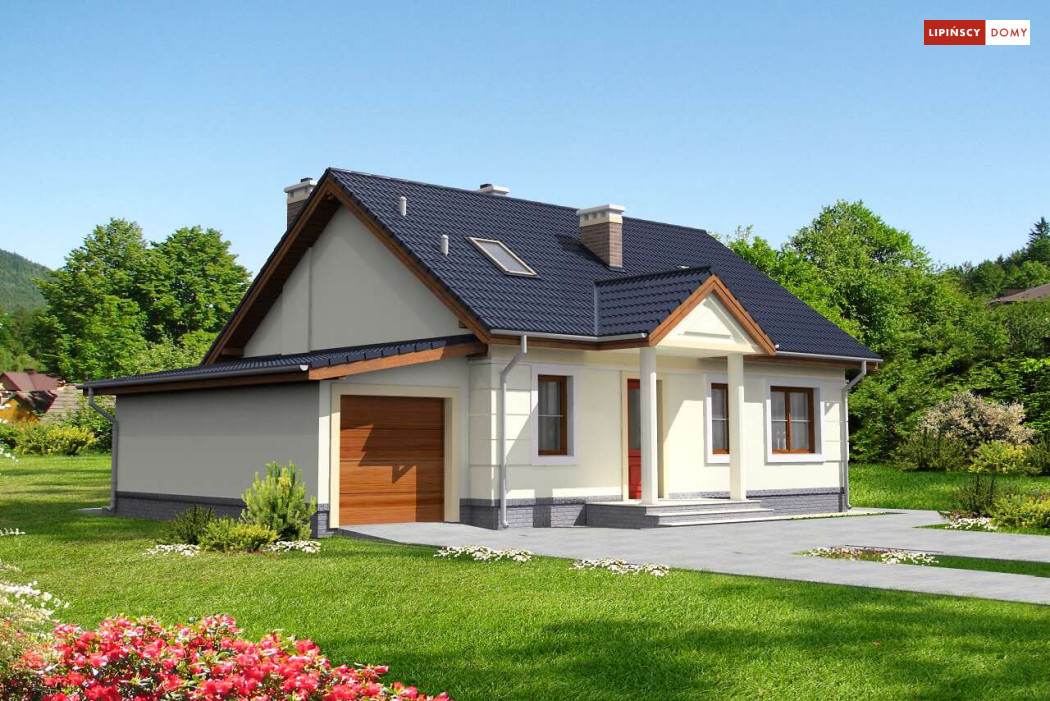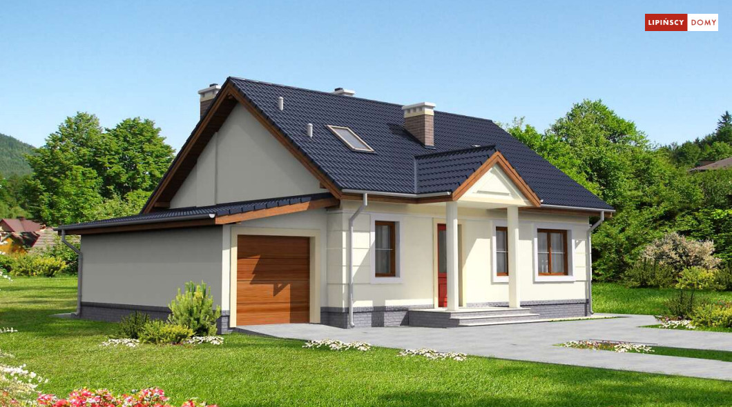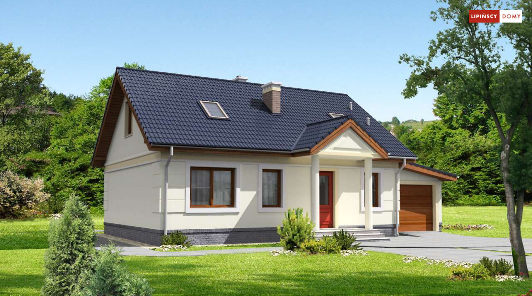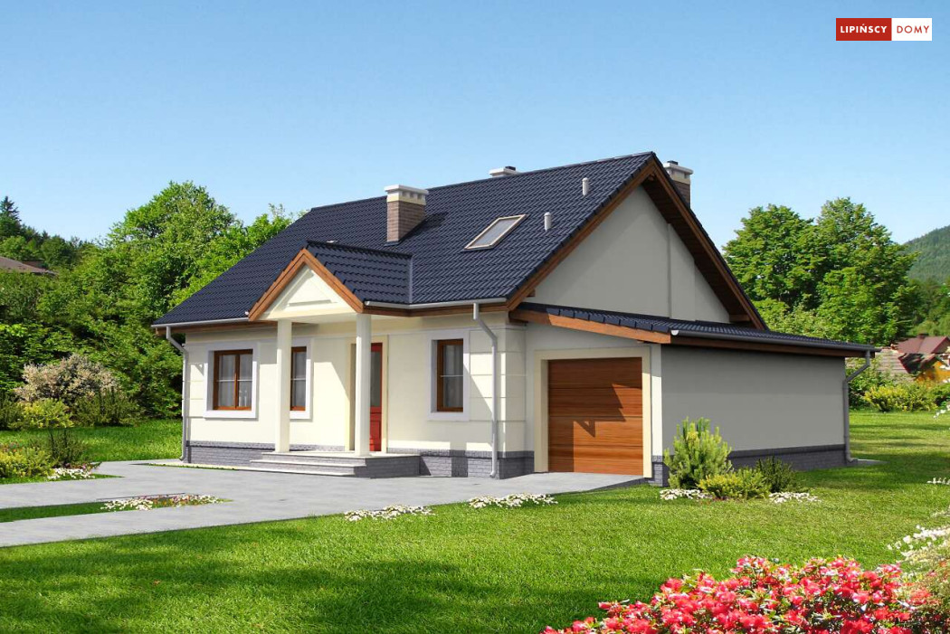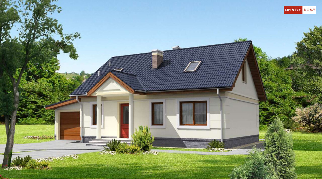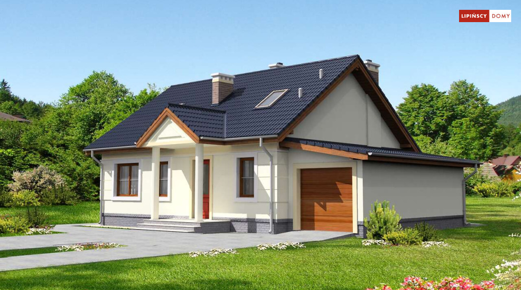 Uroczy projekt domku z garażem, w którym istnieje możliwość adaptacji poddasza. Schody przeniesiono z salonu do pomieszczenia obok wiatrołapu. Do dyspozycji mieszkańców są dwie ustawne sypialnie, częściowo zamknięta kuchnia oraz niezależna toaleta i łazienka. Atutem jest również duża kotłownia i przestronny salon z tarasem. Strych można zaaranżować według własnych potrzeb.