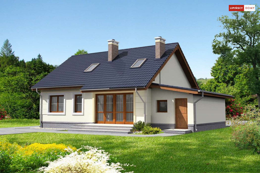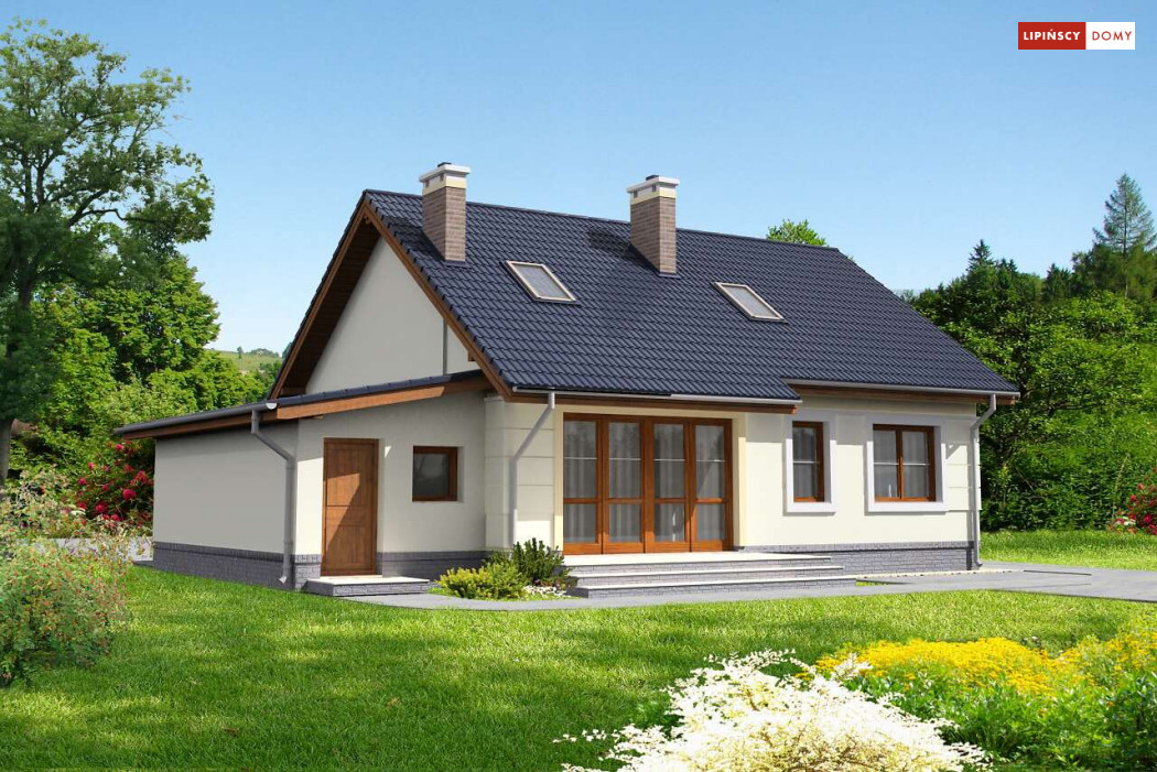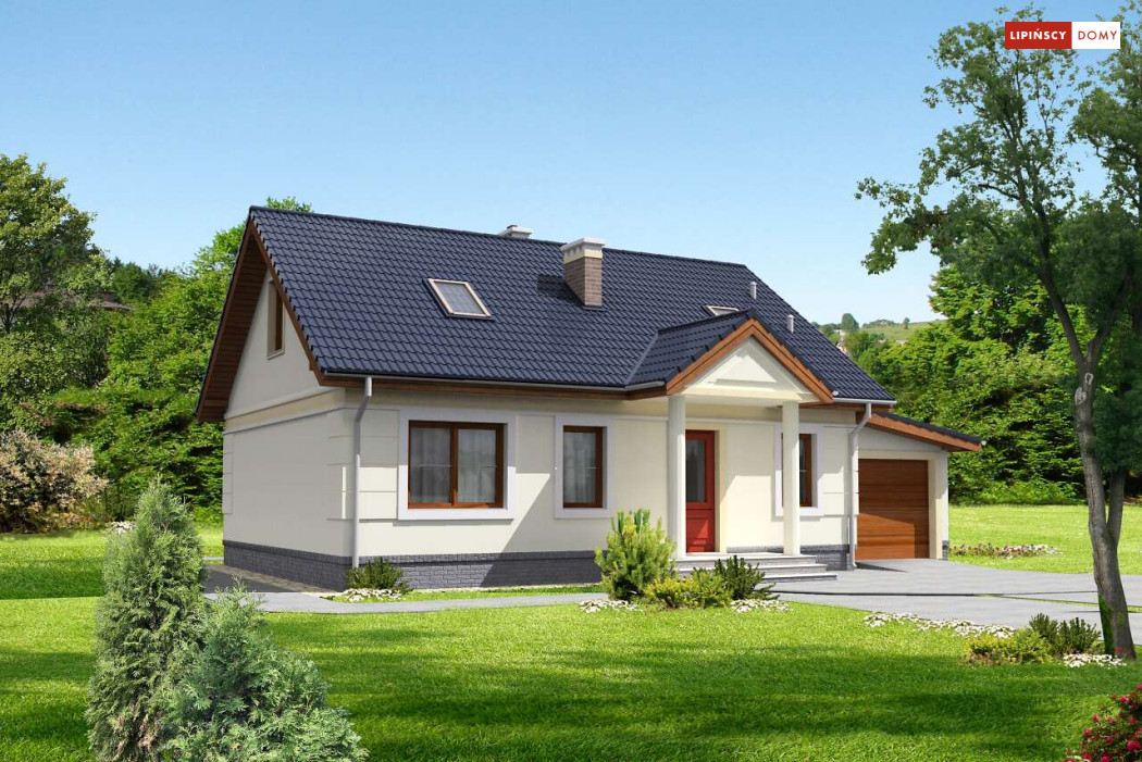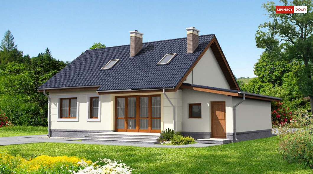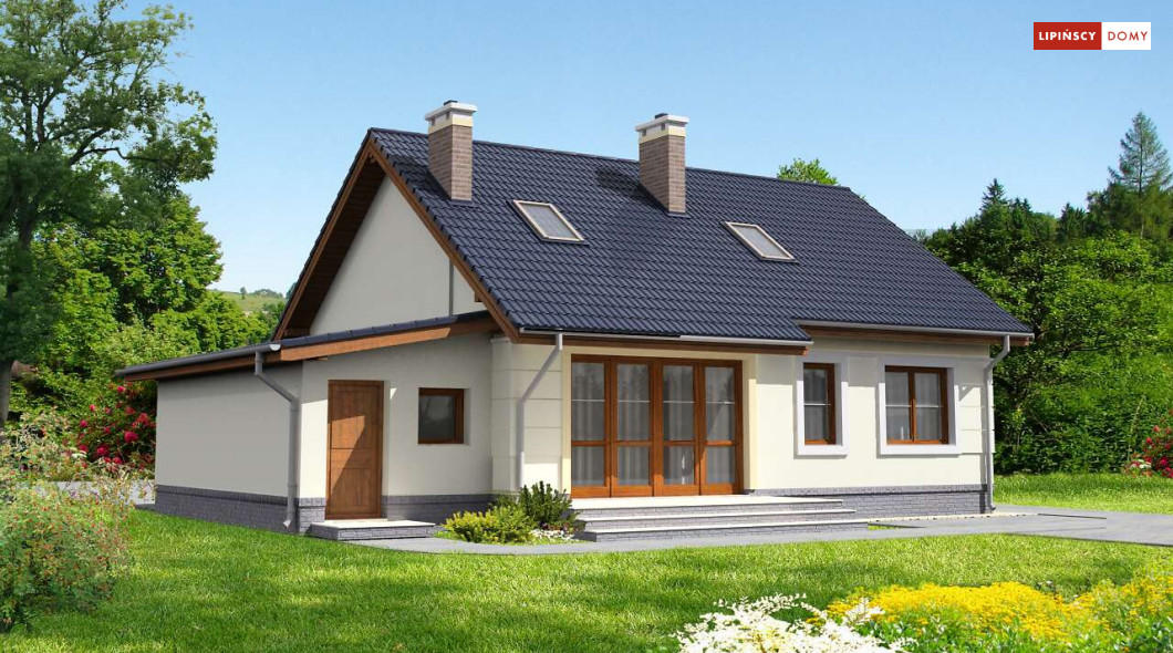 Uroczy projekt domku z garażem, w którym istnieje możliwość adaptacji poddasza. Schody przeniesiono z salonu do pomieszczenia obok wiatrołapu. Do dyspozycji mieszkańców są dwie ustawne sypialnie, częściowo zamknięta kuchnia oraz niezależna toaleta i łazienka. Atutem jest również duża kotłownia i przestronny salon z tarasem. Strych można zaaranżować według własnych potrzeb.