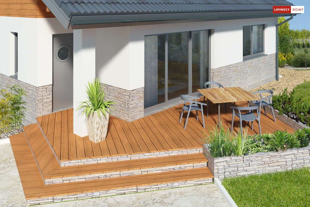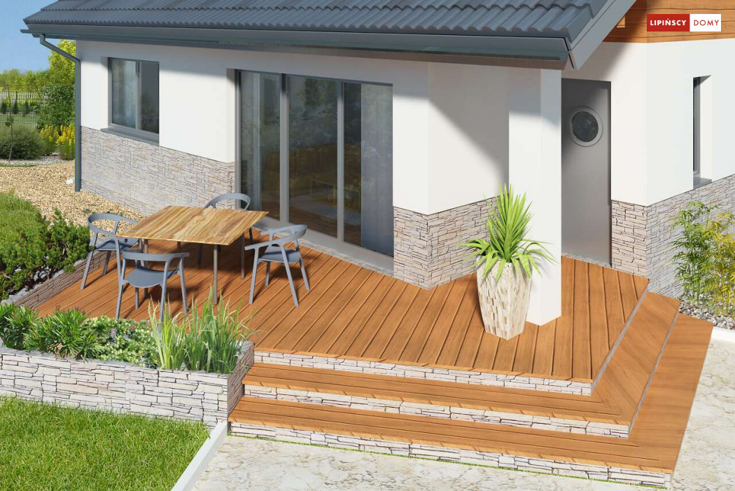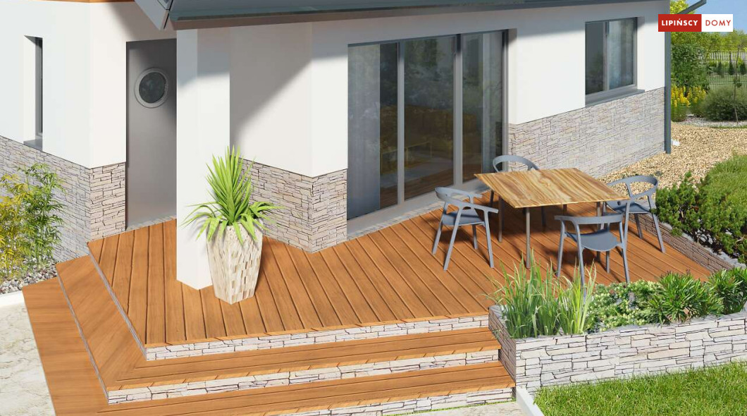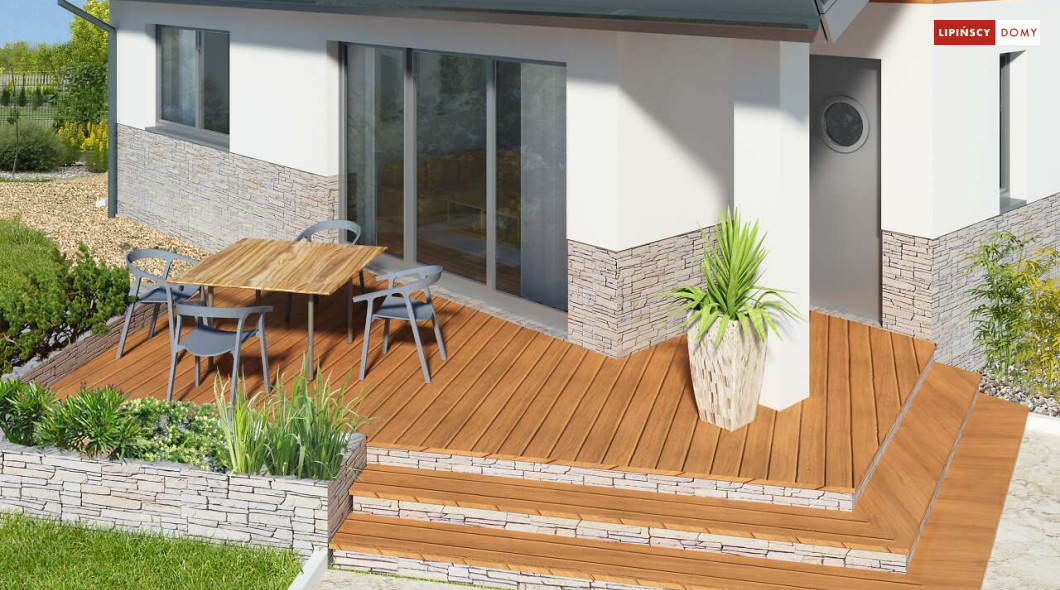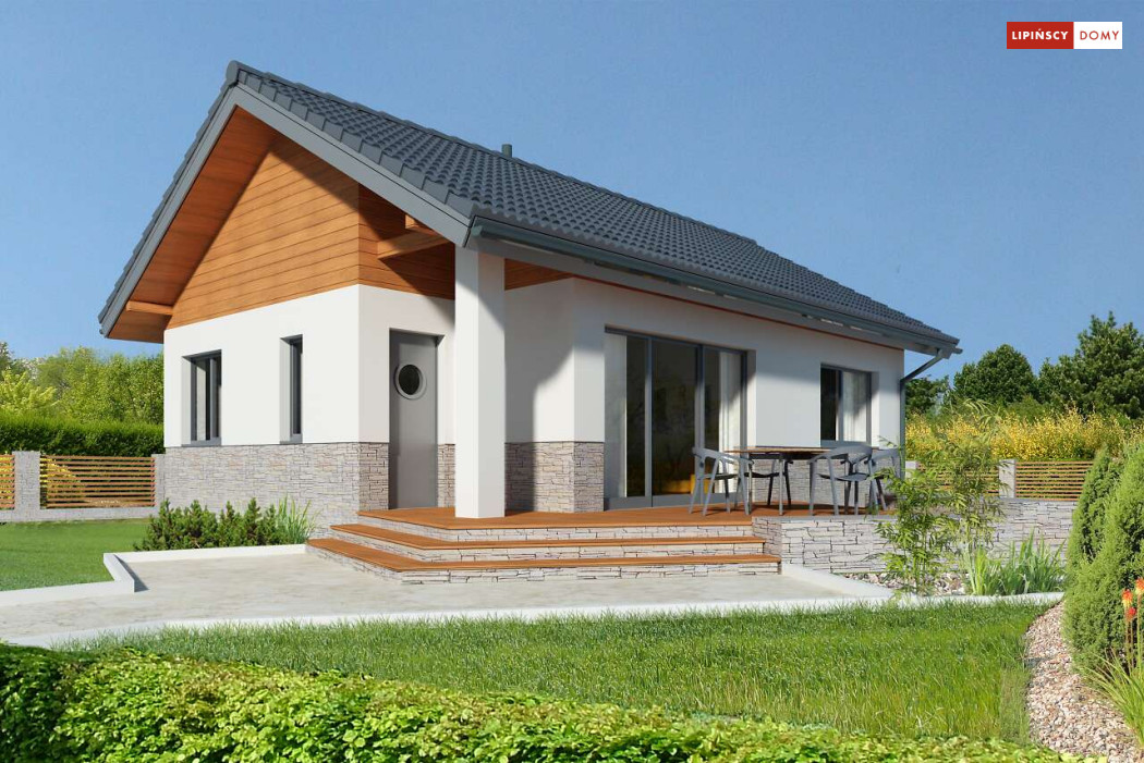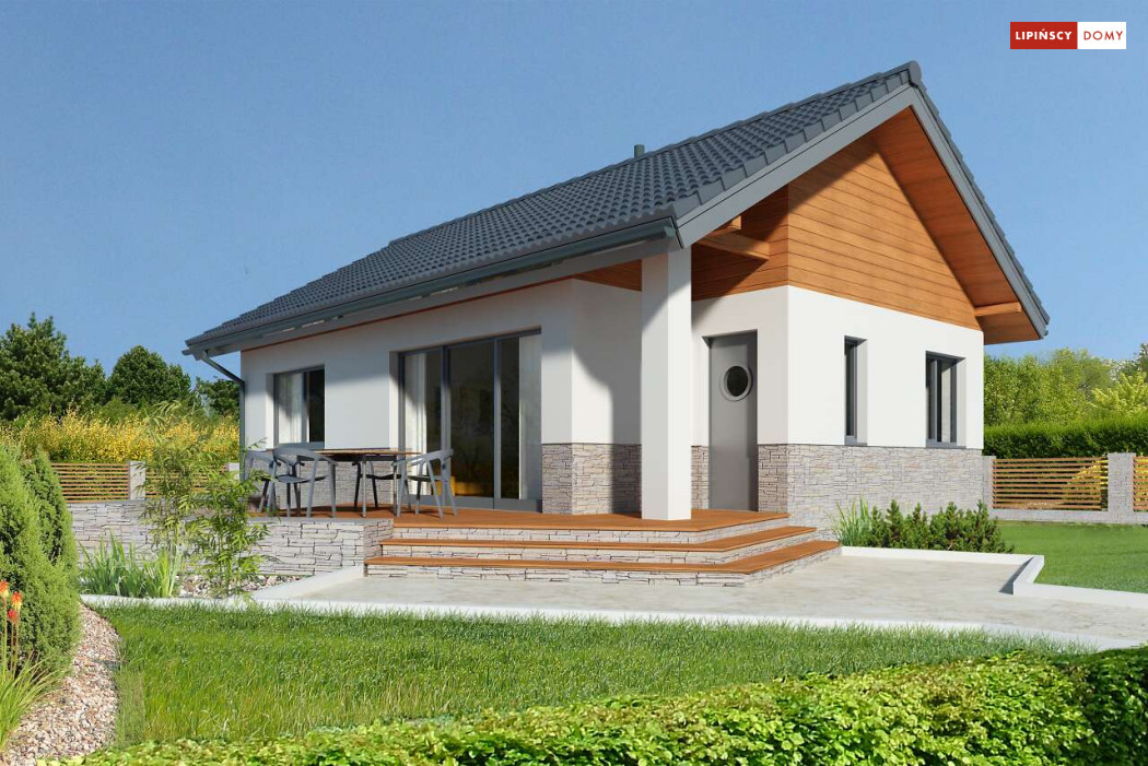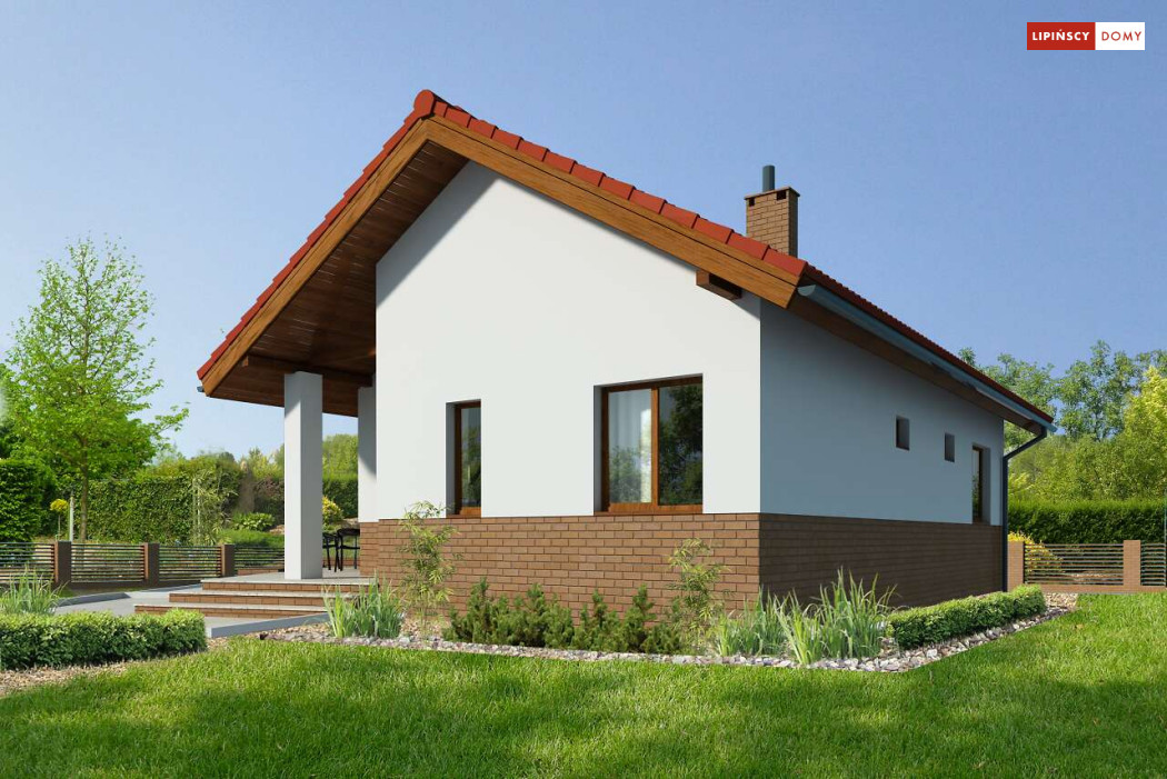 Kolejna odsłona popularnego projektu niewielkiego domku parterowego Lucca, bazująca na wersji B, w której okna narożne zastąpiono oknami zwykłymi. Ten mały, parterowy dom to doskonała propozycja dla Inwestorów, szukających domu taniego w budowie, a jednocześnie o funkcjonalnie zaplanowanym wnętrzu. Mieszkańcy mają do dyspozycji salon z kominkiem, dwie sypialnie, kuchnię, łazienkę i pomieszczenie gospodarcze. Ozdobą domu jest taras, na który można wyjść z salonu. Ciekawie zaaranżowane zadaszone wejście jest nie tylko praktyczne, ale również zdobi budynek.