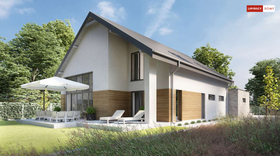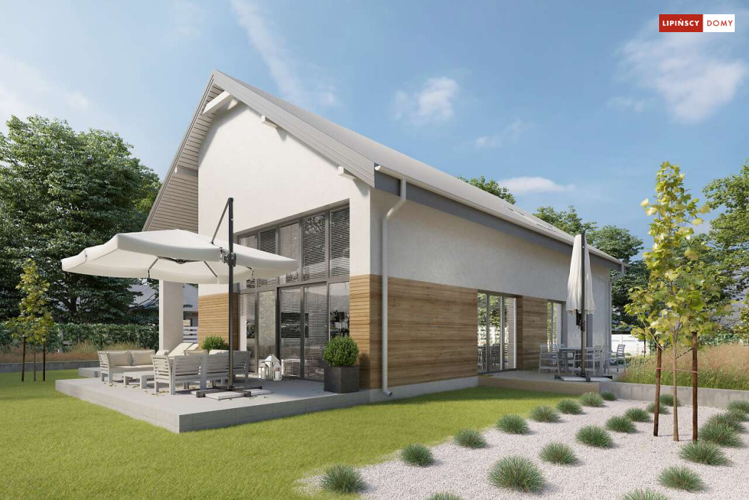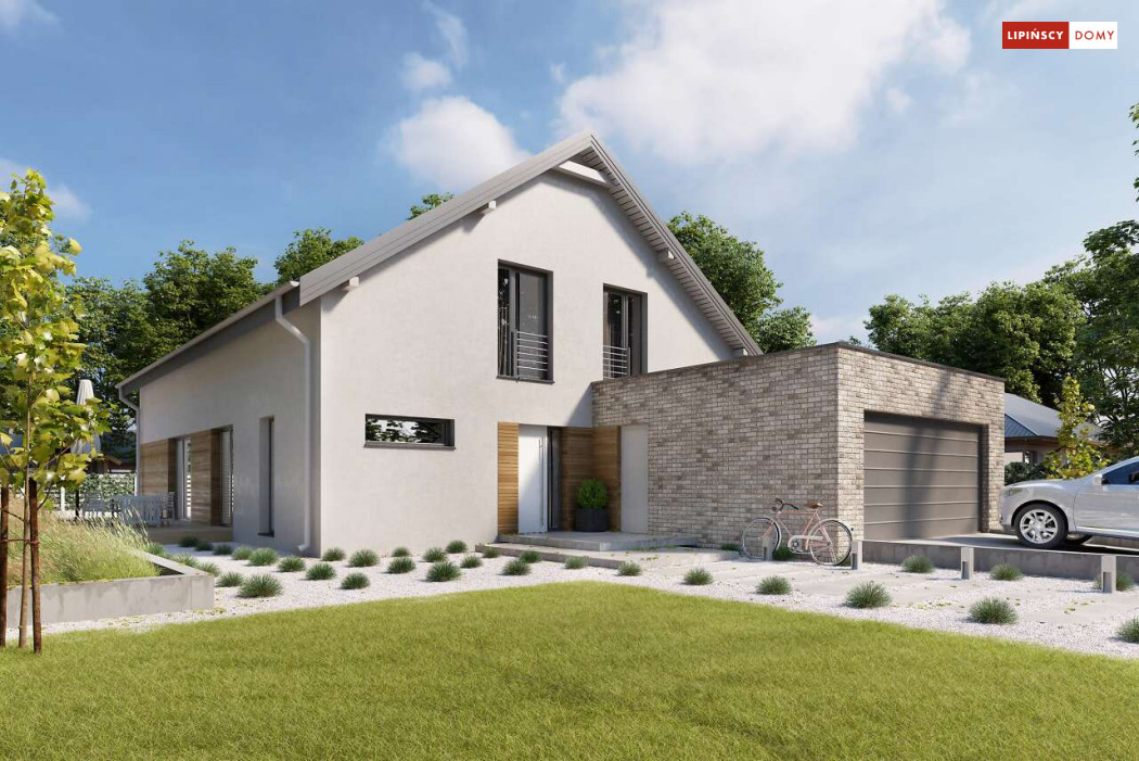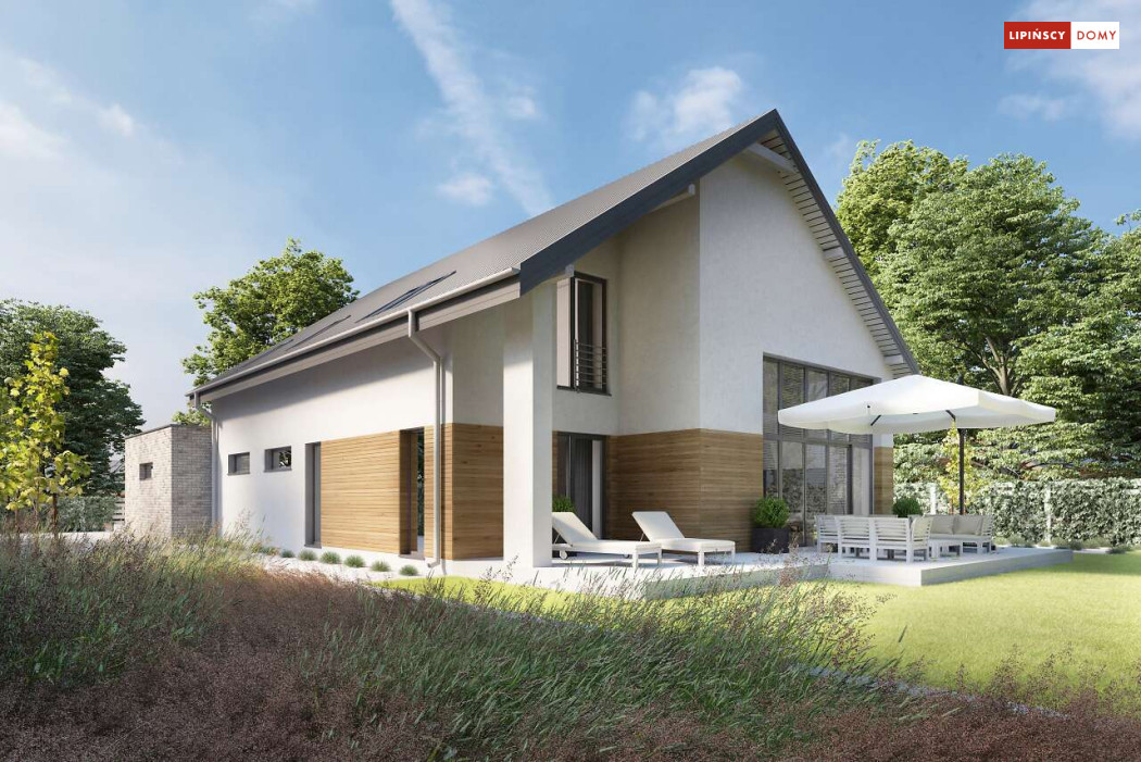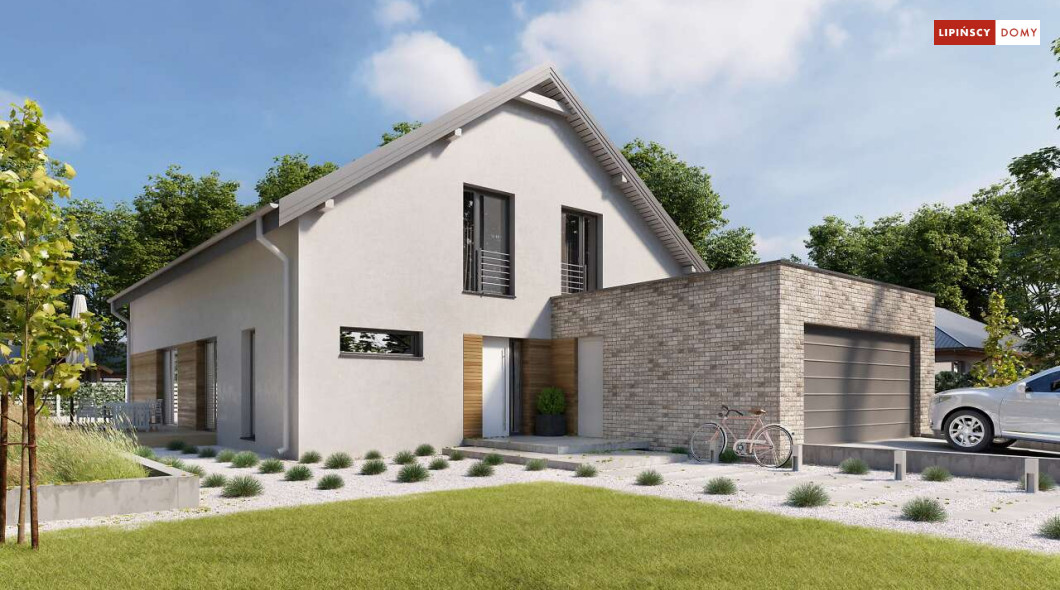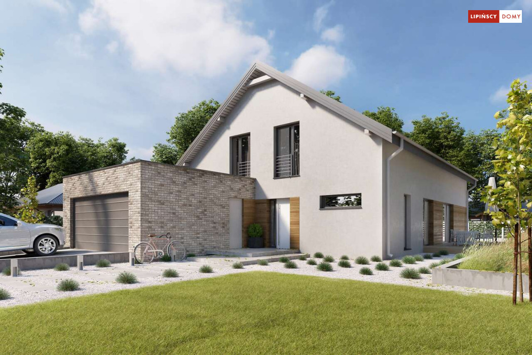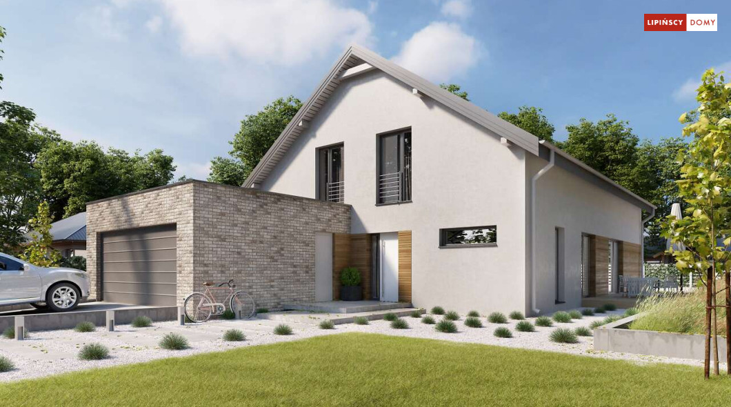Wygodny dom z użytkowym poddaszem, zaprojektowany w standardzie pasywnym. Projekt wyróżnia antresola nad salonem i jadalnią, która nie tylko nadaje wnętrzu przestronności, ale również wspaniale je doświetla. Wejście prowadzi do wygodnego wiatrołapu, z jednej jego strony znajduje się gabinet, z drugiej zaś, wygodna część gospodarcza i wc. Centralnym punktem domu jest salon i granicząca z nim wygodna kuchnia. Dzięki zlokalizowaniu tej części od frontu, dom doskonale sprawdza się na działce z wjazdem od południa. Na parterze wydzielono także zaciszną sypialnię z łazienką i garderobą. Poddasze zajmują dwie wygodne sypialnie, łazienka oraz część wypoczynkowa. W bryłę budynku wkomponowano garaż na jedno stanowisko.