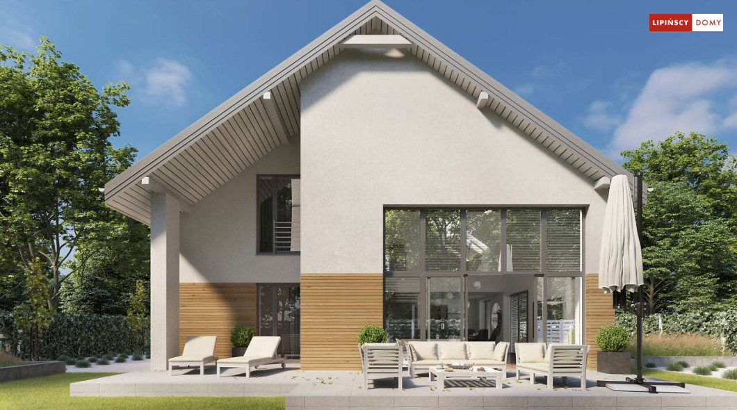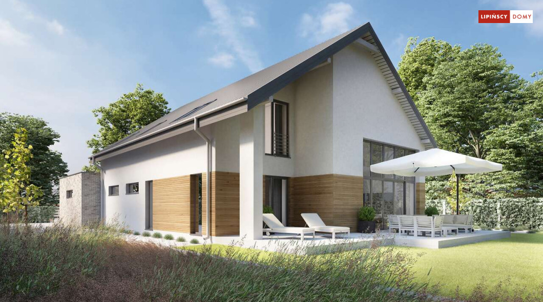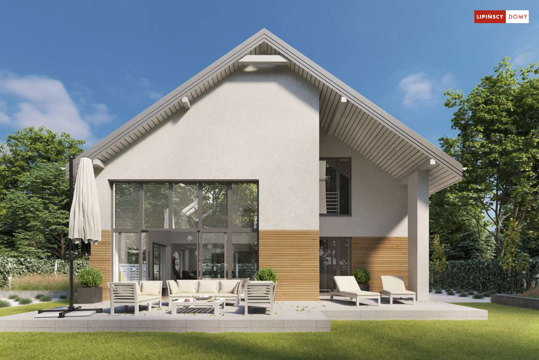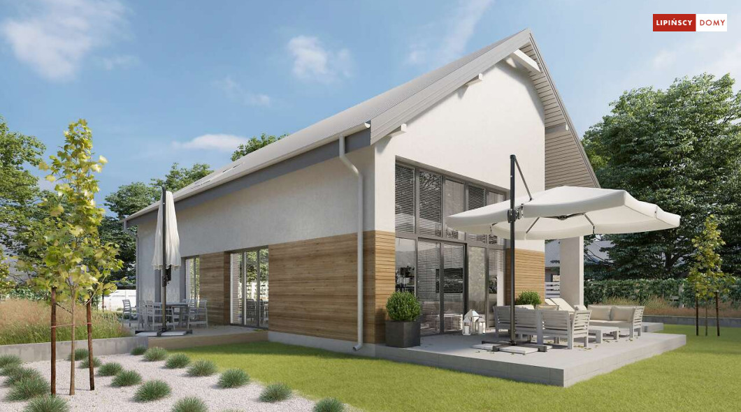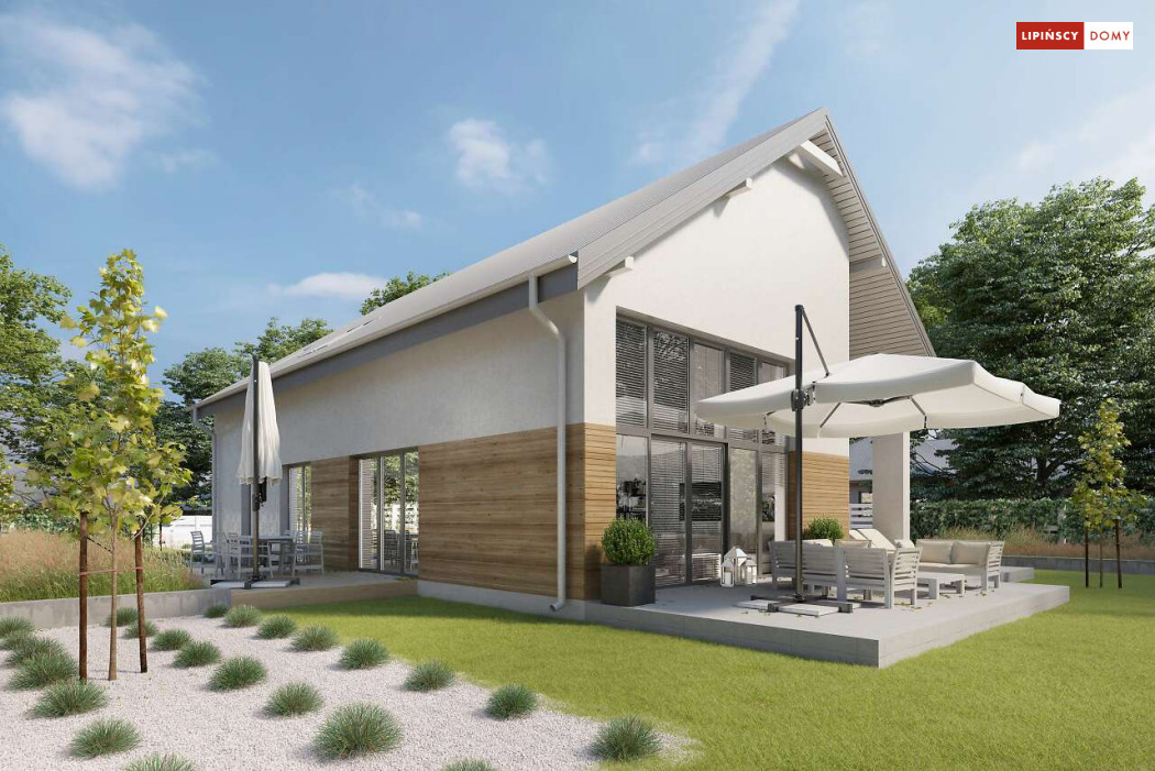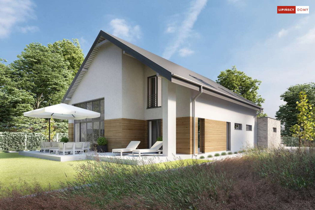 Wygodny dom z użytkowym poddaszem, zaprojektowany w standardzie pasywnym. Projekt wyróżnia antresola nad salonem i jadalnią, która nie tylko nadaje wnętrzu przestronności, ale również wspaniale je doświetla. Wejście prowadzi do wygodnego wiatrołapu, z jednej jego strony znajduje się gabinet, z drugiej zaś, wygodna część gospodarcza i wc. Centralnym punktem domu jest salon i granicząca z nim wygodna kuchnia. Dzięki zlokalizowaniu tej części od frontu, dom doskonale sprawdza się na działce z wjazdem od południa. Na parterze wydzielono także zaciszną sypialnię z łazienką i garderobą. Poddasze zajmują dwie wygodne sypialnie, łazienka oraz część wypoczynkowa. W bryłę budynku wkomponowano garaż na jedno stanowisko.