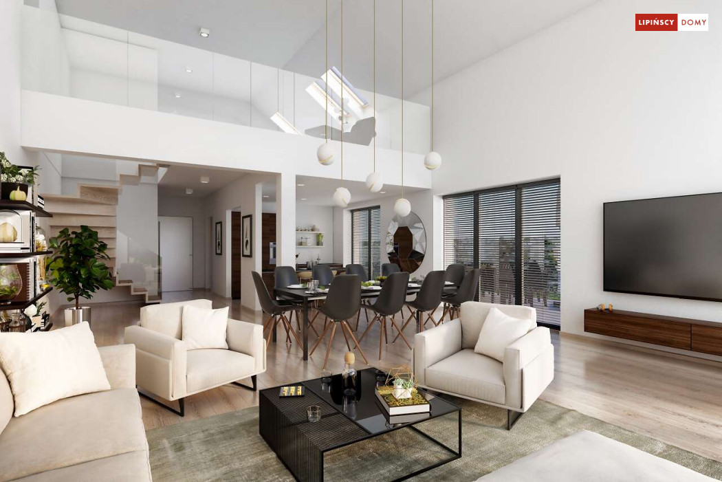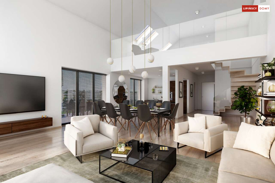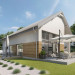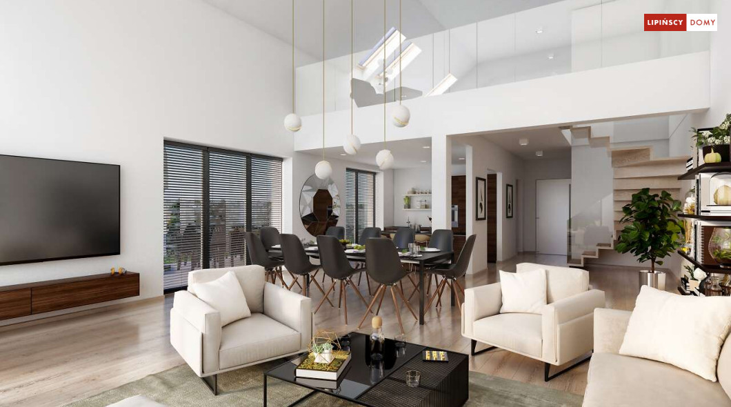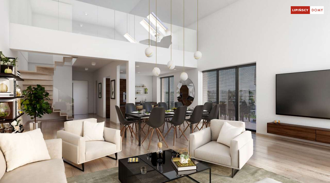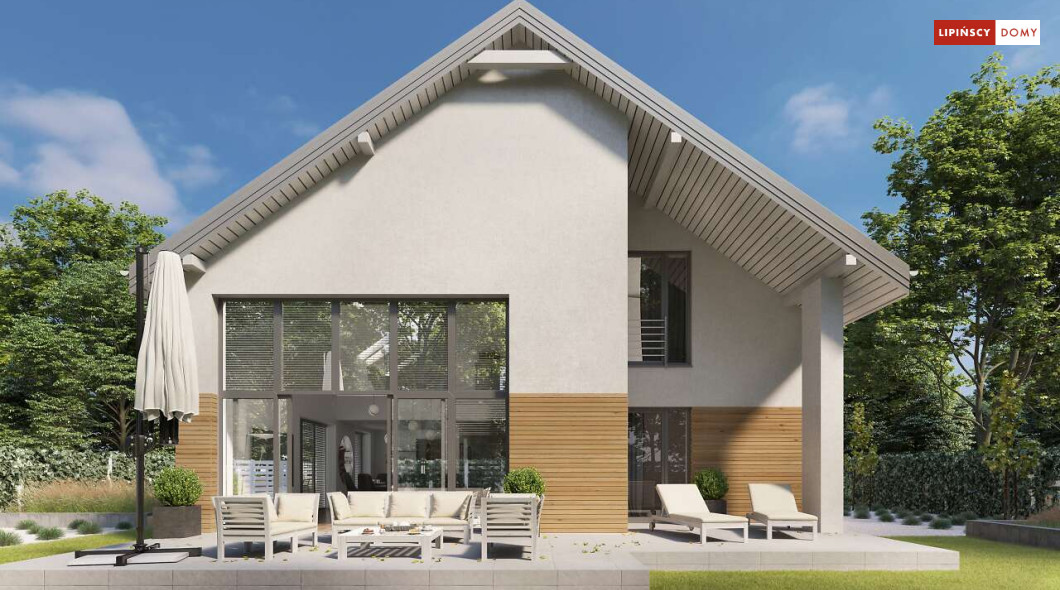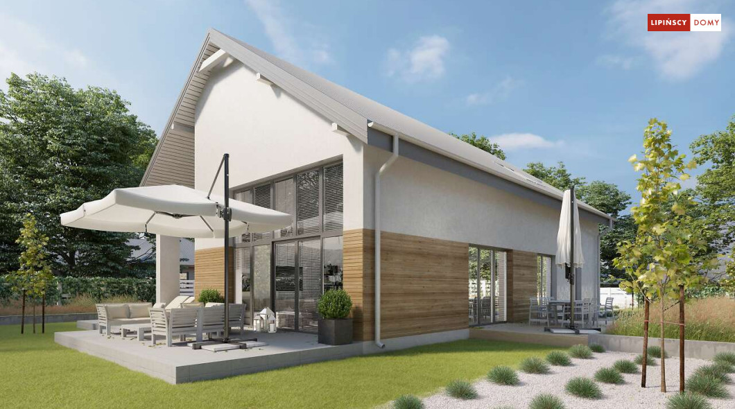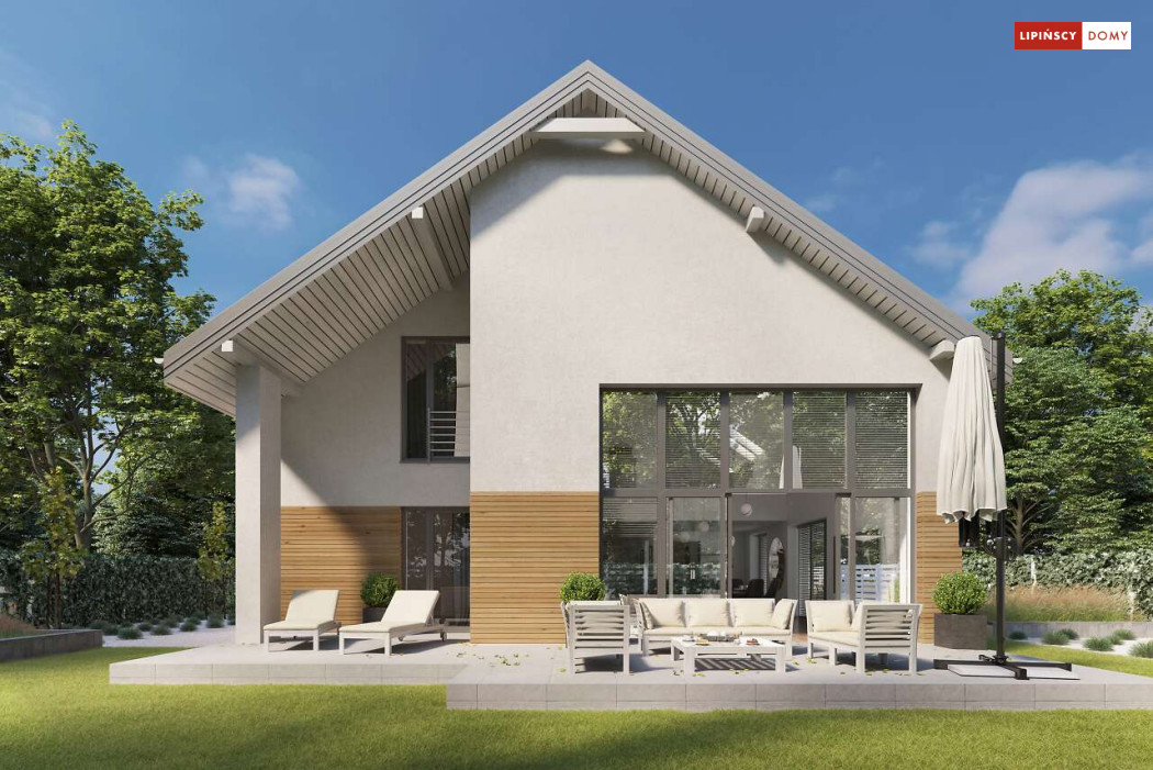 Wygodny dom z użytkowym poddaszem, zaprojektowany w standardzie pasywnym. Projekt wyróżnia antresola nad salonem i jadalnią, która nie tylko nadaje wnętrzu przestronności, ale również wspaniale je doświetla. Wejście prowadzi do wygodnego wiatrołapu, z jednej jego strony znajduje się gabinet, z drugiej zaś, wygodna część gospodarcza i wc. Centralnym punktem domu jest salon i granicząca z nim wygodna kuchnia. Dzięki zlokalizowaniu tej części od frontu, dom doskonale sprawdza się na działce z wjazdem od południa. Na parterze wydzielono także zaciszną sypialnię z łazienką i garderobą. Poddasze zajmują dwie wygodne sypialnie, łazienka oraz część wypoczynkowa. W bryłę budynku wkomponowano garaż na jedno stanowisko.