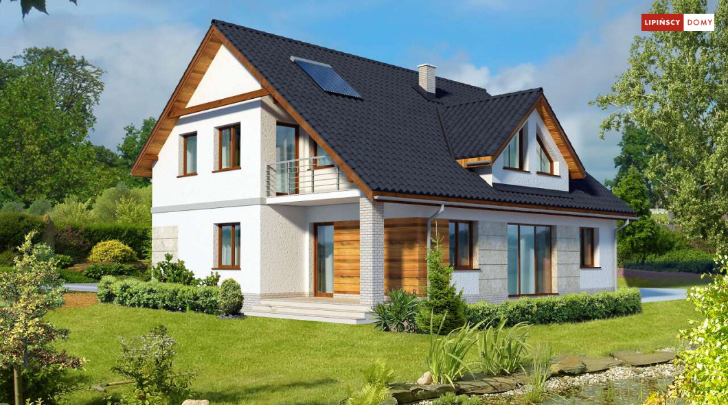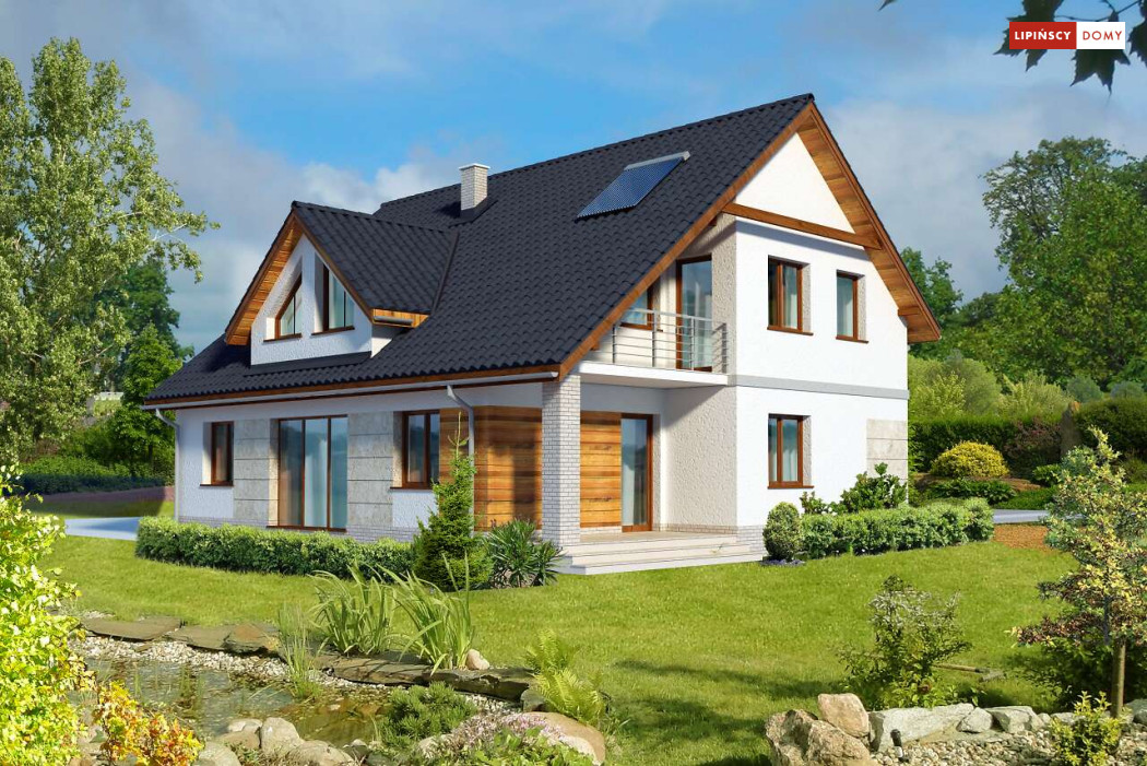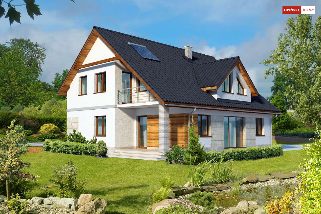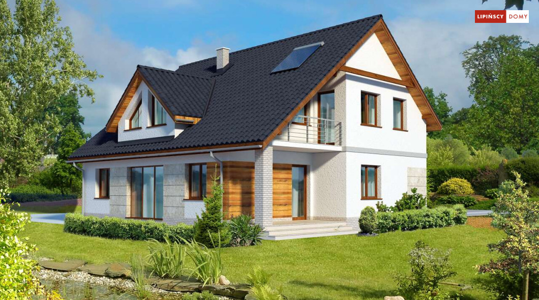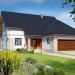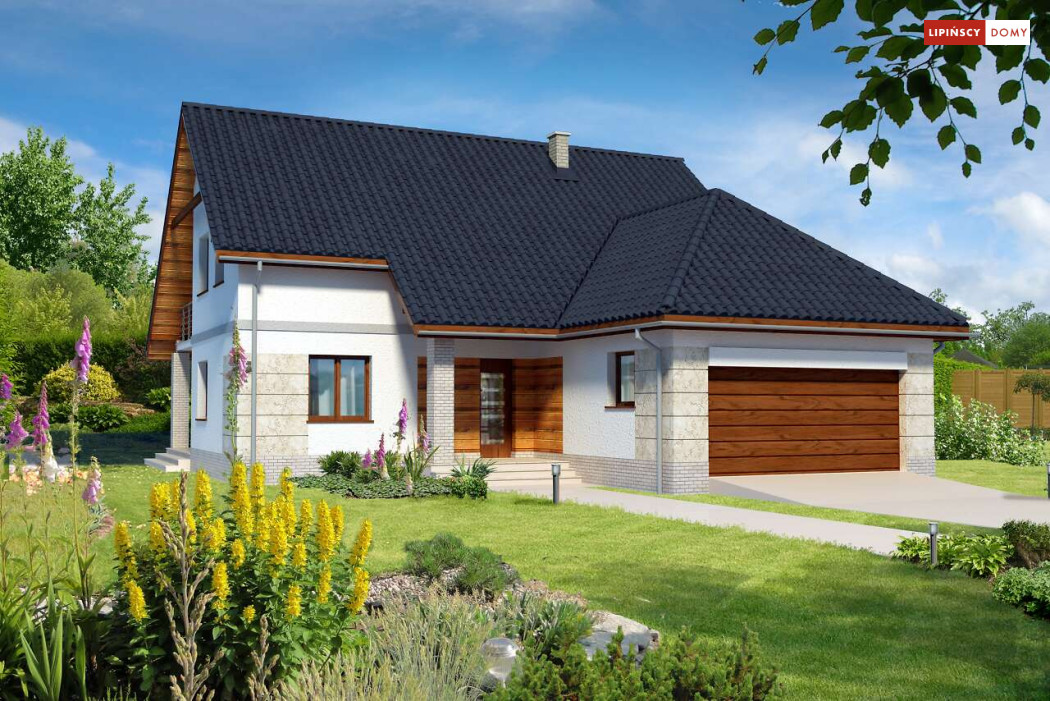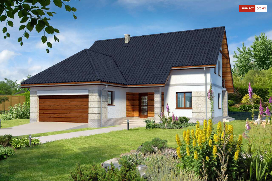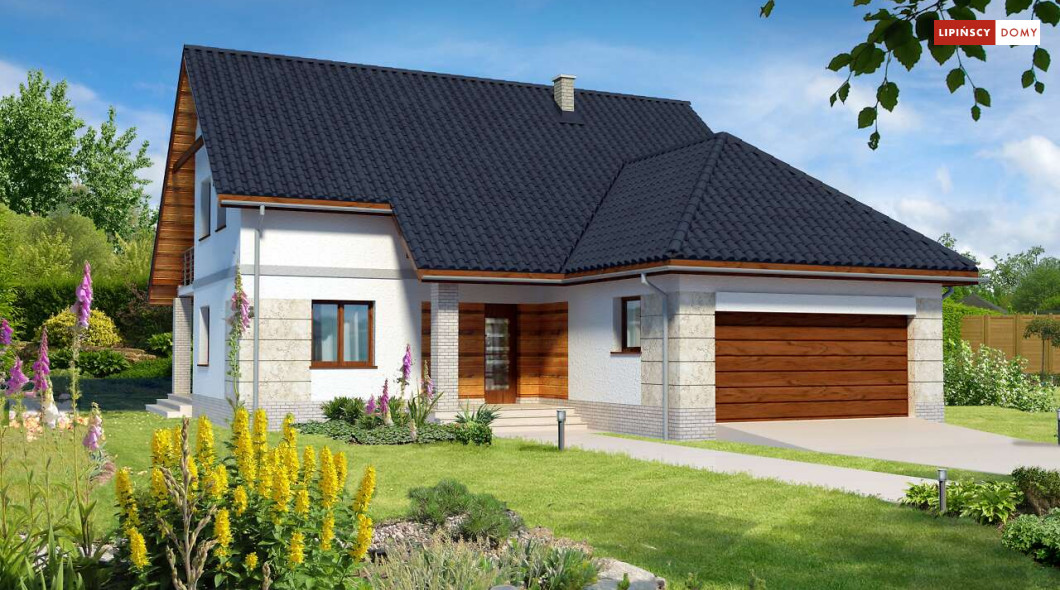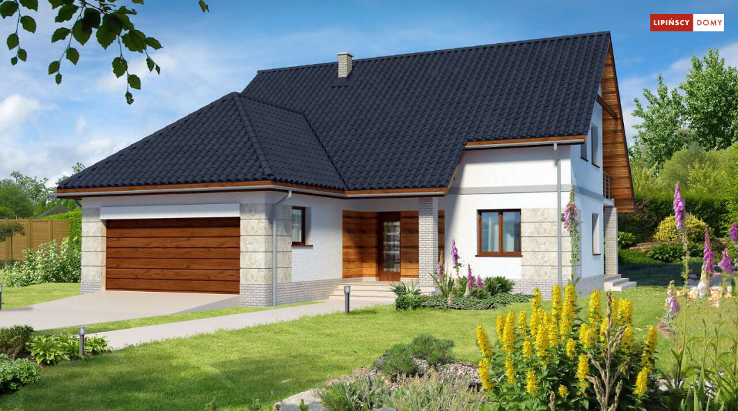 Dom z garażem dwustanowiskowym na stosunkowo wąską działkę. We wnętrzu odnajdziemy bogaty program funkcjonalny z dwiema sypialniami na parterze, a trzema na poddaszu, dużą kuchnię z jadalnią i spiżarnią, a salon otwiera się na ogród i zadaszony taras. Na poddaszu z jednej z sypialni można przejść przez garderobę do własnej łazienki. Dwie pozostałe mają bliźniaczy kształt i dzięki temu, że są bardzo duże, idealnie nadają się dla dzieci, które potrzebują sporo miejsca do zabawy, nauki i snu.