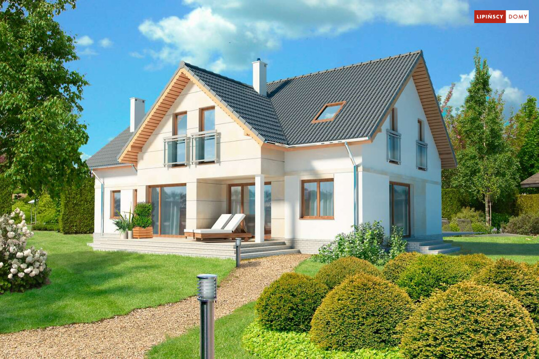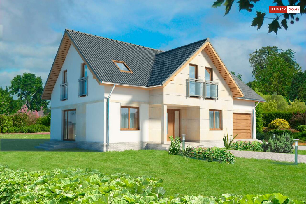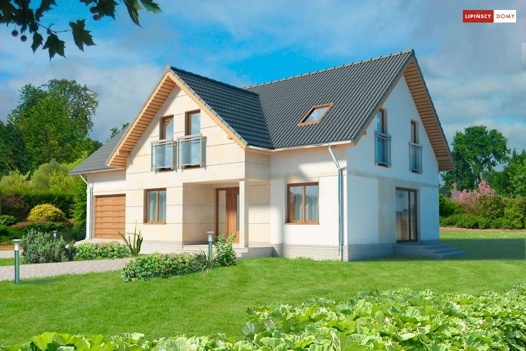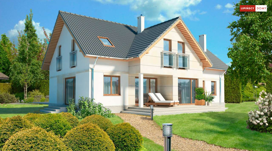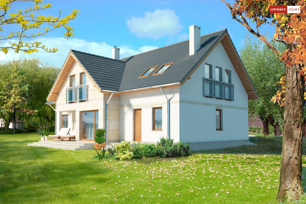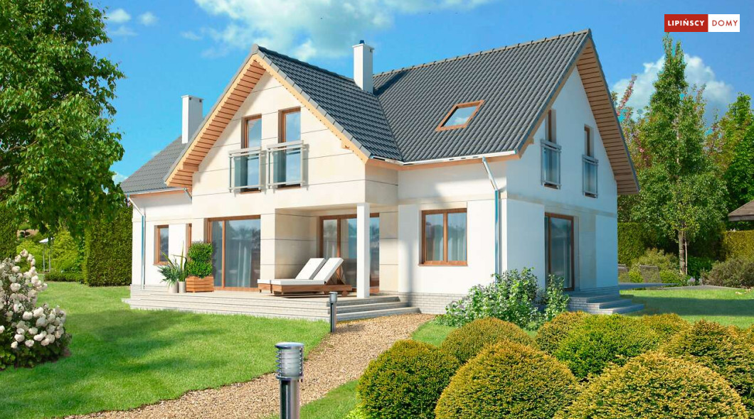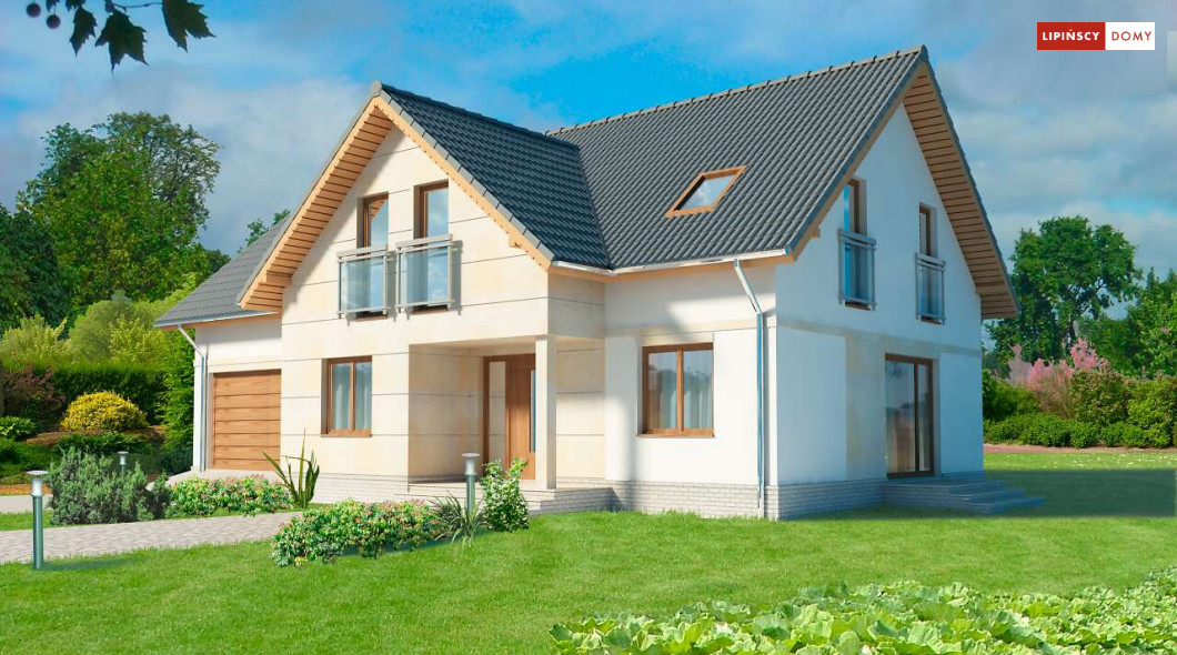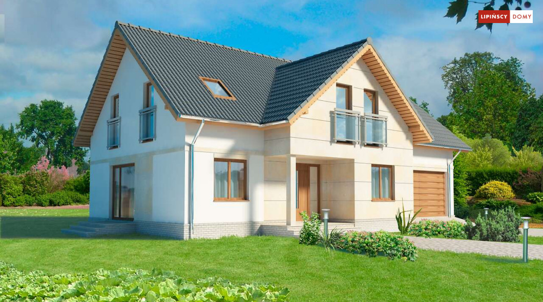 Projekt domu z poddaszem użytkowym i garażem. Pomimo sporej powierzchni dom ten wygląda zgrabnie i nie przytłacza. Zawdzięcza to przede wszystkim zwartej bryle i jasnym, nowoczesnym w wyrazie elewacjom. Wnętrza zaprojektowane są niezwykle funkcjonalnie, z maksymalnym wykorzystaniem powierzchni. Na parterze zaplanowano przestronną część dzienną złożoną z salonu z kominkiem i kuchni, dodatkowego pokoju oraz łazienki. Dwustanowiskowy garaż znajduje się w bryle domu pod jednym dachem, a duże pomieszczenie gospodarcze z tyłu za nim pozwala na zastosowanie dowolnego systemu ogrzewania i oferuje jeszcze przestrzeń do przechowywania. Tuż przy wejściu zlokalizowano pojemną garderobę , która łączy wnętrze domu z garażem. Poddasze to strefa nocna z pięcioma sypialniami, dużą łazienką, a w części nad garażem – sypialnią małżeńską z garderobą i łazienką.<br>