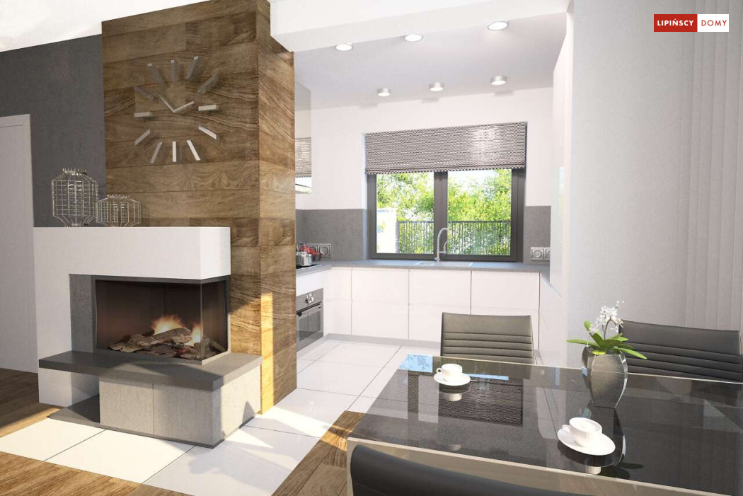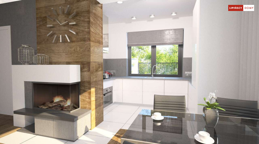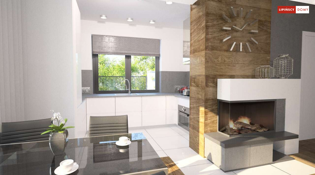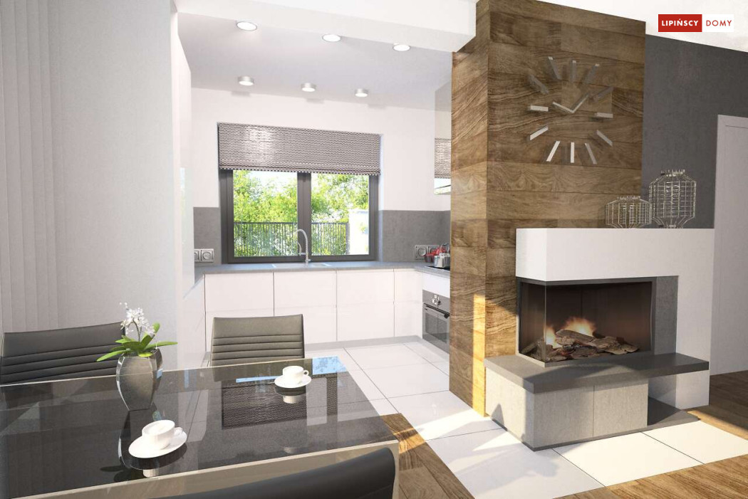 Elegancki dom z użytkowym poddaszem, który poprzez proste rozwiązania gwarantuje niskie koszty wykonania. Ciekawy detal wykończenia elewacji dodaje budynkowi charakteru. Do wnętrza zaprasza duży hall z widokiem na schody i salon z kominkiem. Nieco wydzielony został dodatkowy pokój z łazienką. Ze sporej kotłowni prowadzi niezależne wyjście na zewnątrz, co pozwala na zastosowanie kotła c.o. na paliwo stałe. Dwie duże sypialnie na poddaszu mają własne garderoby, a wygodna łazienka pomieści zarówno wannę narożnikową, jak i prysznic. Takie rozplanowanie strefy prywatnej zapewnia domownikom komfort przy zachowaniu niezbędnej intymności.