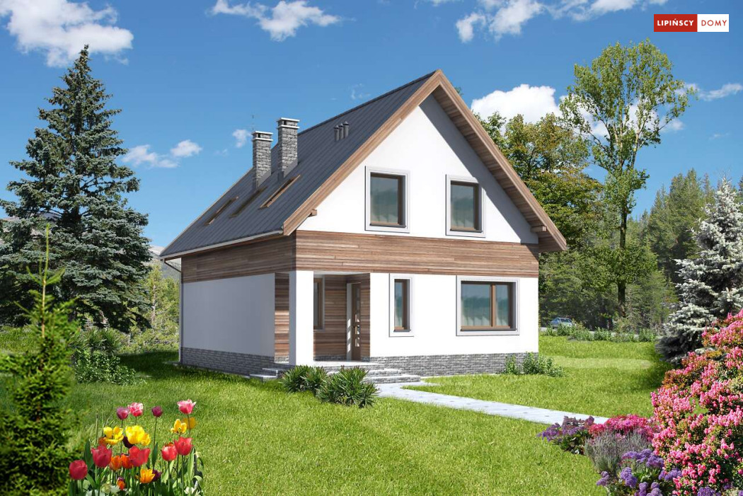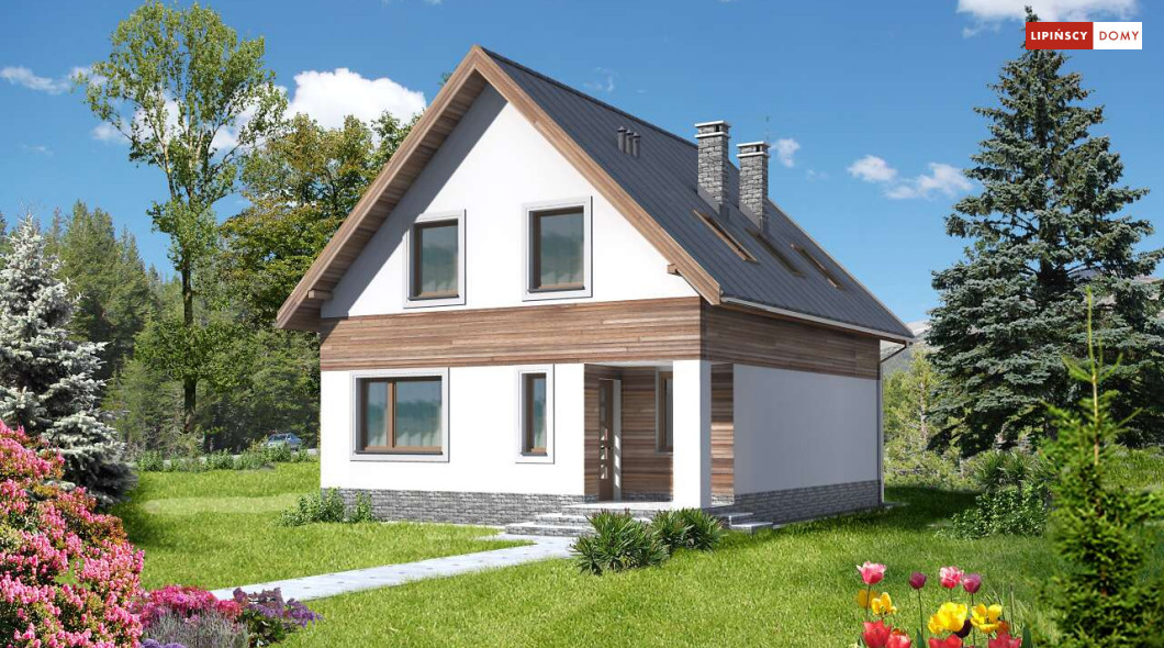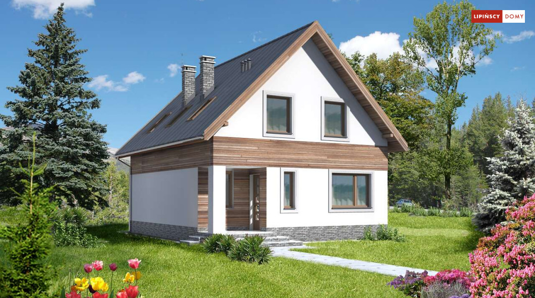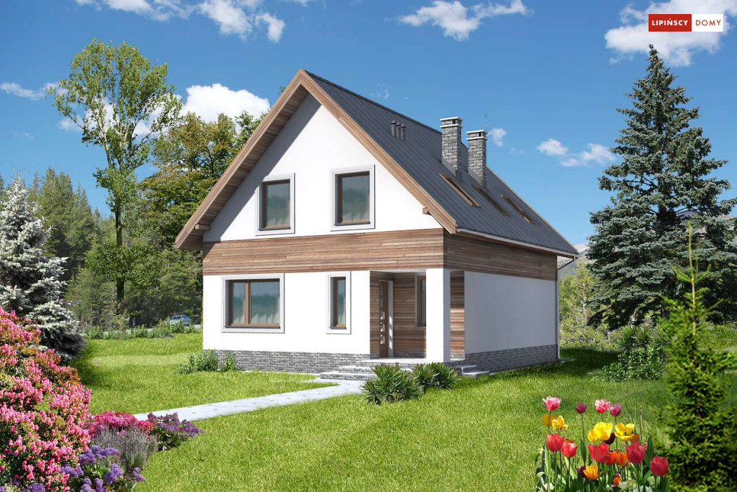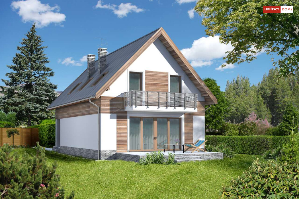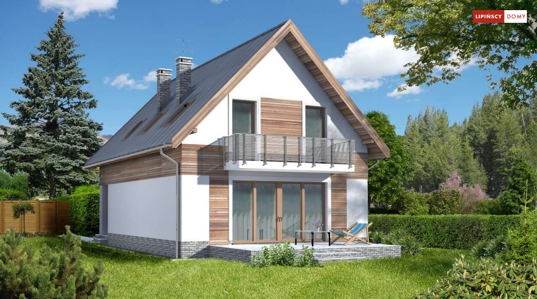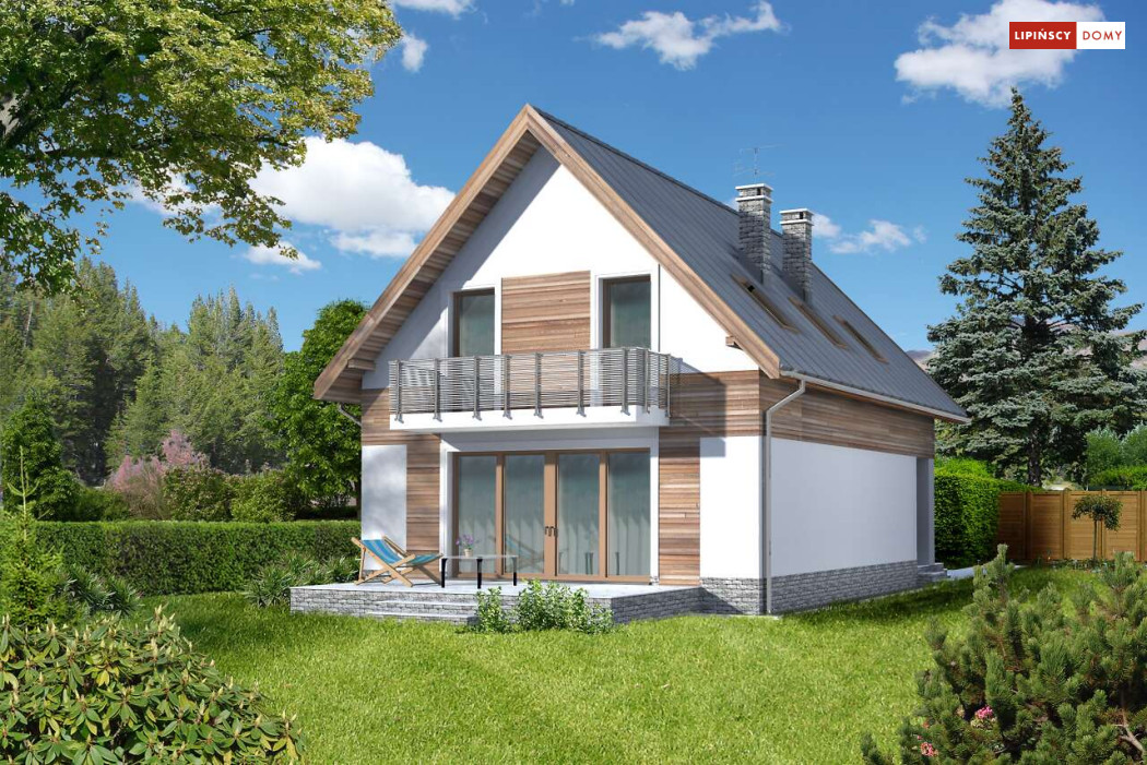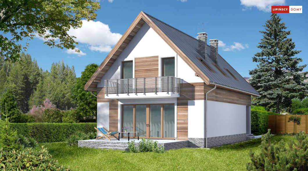 Prosta bryła i dwuspadowy dach sprawiają, że jest to dom niedrogi w realizacji. Doskonale rozplanowana przestrzeń, wyraźny podział stref na dzienną oraz nocną, dwie duże łazienki oraz dodatkowo wc, a także pom. gosp. i garderoba wpływają znacznie na komfort użytkowania domu. W projekcie przewidziano duży salon z kominkiem, z miejscem na duży stół i z wyjściem na taras. Dzięki zastosowaniu dużych przeszklonych drzwi i otwartej przestrzeni na parterze, parter jest doskonale oświetlony. Zastosowanie w elewacji elementów drewnianych, cegły klinkierowej oraz szklanych i metalowych poręczy balkonów nadaje budynkowi nowoczesnego charakteru.