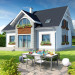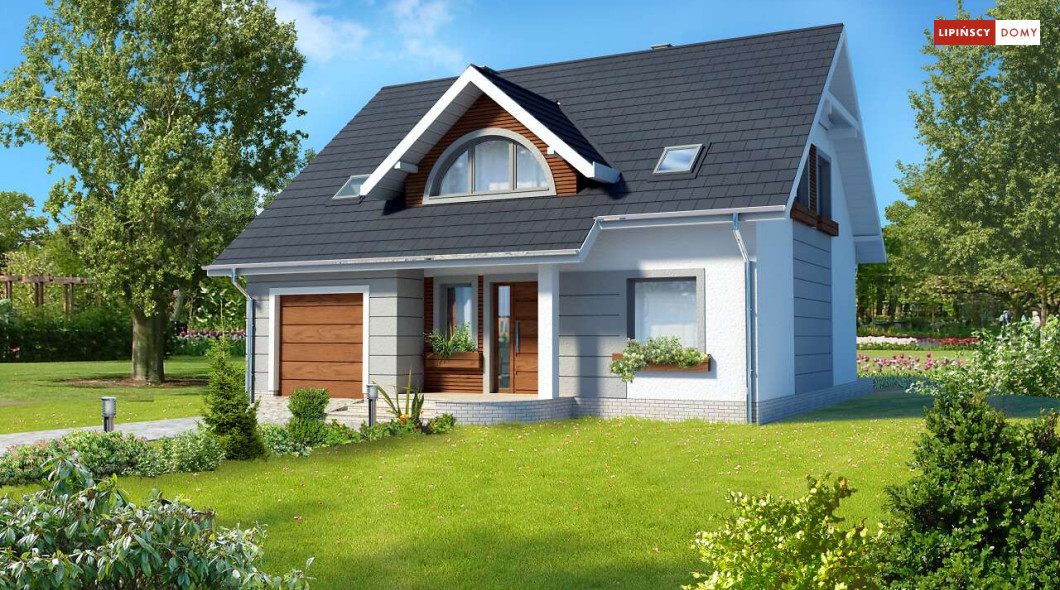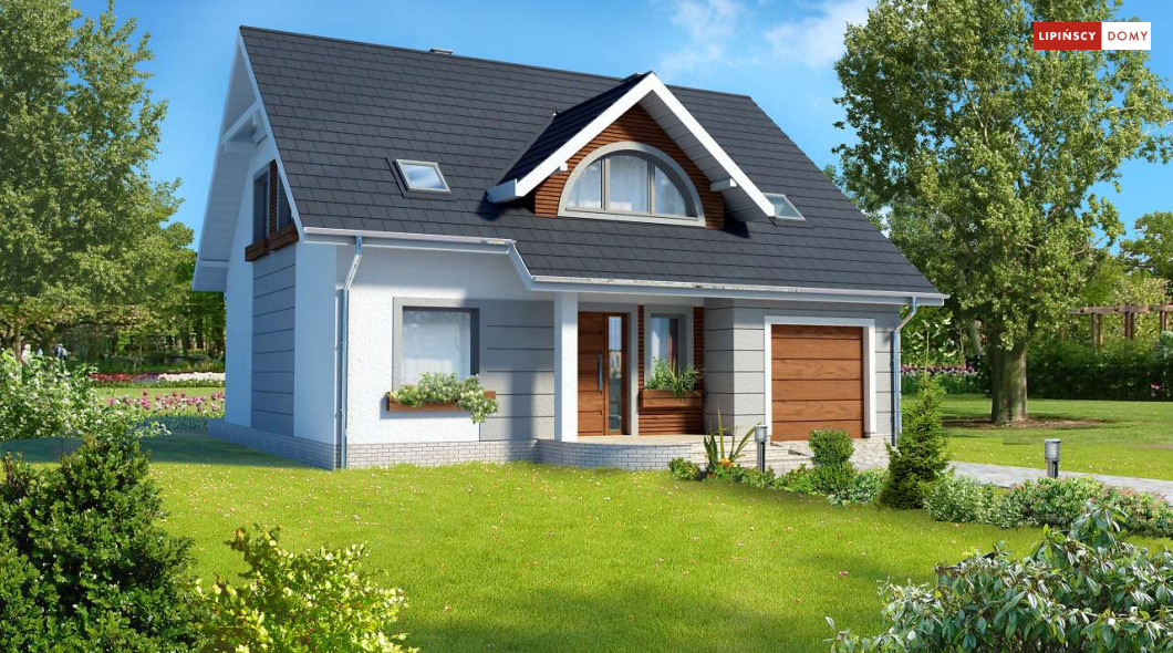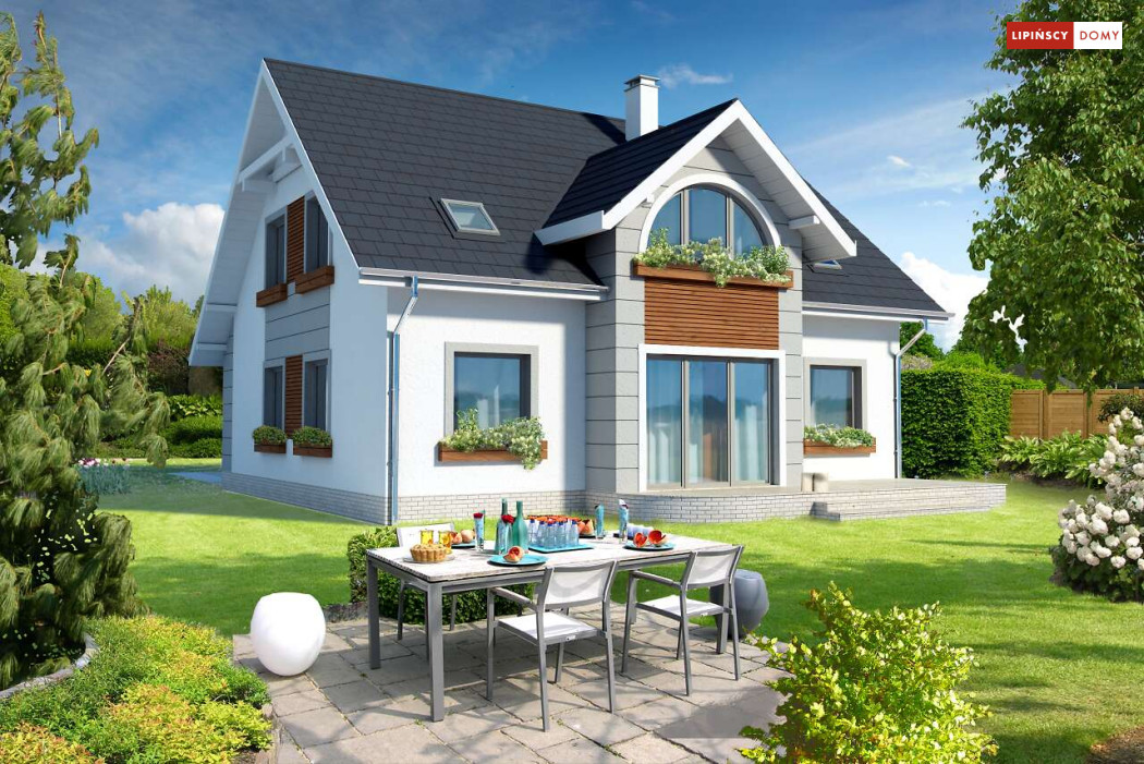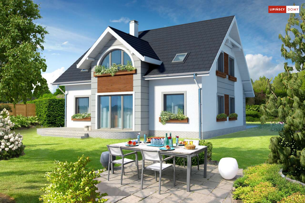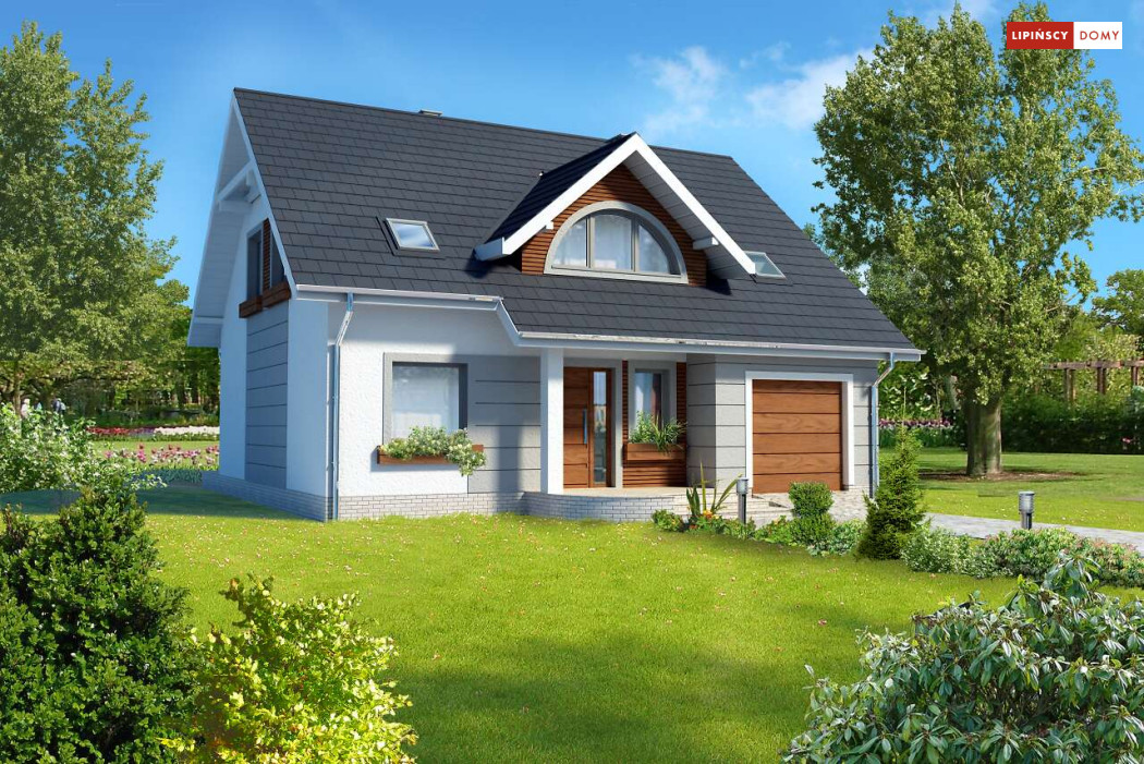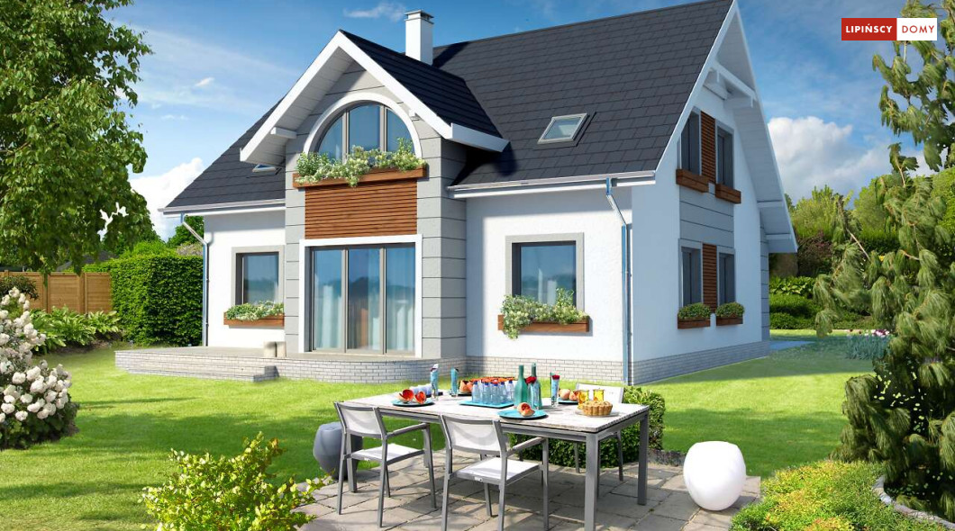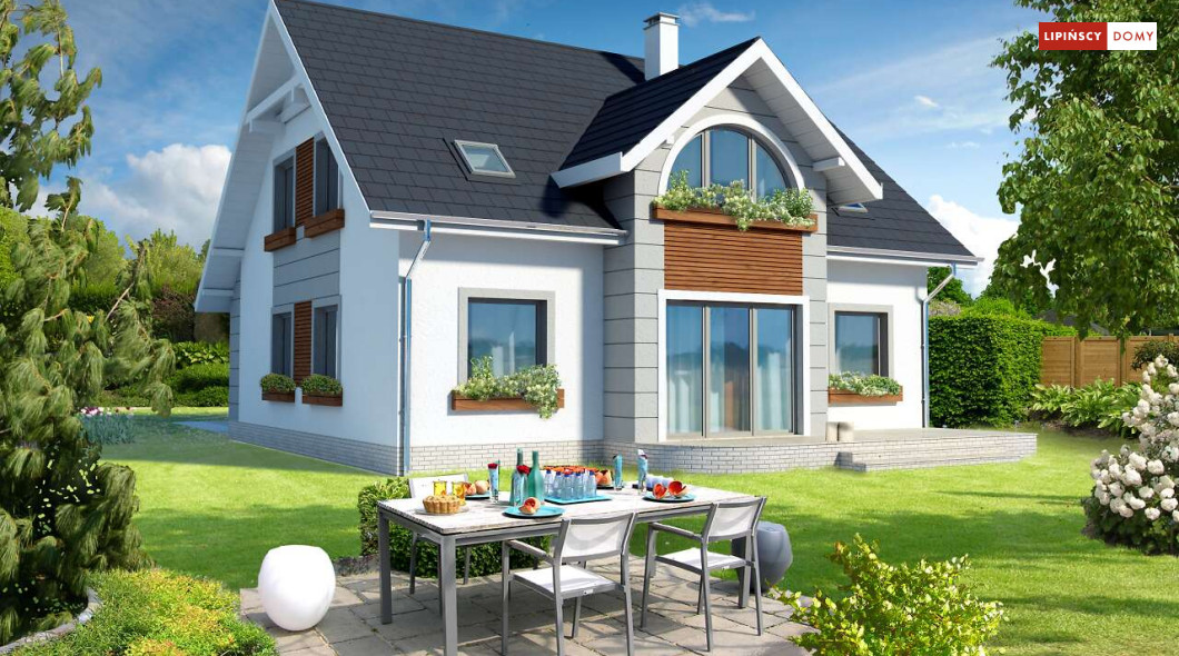 Niebanalny dom z poddaszem użytkowym. Prostą bryłę uatrakcyjniono pięknymi lukarnami zarówno od strony frontowej, jak i elewacji ogrodowej. Z przodu uwagę zwraca półokrągła lukarna, od ogrodu natomiast niemałe wrażenie robi przeszklony wykusz. Wnętrze zostało rozplanowane z myślą o wygodzie mieszkańców. Na parterze jest duży salon z częścią jadalną, funkcjonalna kuchnia ze spiżarnią, dodatkowy pokój dla gości lub z przeznaczeniem na gabinet oraz łazienka i pomieszczenie gospodarcze. Poddasze, na które prowadzą schody, to cztery ustawne sypialnie, w tym jedna z prywatną łazienką oraz garderobą i dodatkowa, komfortowa łazienka.