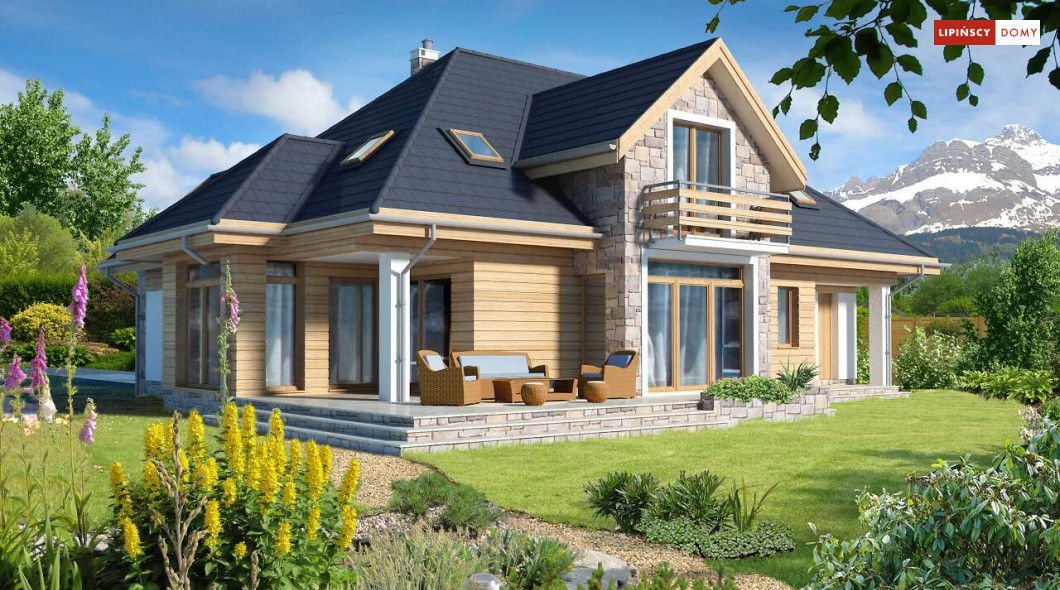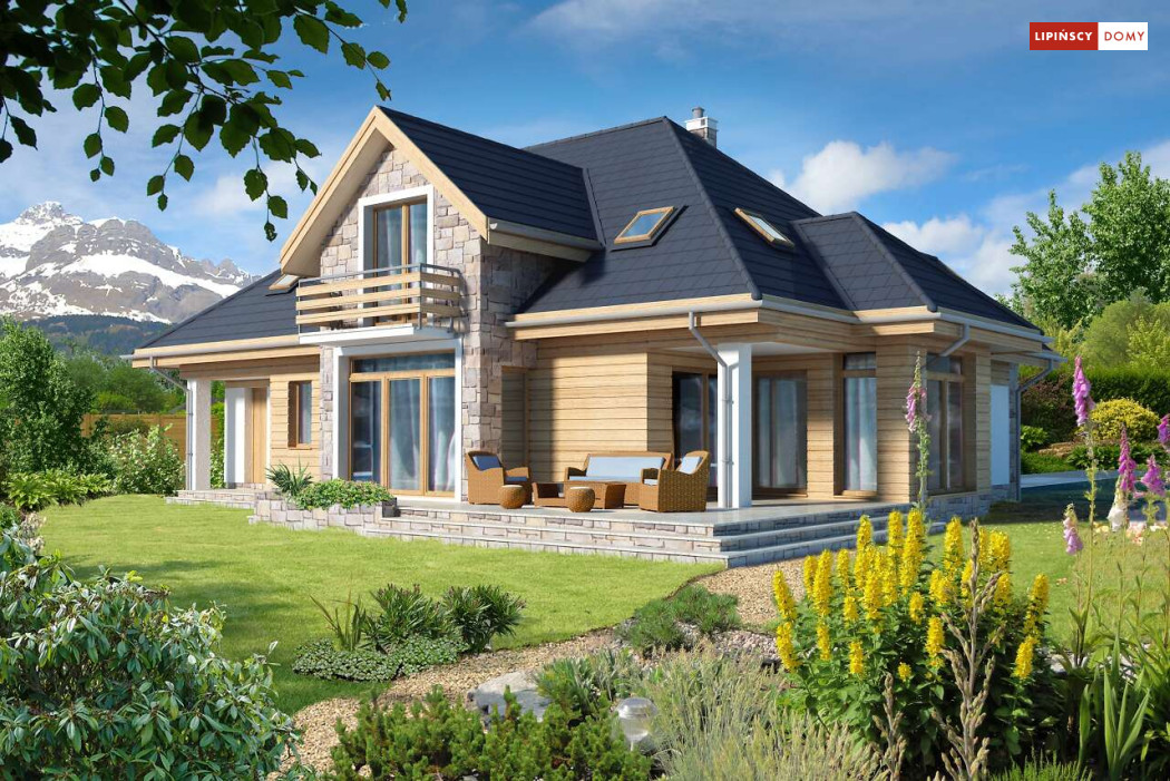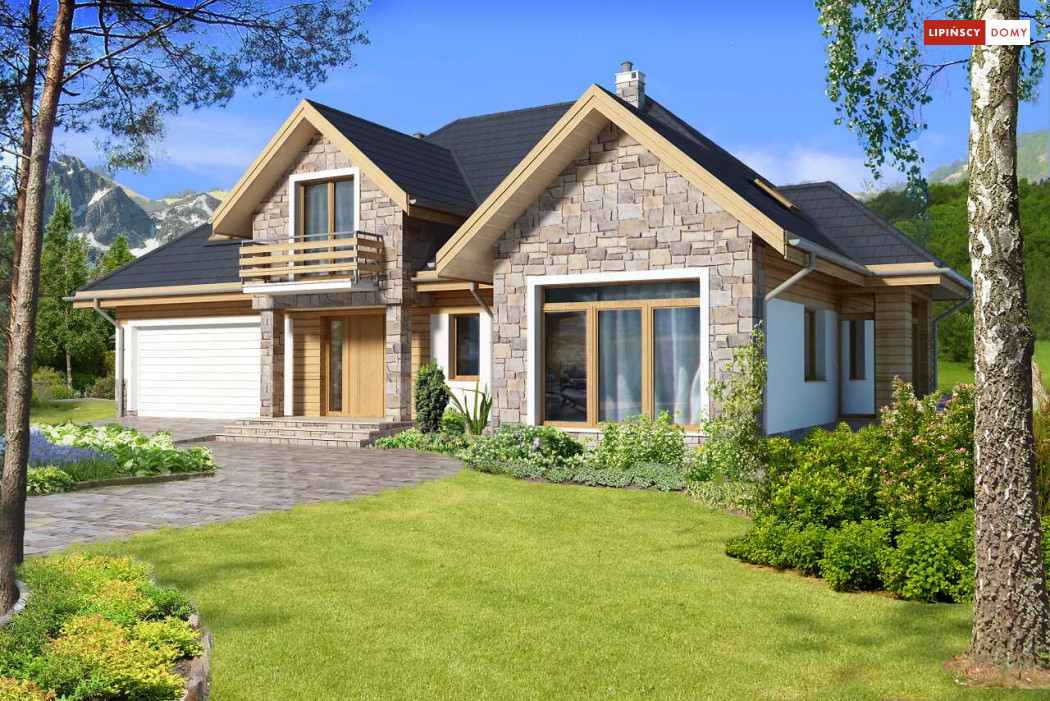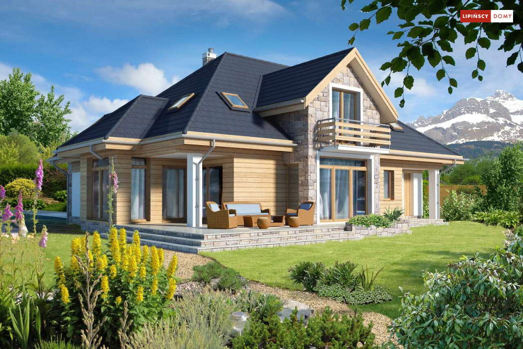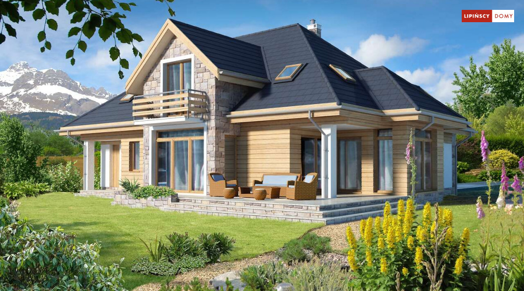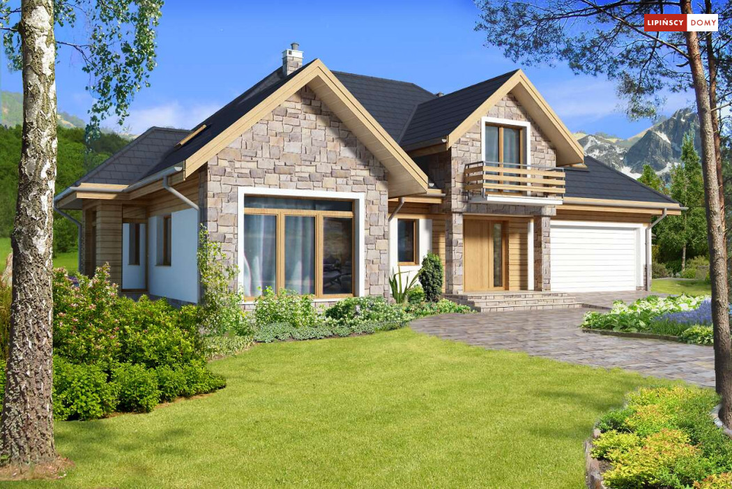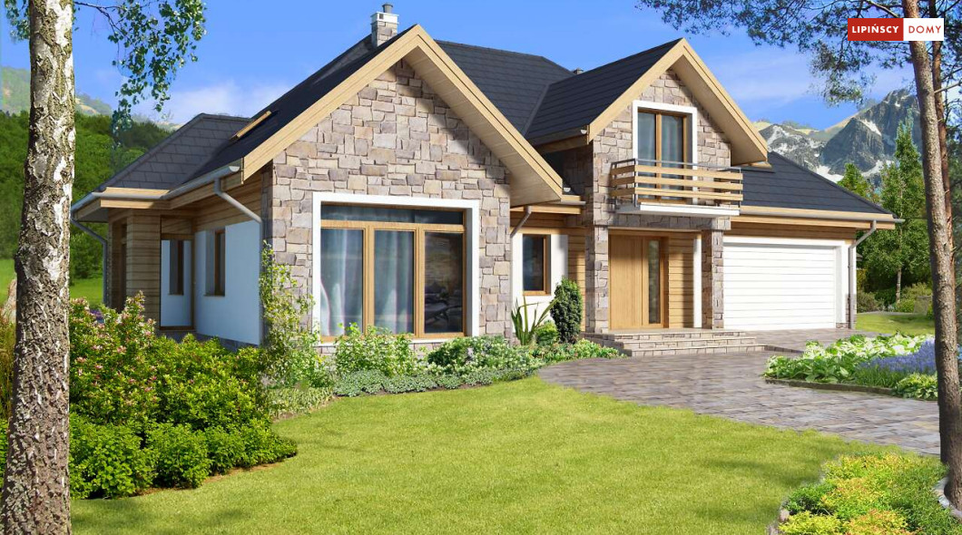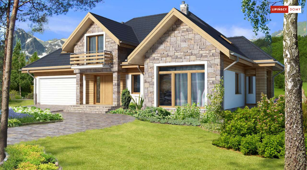 Wygodny dom z użytkowym poddaszem i dwustanowiskowym garażem, wkomponowanym w bryłę budynku. Na parterze zlokalizowano duży salon z dekoracyjnym, oszklonym wyjściem na taras. W salonie znalazło się także pięknie wyeksponowane miejsce na duży stół. Ustawna kuchnia, gdzie zmieści się wyspa, przydatna spiżarka, dodatkowy pokój służący jako gabinet lub pokój gościnny i łazienka znacznie przyczyniają się do wygodnego użytkowania tej wspólnej części. Poddasze to wyraźnie zaznaczona część prywatna, gdzie zlokalizowano trzy pokoje dla dzieci oraz sypialnię rodziców z przynależną do niej łazienką i dużą garderobą. Jest też oczywiście wspólna łazienka z przejściem do suszarni oraz dodatkowa garderoba przy jednym z mniejszych pokoi.