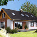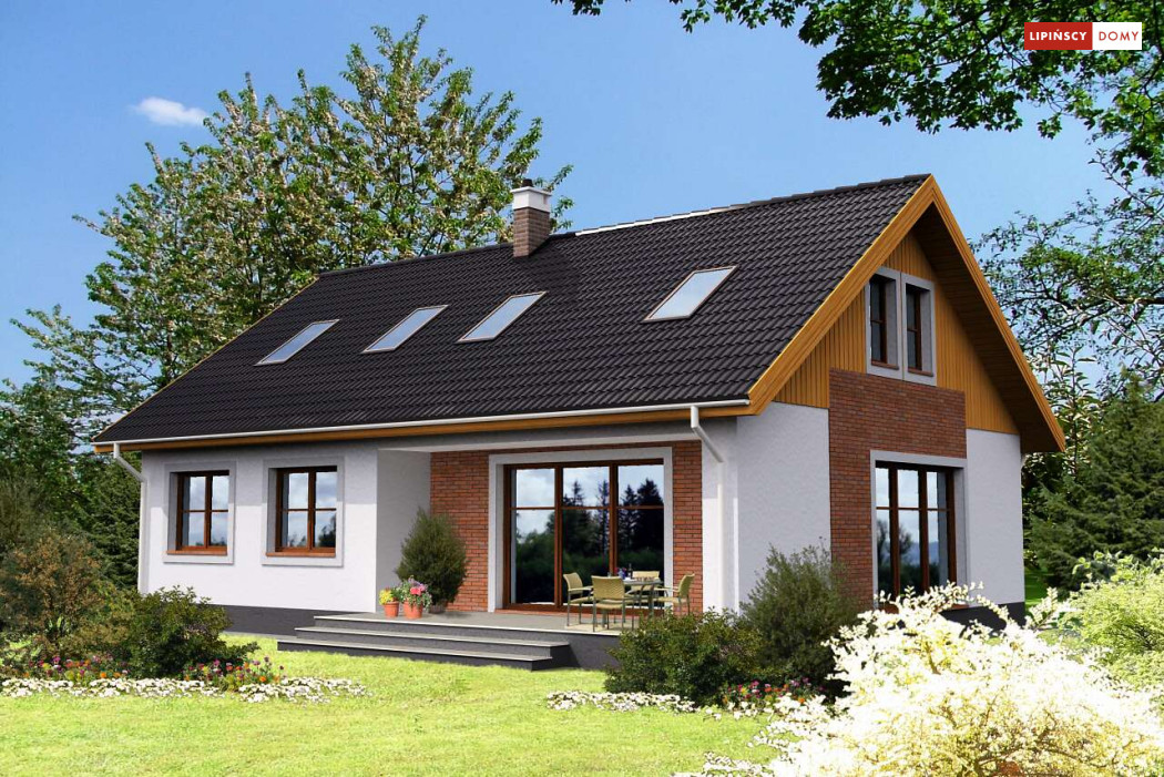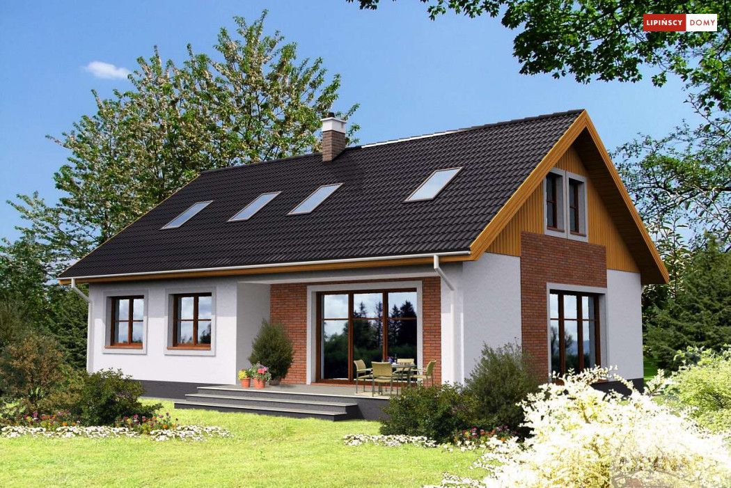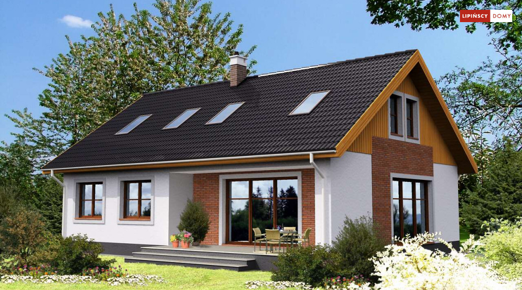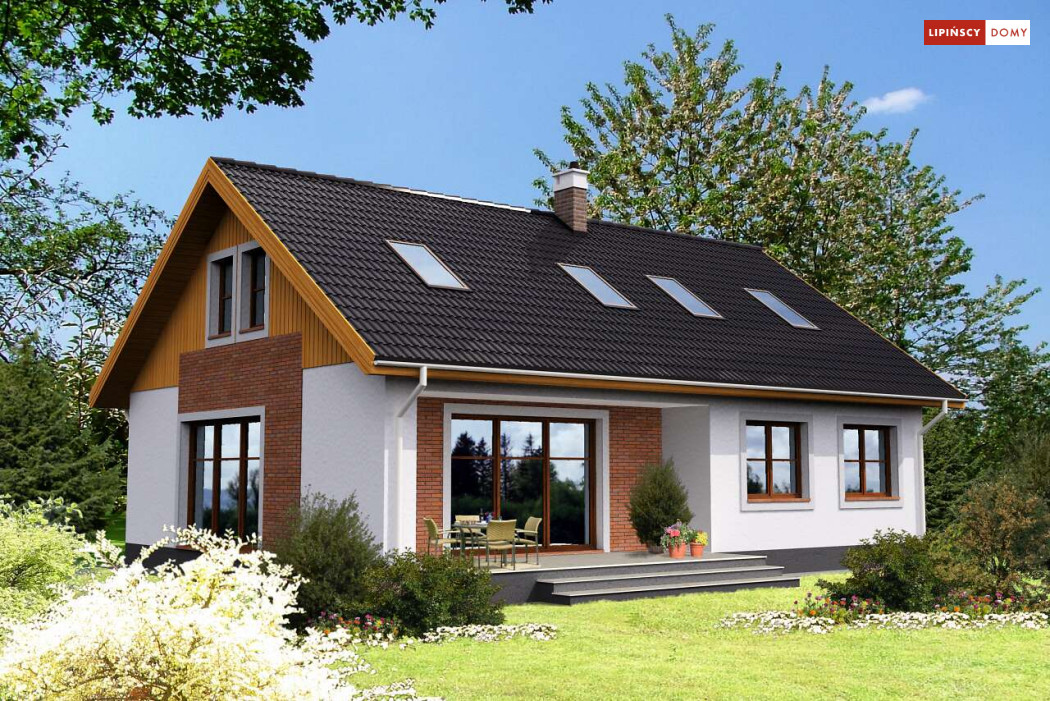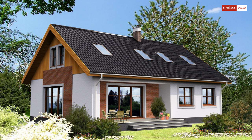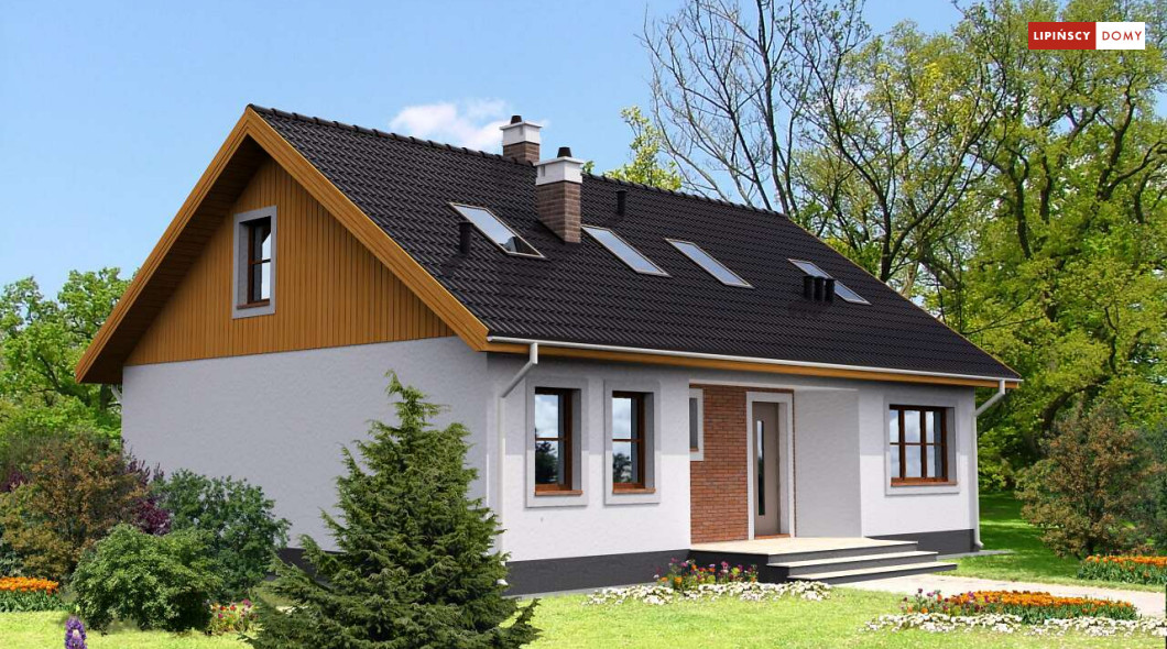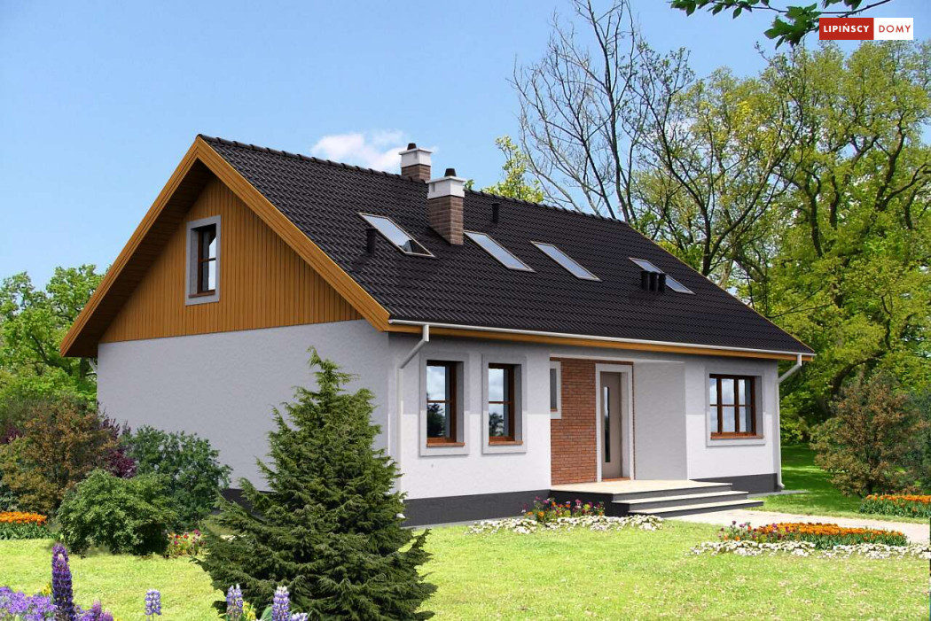 Piękny dom z użytkowym poddaszem, o zwartej, prostej bryle i funkcjonalnym wnętrzu. Duże przeszklenia dodają budynkowi lekkości i sprawiają, że w środku jest dużo dziennego, naturalnego światła. Na parterze znajduje się obszerny salon z kominkiem, sąsiadujący z półotwartą kuchnią, z miejscem na stół, dwie sypialnie, łazienka, spiżarnia, pomieszczenie gospodarcze i wc. Poddasze to część nocna, gdzie są trzy wygodne sypialnie, garderoba i komfortowa, doświetlona oknem połaciowym łazienka.