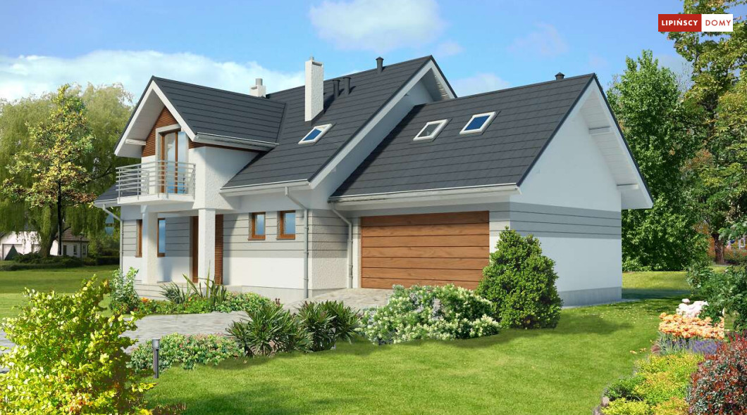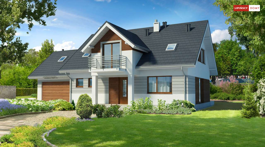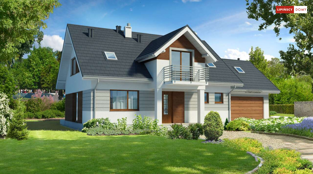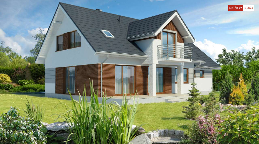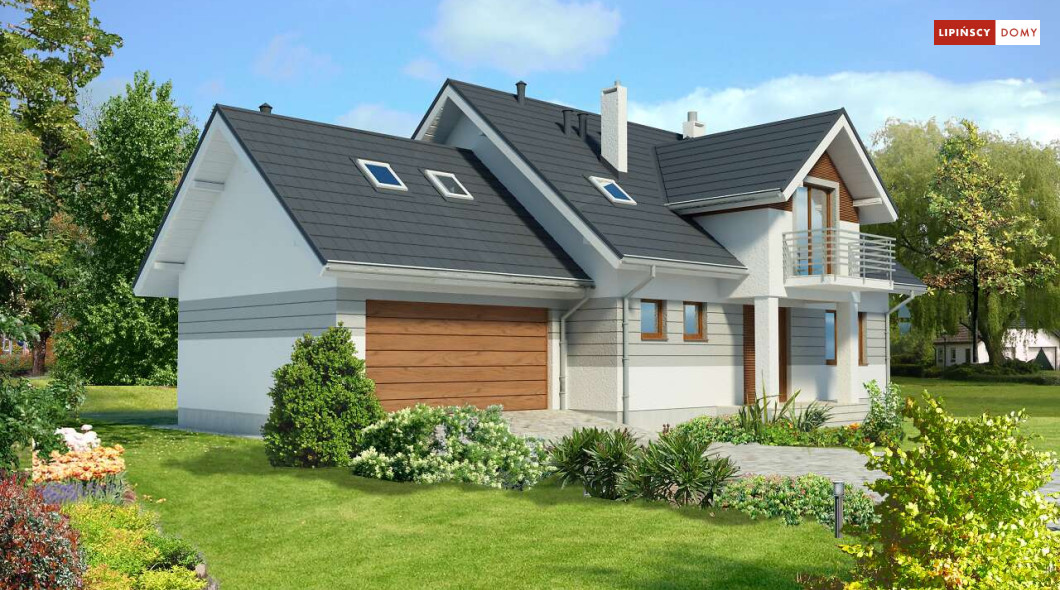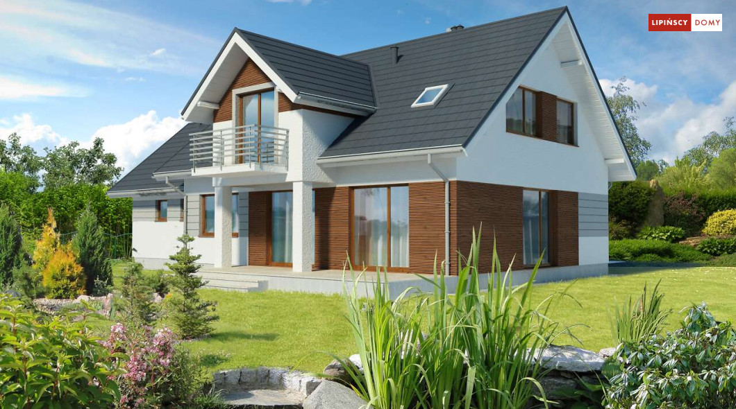 Przestronny dom z użytkowym poddaszem o nowoczesnym rysie. Na parterze zlokalizowano duży salon z jadalnią, półotwartą kuchnię z podręczną spiżarnią, pokój, łazienkę, wc i pomieszczenie gospodarcze z kotłem gazowym. Poddasze to cztery sypialnie, w tym jedna z garderobą i łazienką, komfortowa łazienka z wydzielonym miejscem na pralkę i duża suszarnia. Z domu przewidziano przejście do garażu na dwa stanowiska. Ozdobą domu są balkony z metalowymi balustradami i filary przy wejściu oraz tarasie ogrodowym. <br>