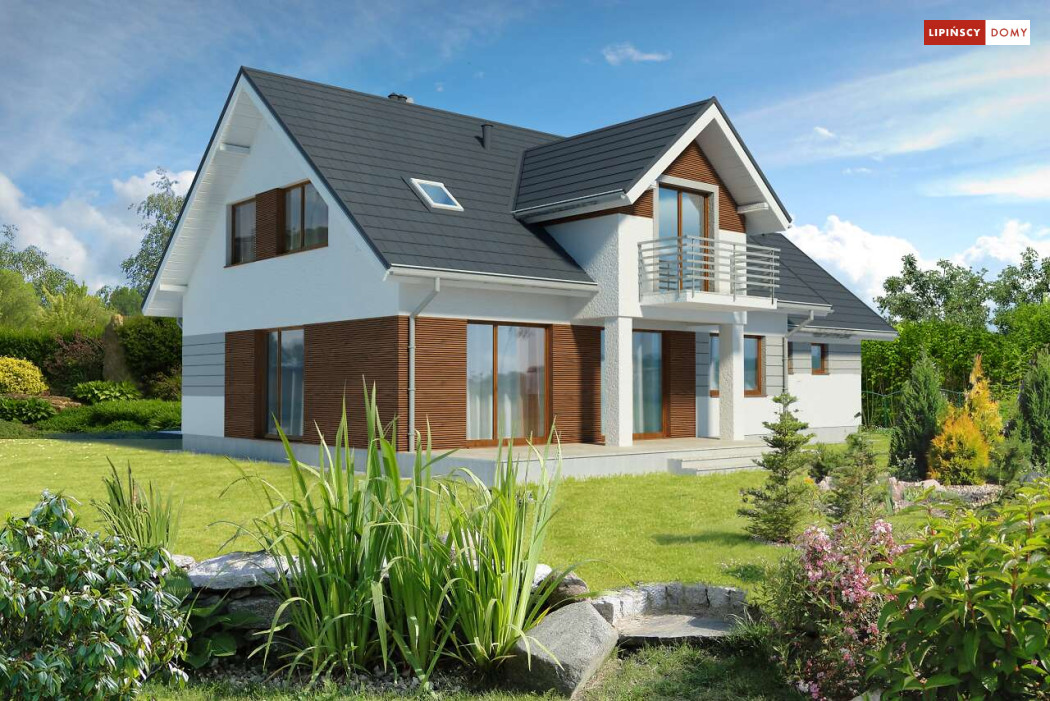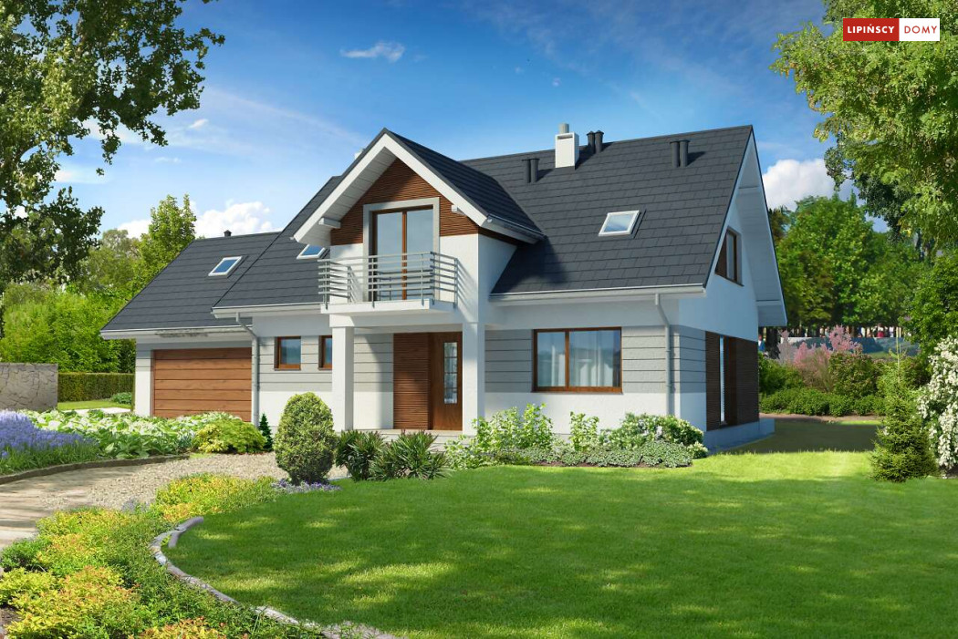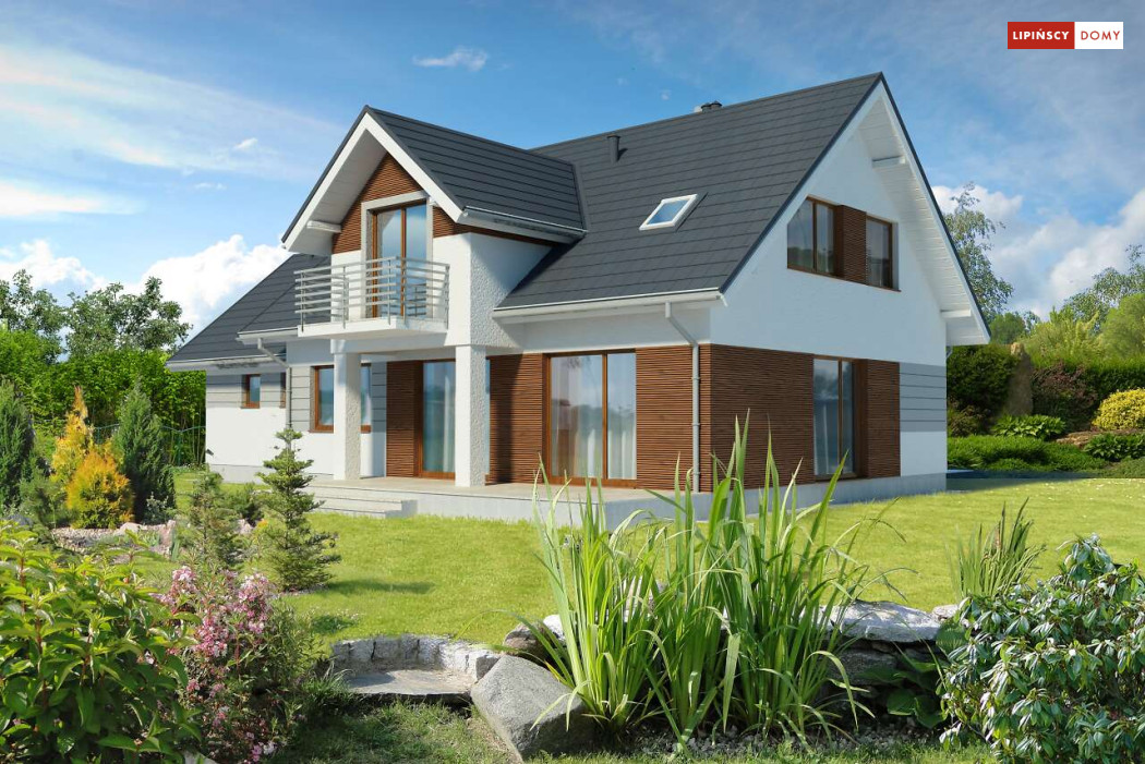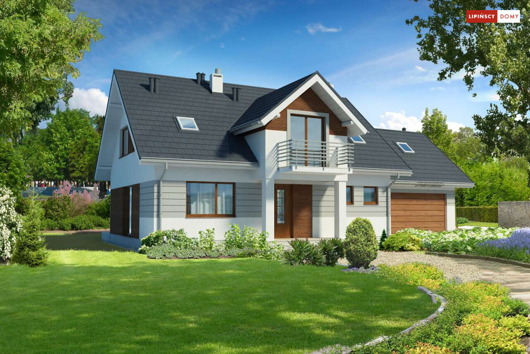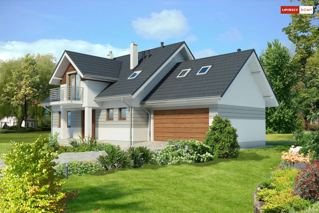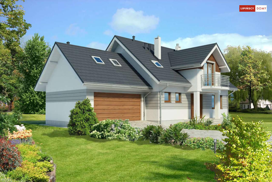 Przestronny dom z użytkowym poddaszem o nowoczesnym rysie. Na parterze zlokalizowano duży salon z jadalnią, półotwartą kuchnię z podręczną spiżarnią, pokój, łazienkę, wc i pomieszczenie gospodarcze z kotłem gazowym. Poddasze to cztery sypialnie, w tym jedna z garderobą i łazienką, komfortowa łazienka z wydzielonym miejscem na pralkę i duża suszarnia. Z domu przewidziano przejście do garażu na dwa stanowiska. Ozdobą domu są balkony z metalowymi balustradami i filary przy wejściu oraz tarasie ogrodowym. <br>