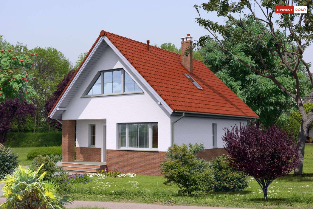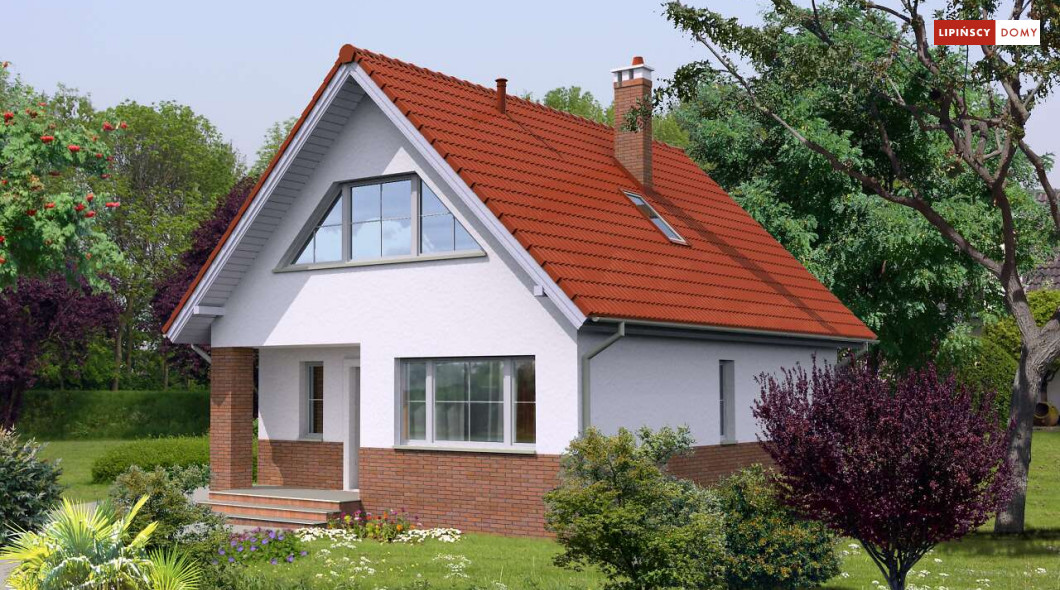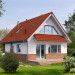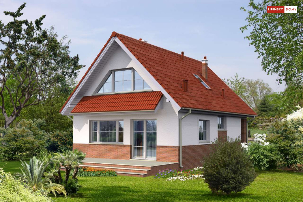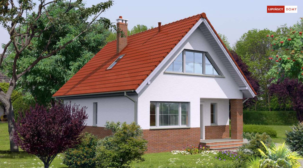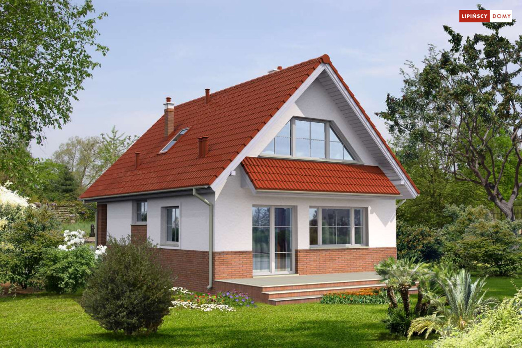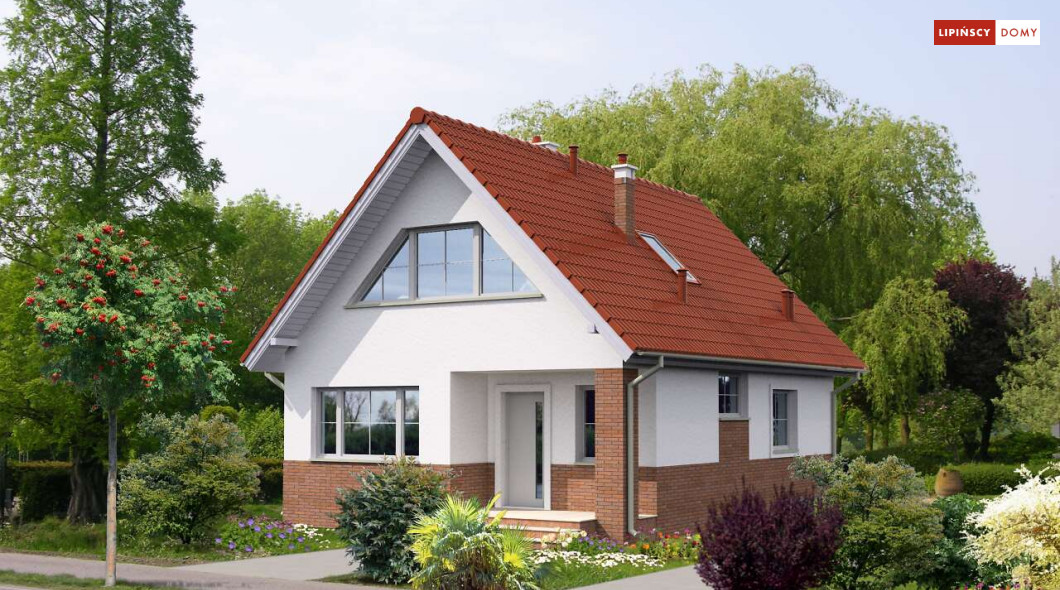 Mały zgrabny domek z dwuspadowym dachem i użytkowym poddaszem o szczytowym ustawieniu wobec drogi. Doskonała propozycja dla osób szukających wygodnego domu na niezbyt szeroką działkę. Na parterze znajduje się salon z kominkiem, aneksem kuchennym, miejscem na stół i wyjściem na częściowo zadaszony taras oraz sypialnia, łazienka i pomieszczenie gospodarcze. Poddasze kryje dwie sypialnie i wygodną łazienkę. Ozdobą domu jest wejście w podcieniu i okna o nietypowym kształcie, doskonale doświetlające oba pokoje na poddaszu. <br>