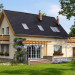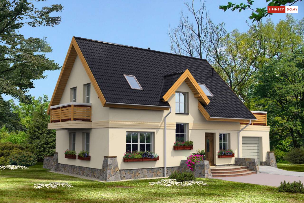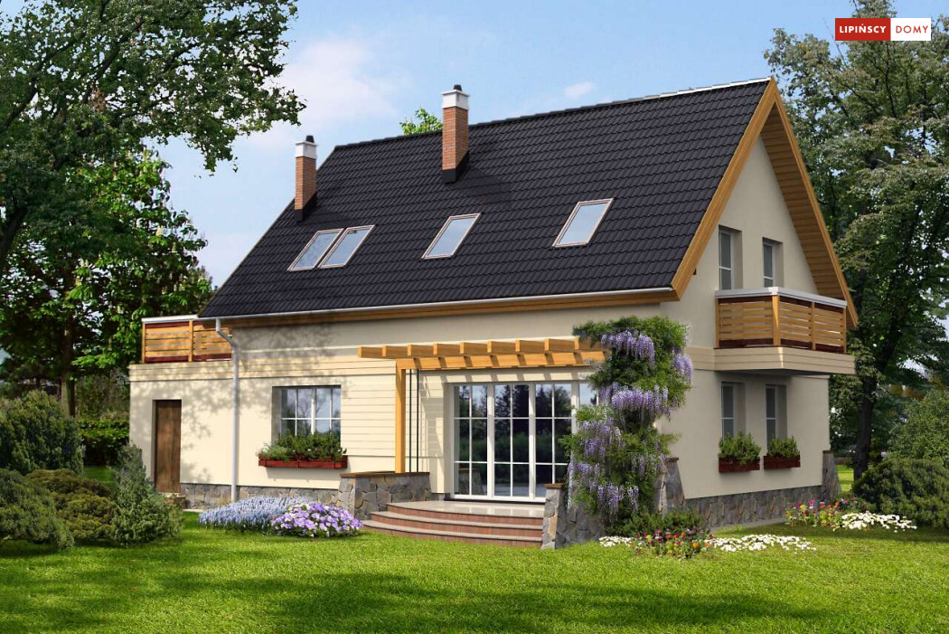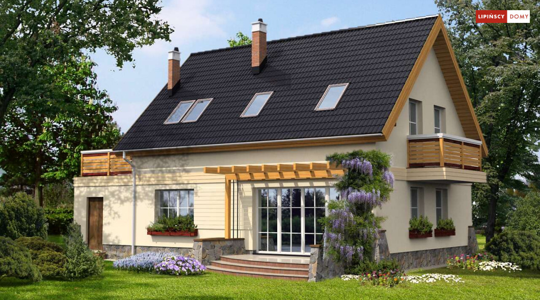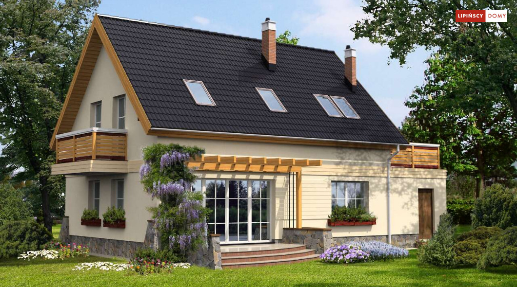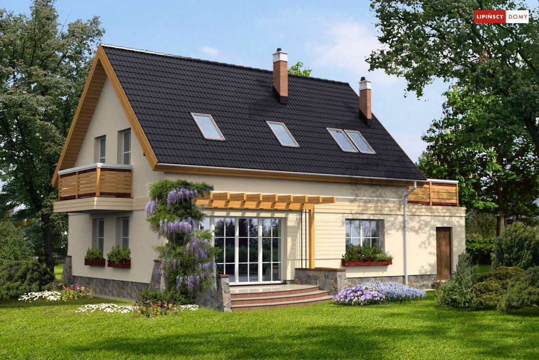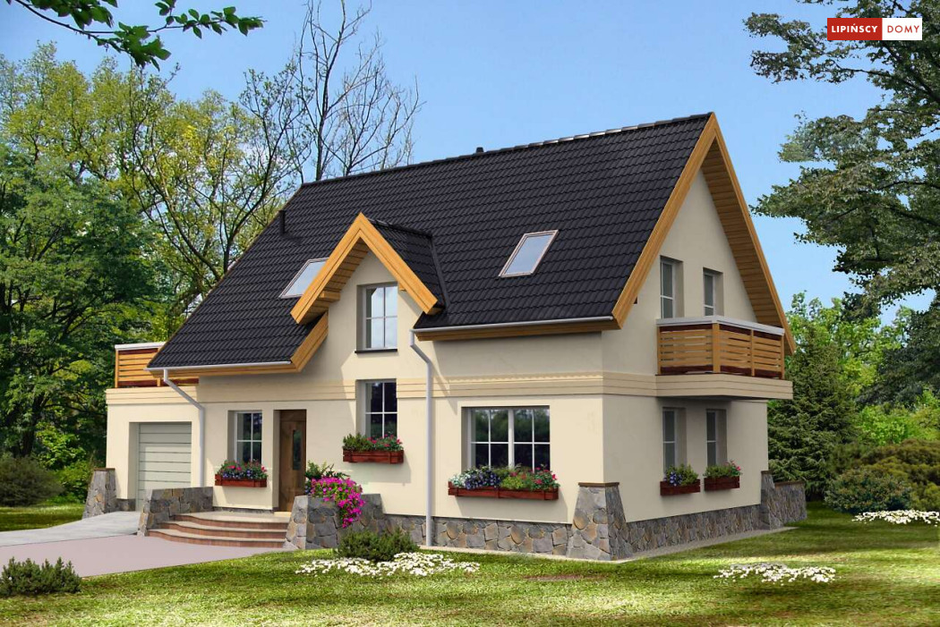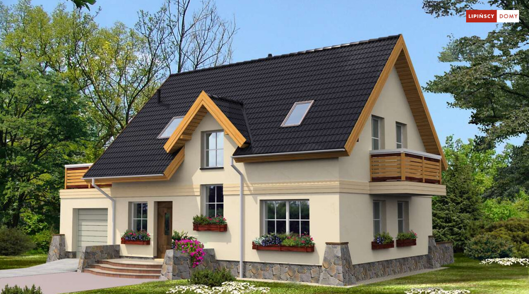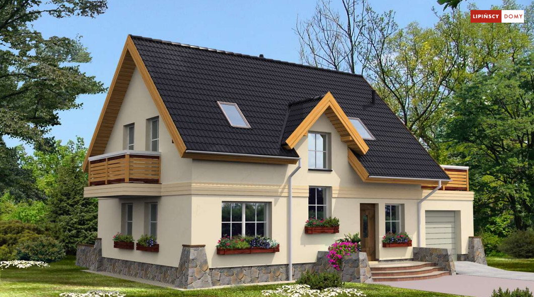 Energooszczędna wersja wygodnego domu z użytkowym poddaszem LMP240 i garażem. Duży salon z kominkiem, pięknie doświetlony przeszklonym wyjściem na taras połączony został z kuchnią, co nadaje wnętrzu przestrzenności. Obok kuchni zlokalizowano praktyczną spiżarkę. Na parterze znajduje się także dodatkowy pokój, łazienka i pomieszczenie gospodarcze z przejściem do garażu. Za garażem zaplanowano kotłownię, a nad garażem taras. Poddasze zajmują trzy ustawne sypialnie, garderoba i komfortowa, doświetlona oknem połaciowym łazienka.