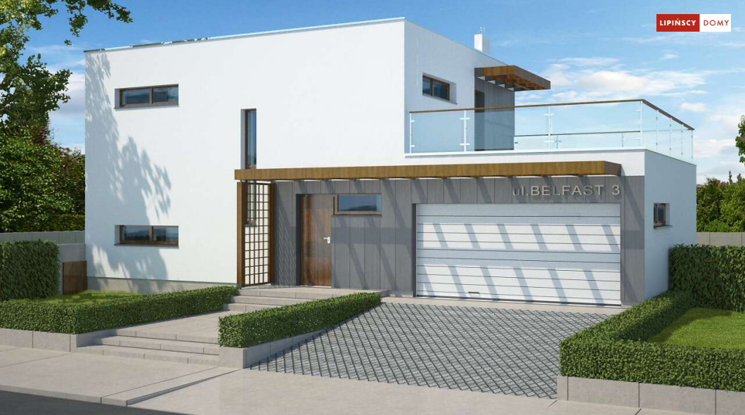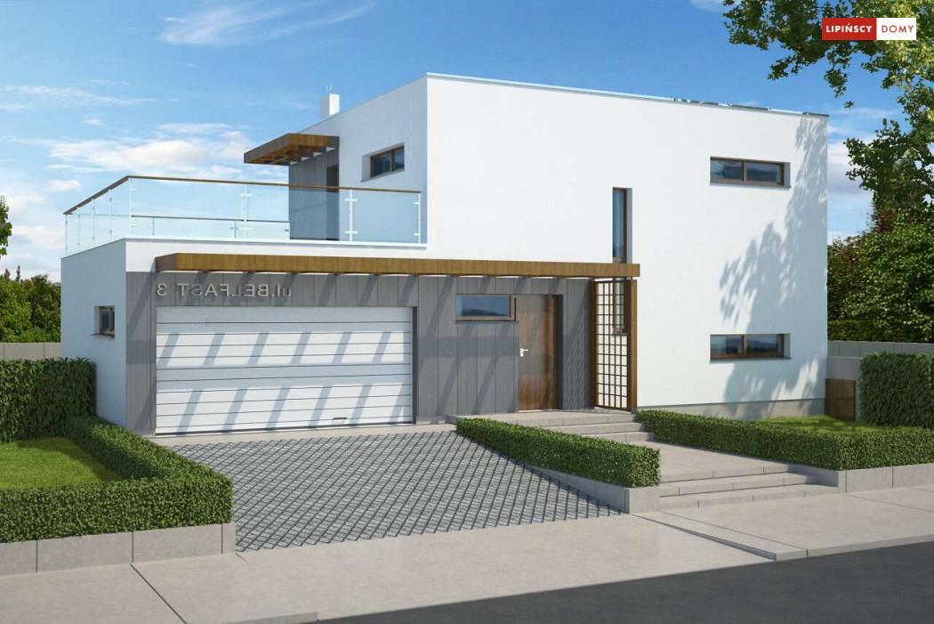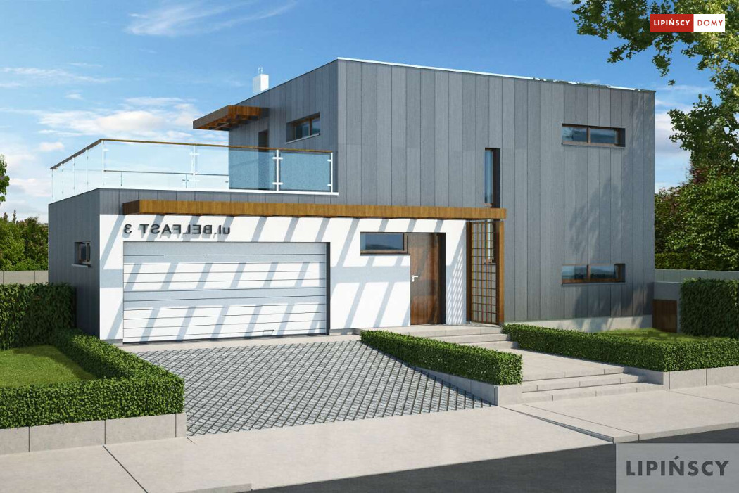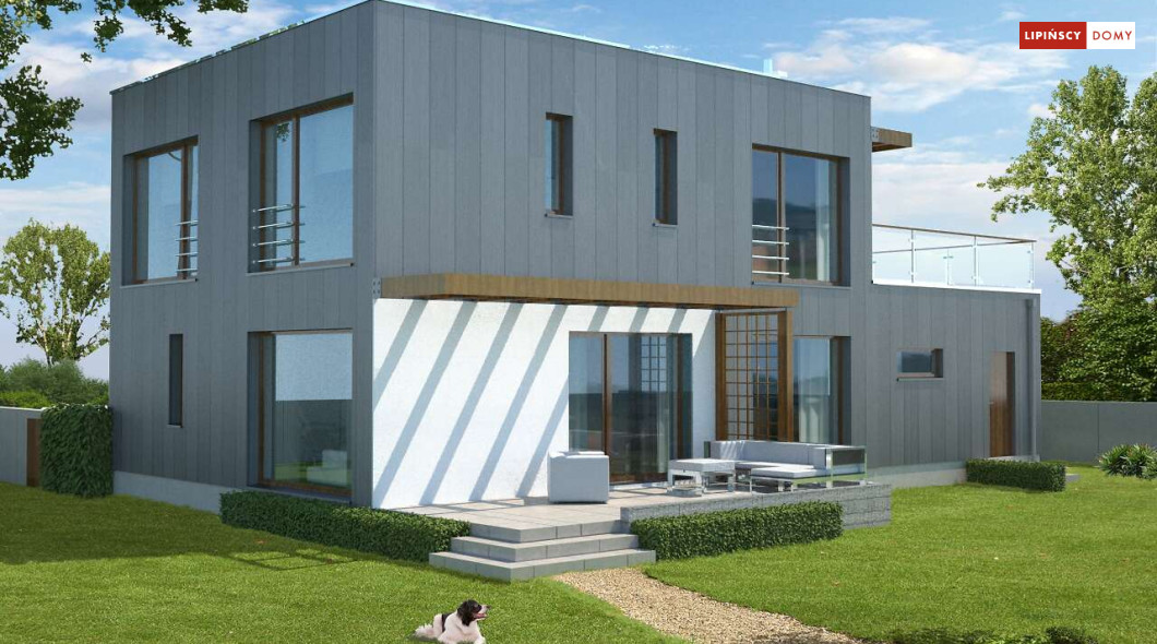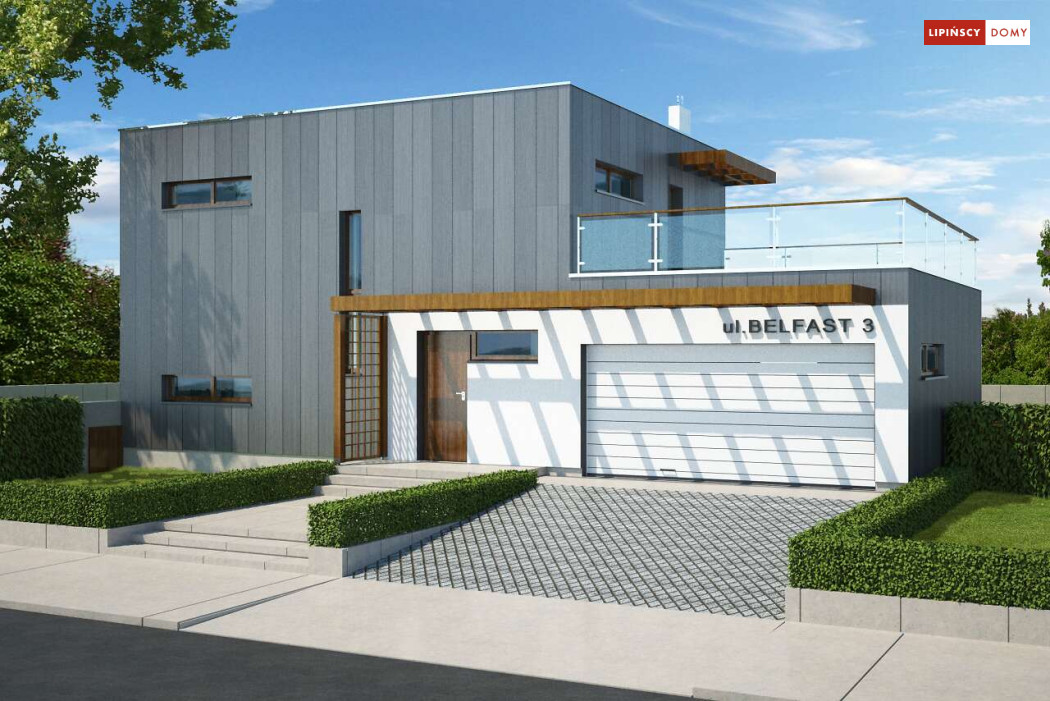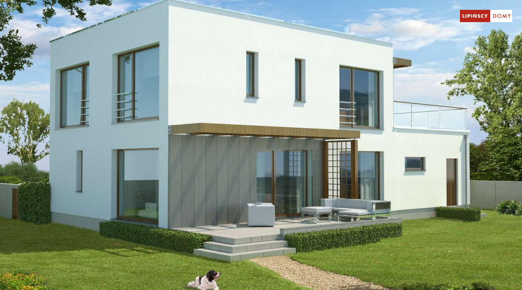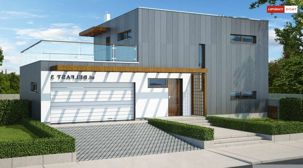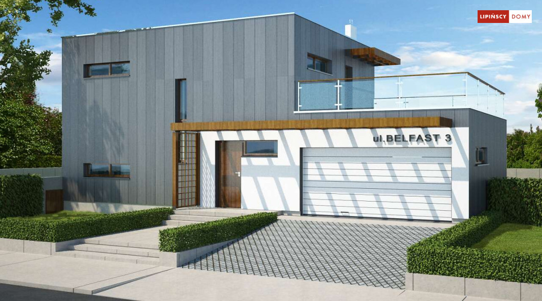 Nowoczesny dom z płaskim dachem, z dużymi przeszkleniami, nadającymi bryle lekkości i elegancji. Funkcjonalne wnętrze – parter i poddasze podzielono na strefę dzienną i nocną. Mieszkańcy mogą wspólnie spędzać czas w połączonym z kuchnią salonie, a gdy chcą nieco spokoju, mają do dyspozycji trzy zlokalizowane na parterze sypialnie. Oprócz tych pomieszczeń, jest do ich dyspozycji także osobna sypialnia na parterze, dwie łazienki, garderoba i duży, nowoczesny taras na dachu garażu.