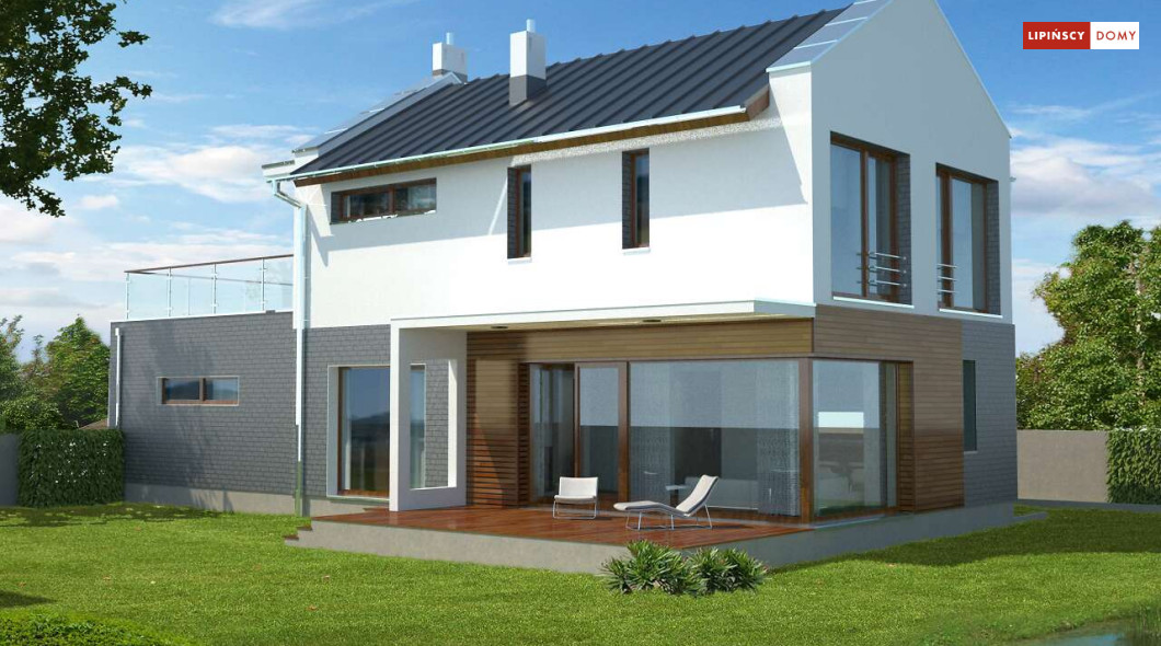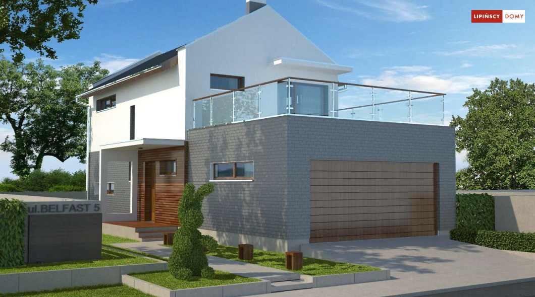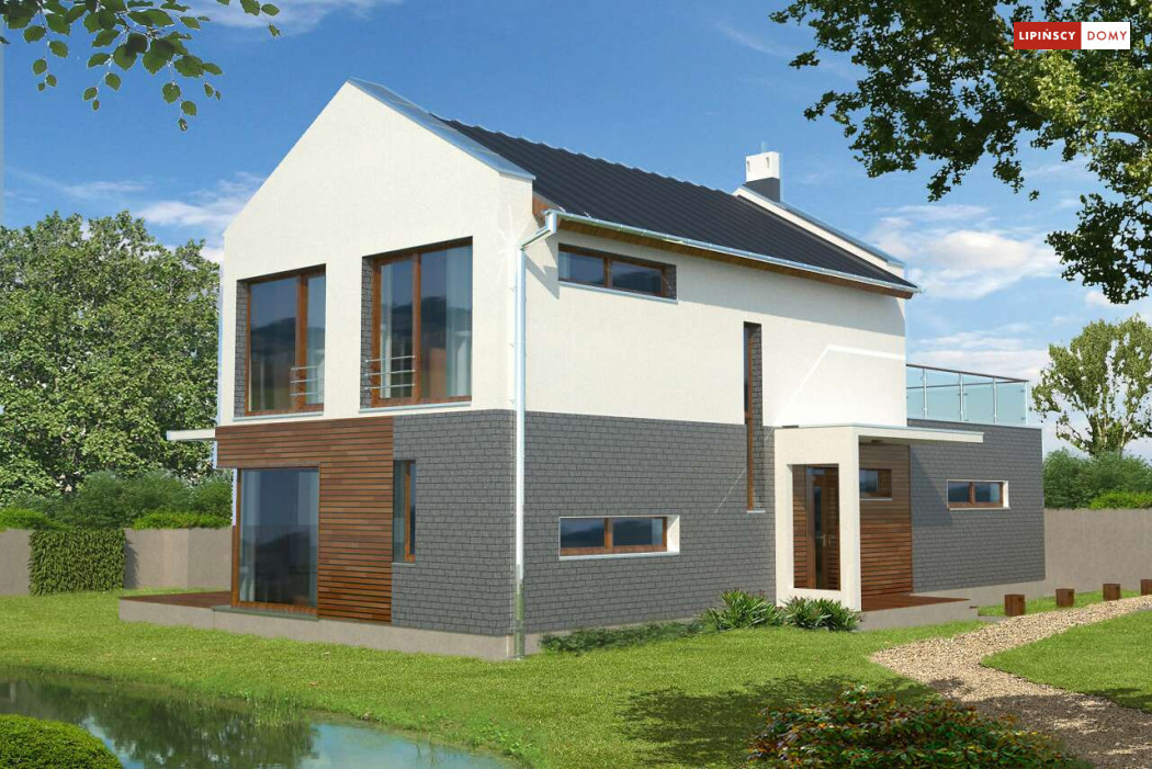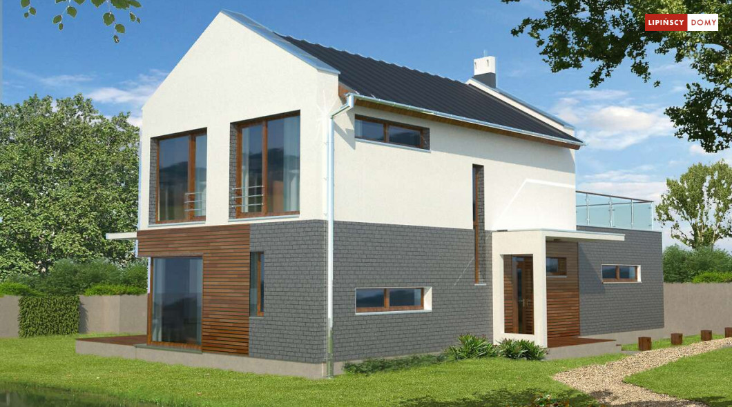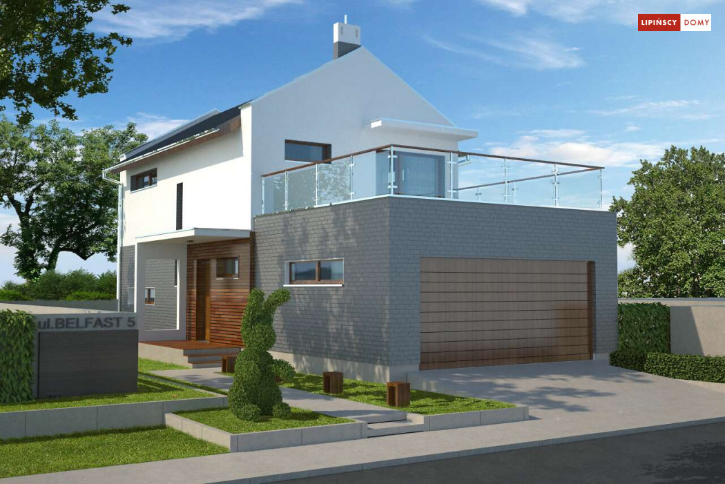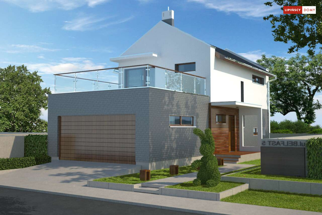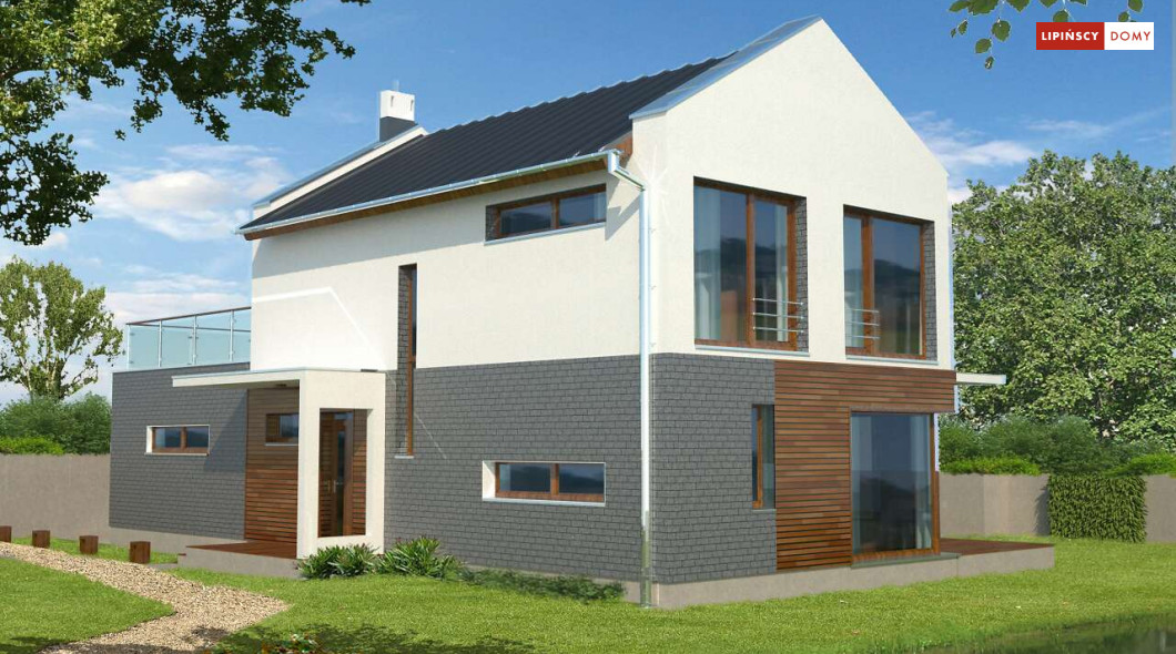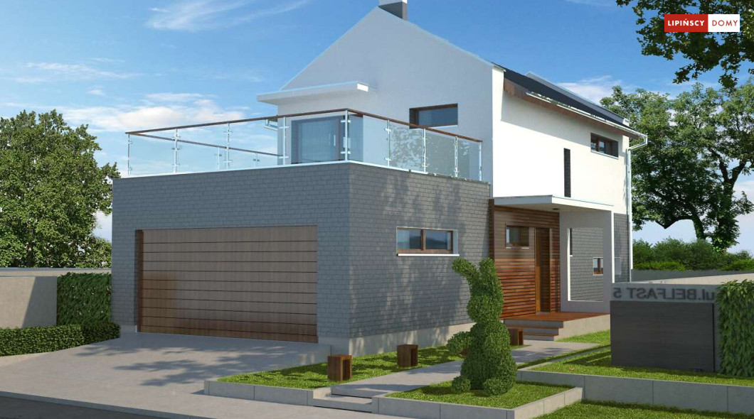 Nowoczesny dom z pełnym piętrem, przekryty dwuspadowym dachem o niewielkim kącie nachylenia. Jest to projekt wart uwagi tych, którzy szukają domu na niezbyt szeroką działkę. Wnętrze kryje otwartą na salon kuchnię, a także sypialnię, łazienkę i pomieszczenie gospodarcze, przez które można przejść do garażu. Na poddaszu znajdują się trzy sypialnie, w tym jedna z wyjściem na piękny, duży taras zlokalizowany na dachu garażu. Mieszkańcy mają do dyspozycji także wygodną łazienkę z wydzieloną strefą na pralkę.