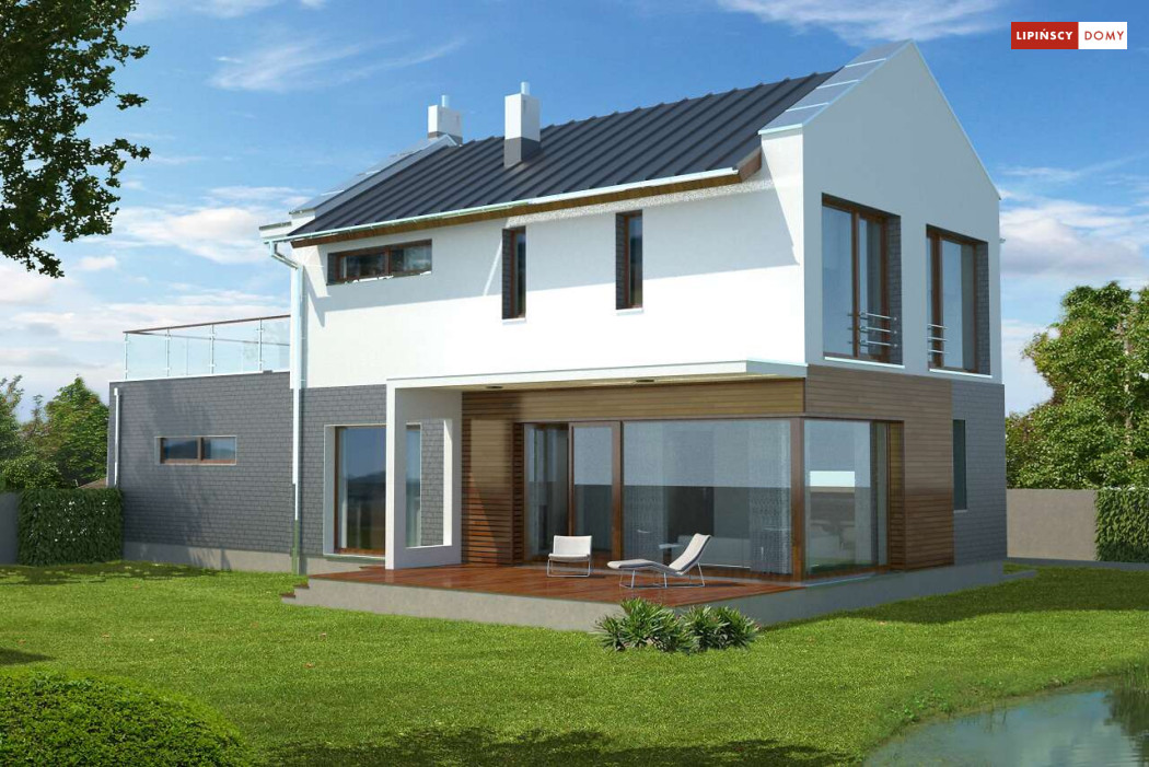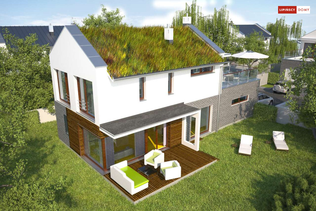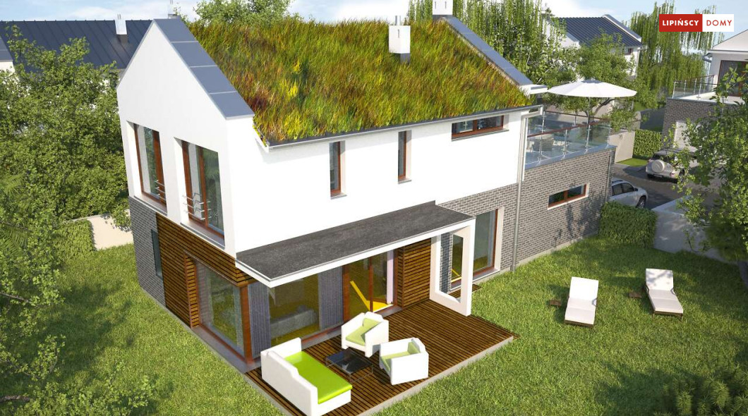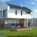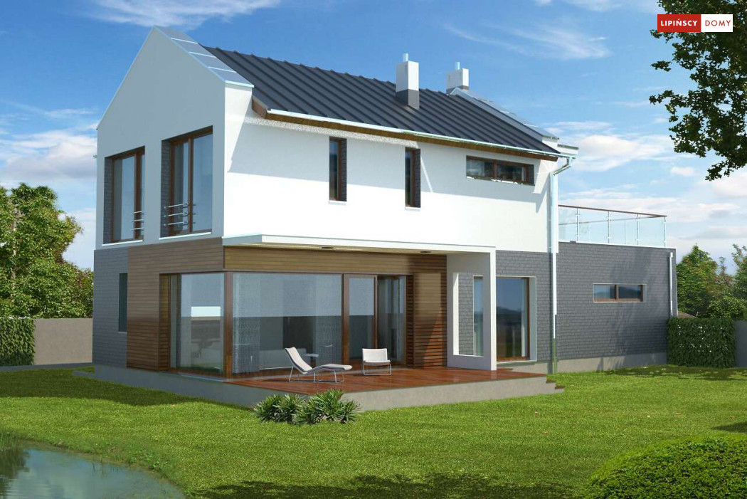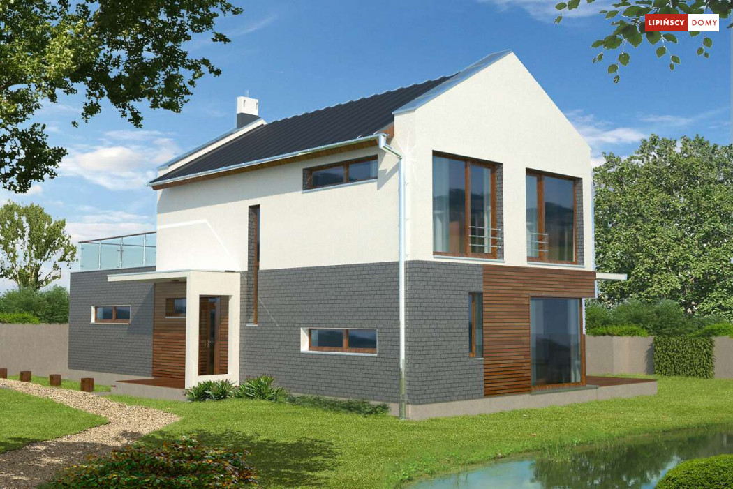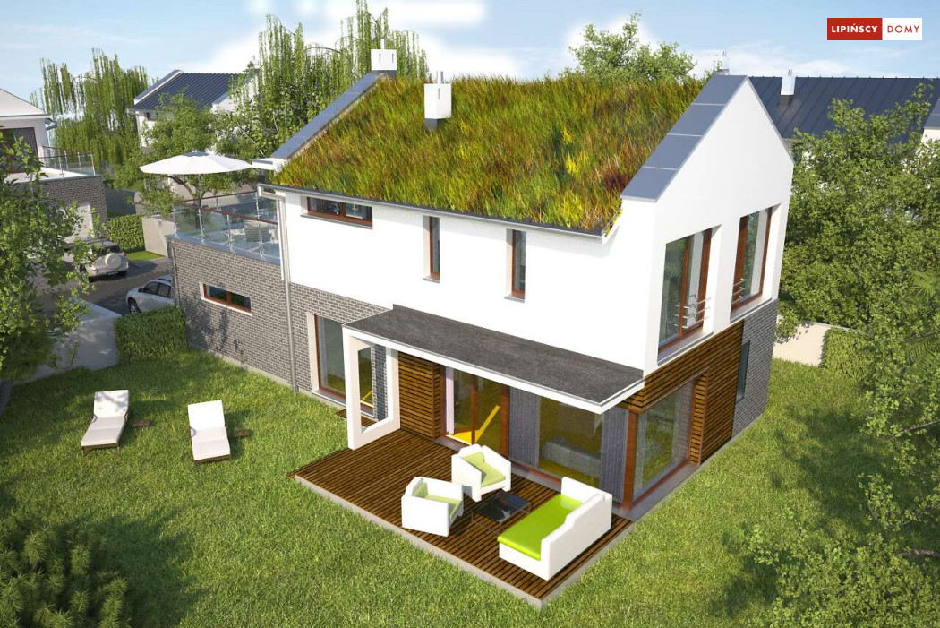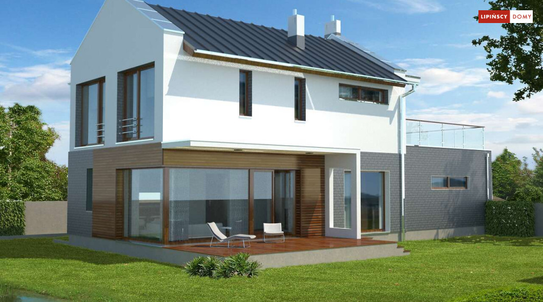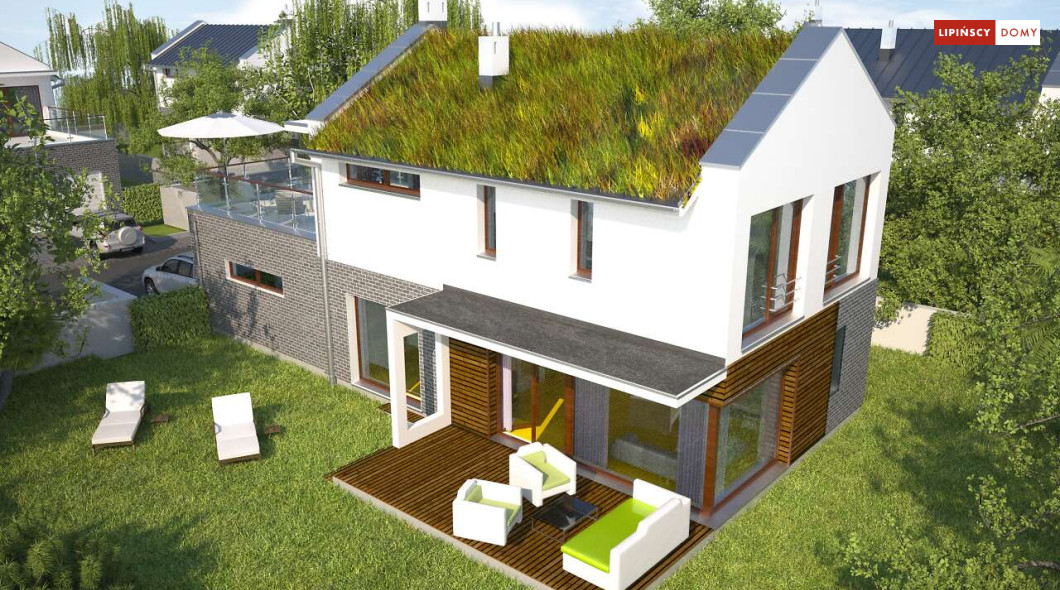 Nowoczesny dom z pełnym piętrem, przekryty dwuspadowym dachem o niewielkim kącie nachylenia. Jest to projekt wart uwagi tych, którzy szukają domu na niezbyt szeroką działkę. Wnętrze kryje otwartą na salon kuchnię, a także sypialnię, łazienkę i pomieszczenie gospodarcze, przez które można przejść do garażu. Na poddaszu znajdują się trzy sypialnie, w tym jedna z wyjściem na piękny, duży taras zlokalizowany na dachu garażu. Mieszkańcy mają do dyspozycji także wygodną łazienkę z wydzieloną strefą na pralkę.