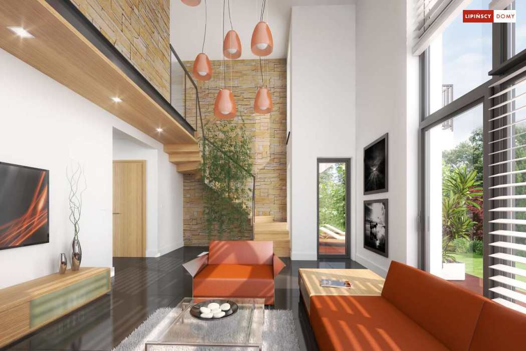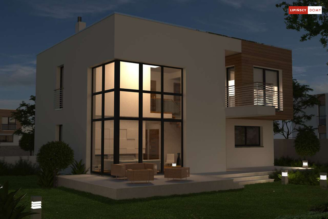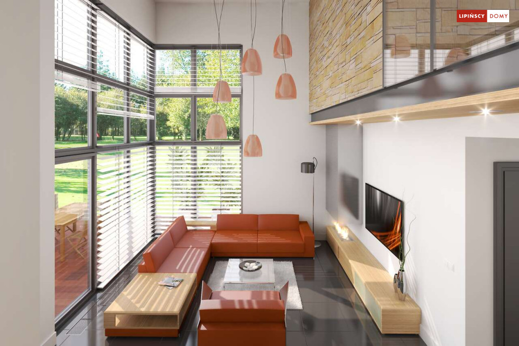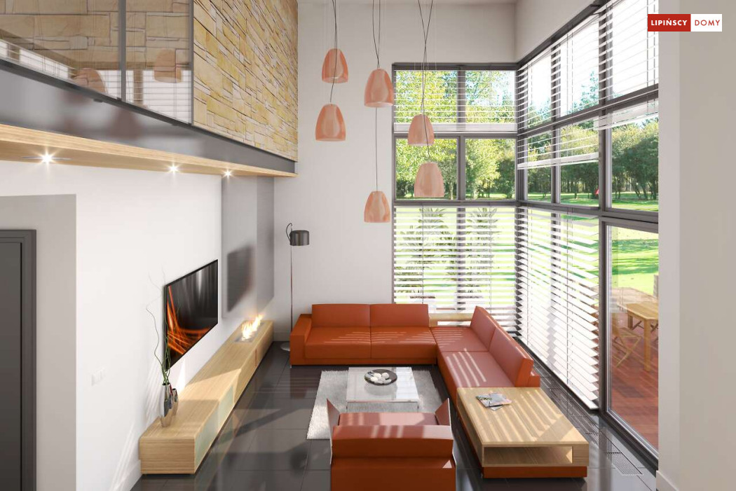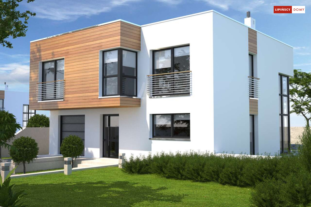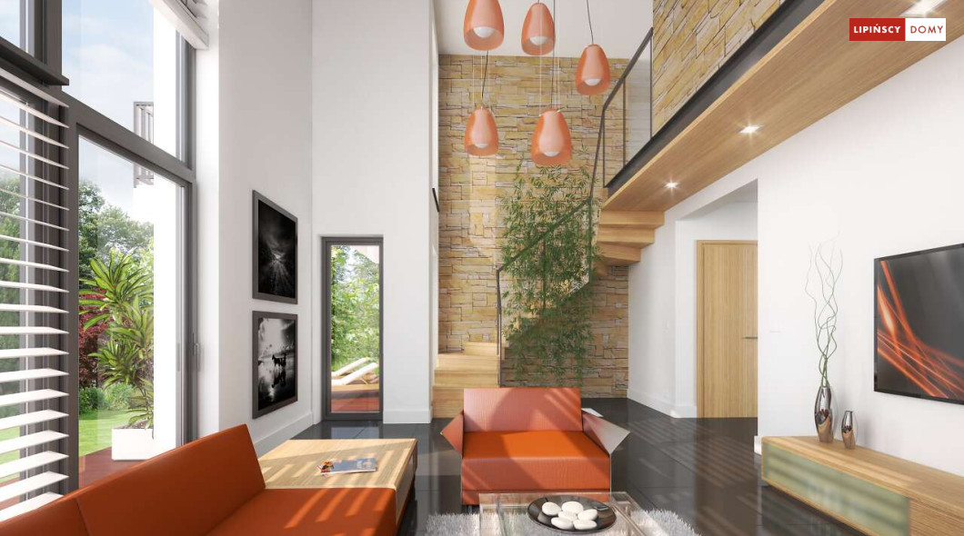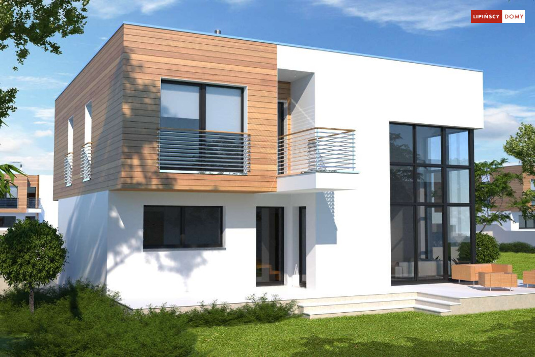 Nowoczesny, elegancki dom energooszczędny, którego bryła, dzięki zastosowaniu mocnych akcentów kolorystycznych i nowoczesnych przeszkleń, jest wyjątkowa i spodoba się miłośnikom niebanalnych rozwiązań. Dla Inwestorów, ceniących bardziej tradycyjne rozwiązania przygotowano wersję elewacji w stonowanych kolorach, z drewnianymi i metalowymi elementami. Na parterze znajduje się salon z antresolą, ustawna kuchnia z miejscem na rodzinny stół, spiżarnia i wc. Drugą kondygnację zajmują trzy sypialnie, w tym jedna z niezależną łazienką, i wspólna łazienka. Duże przeszklenia w salonie doskonale doświetlają wnętrze i są bardzo charakterystycznym elementem bryły.