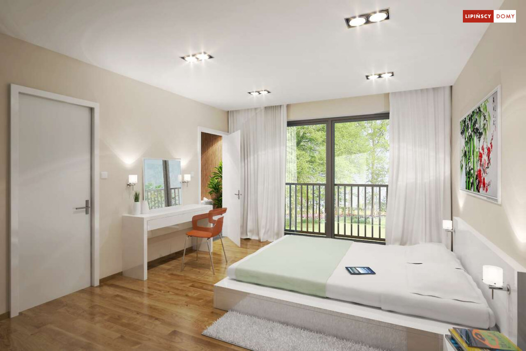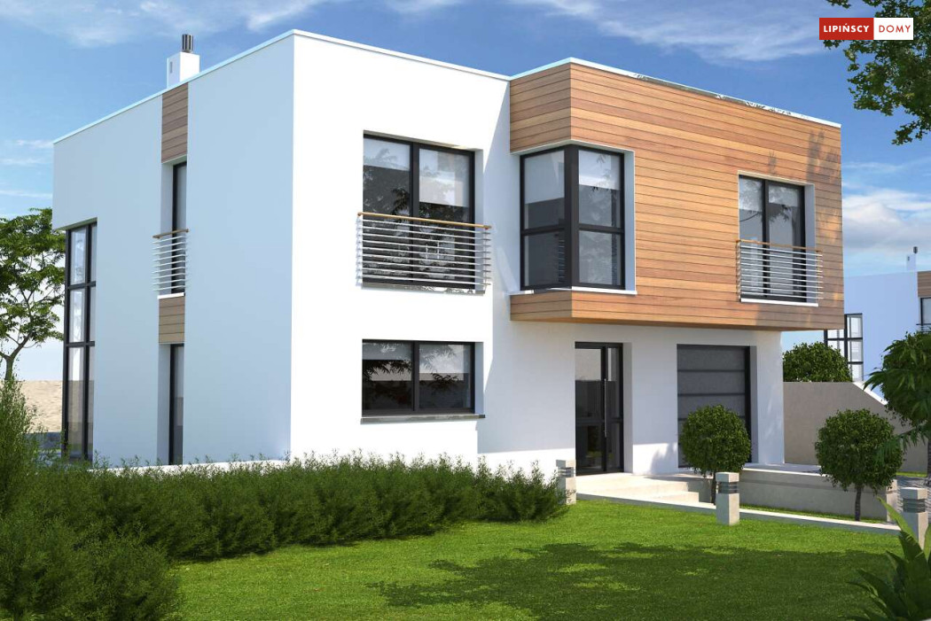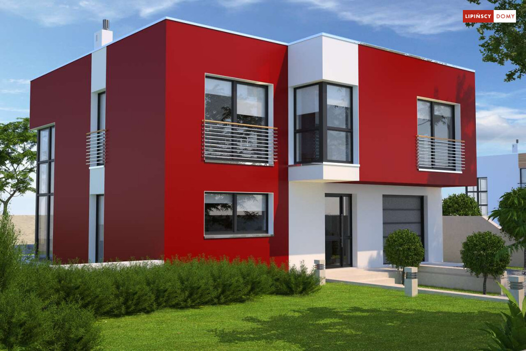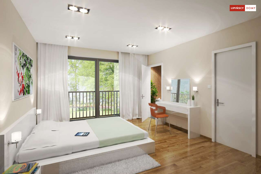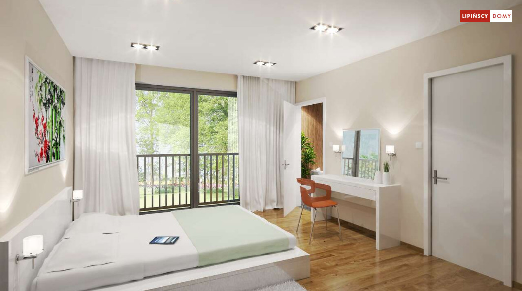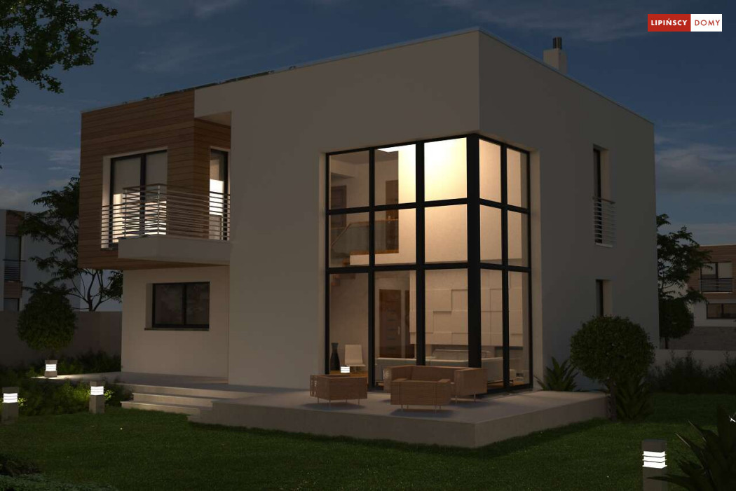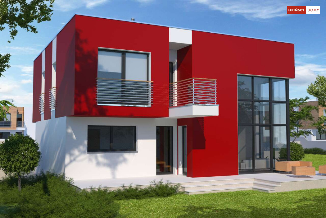 Nowoczesny, elegancki dom energooszczędny, którego bryła, dzięki zastosowaniu mocnych akcentów kolorystycznych i nowoczesnych przeszkleń, jest wyjątkowa i spodoba się miłośnikom niebanalnych rozwiązań. Dla Inwestorów, ceniących bardziej tradycyjne rozwiązania przygotowano wersję elewacji w stonowanych kolorach, z drewnianymi i metalowymi elementami. Na parterze znajduje się salon z antresolą, ustawna kuchnia z miejscem na rodzinny stół, spiżarnia i wc. Drugą kondygnację zajmują trzy sypialnie, w tym jedna z niezależną łazienką, i wspólna łazienka. Duże przeszklenia w salonie doskonale doświetlają wnętrze i są bardzo charakterystycznym elementem bryły.