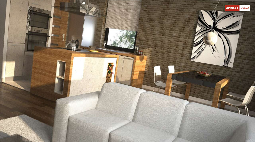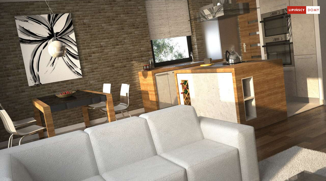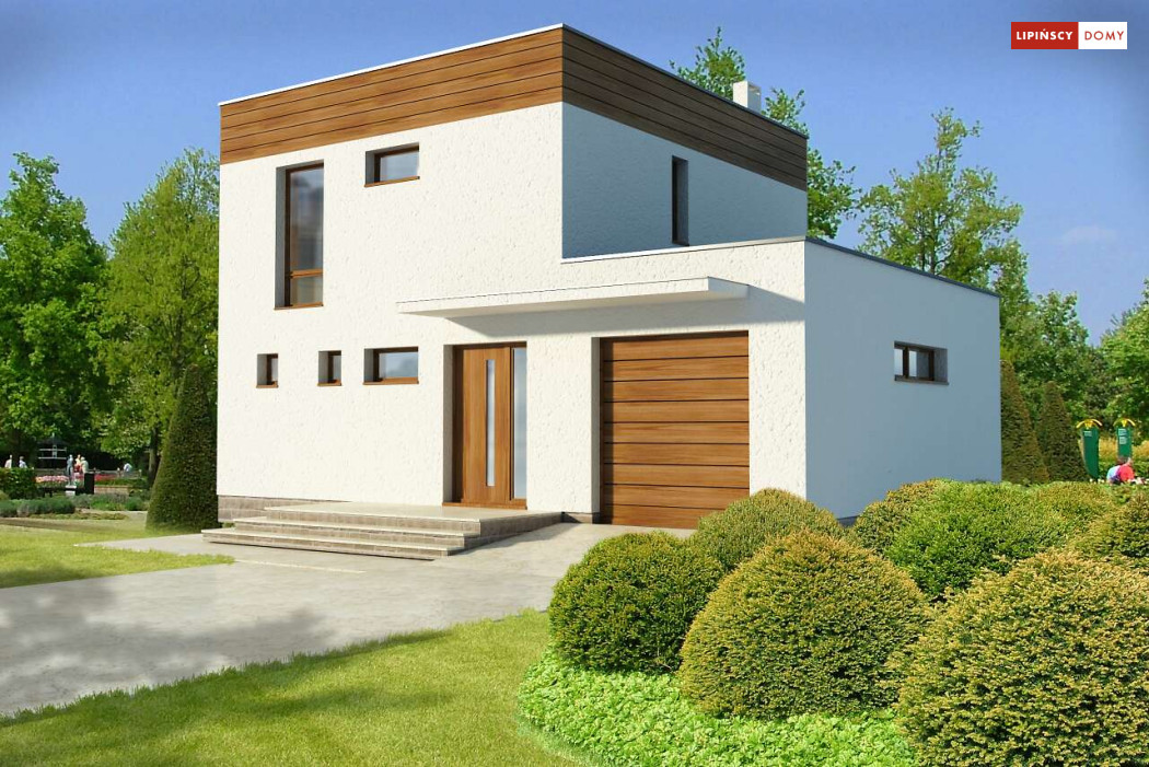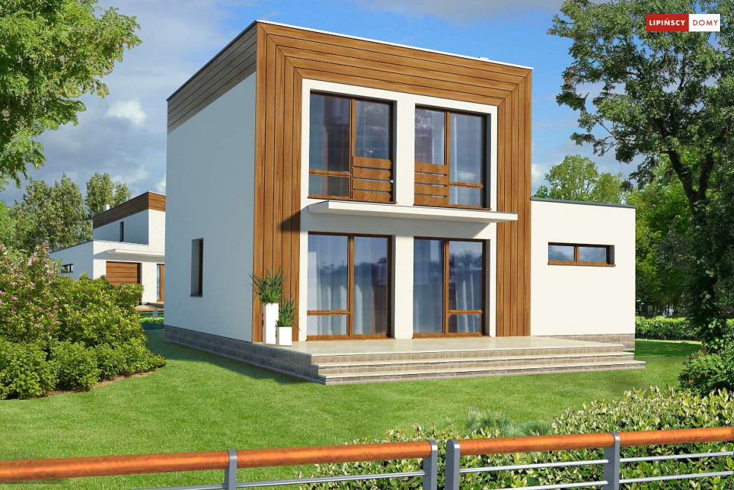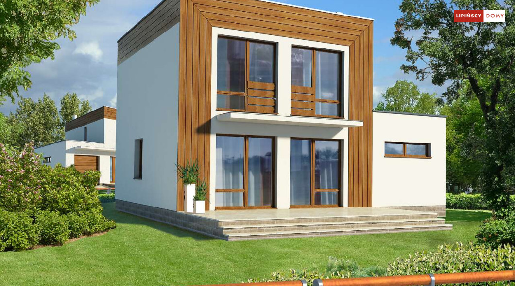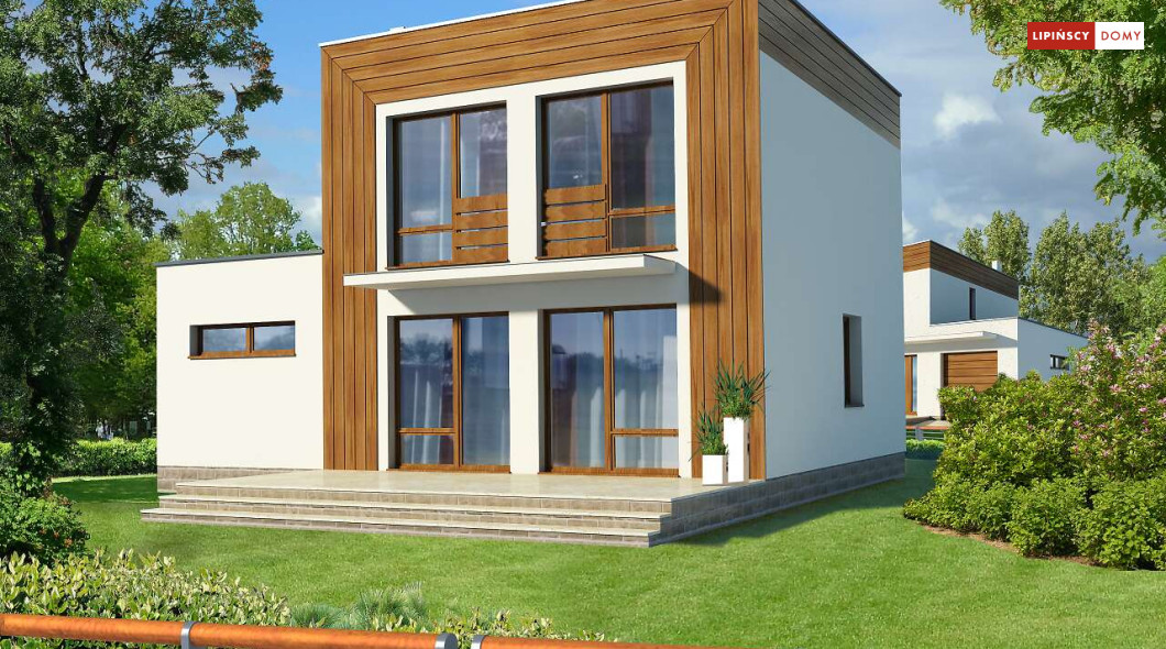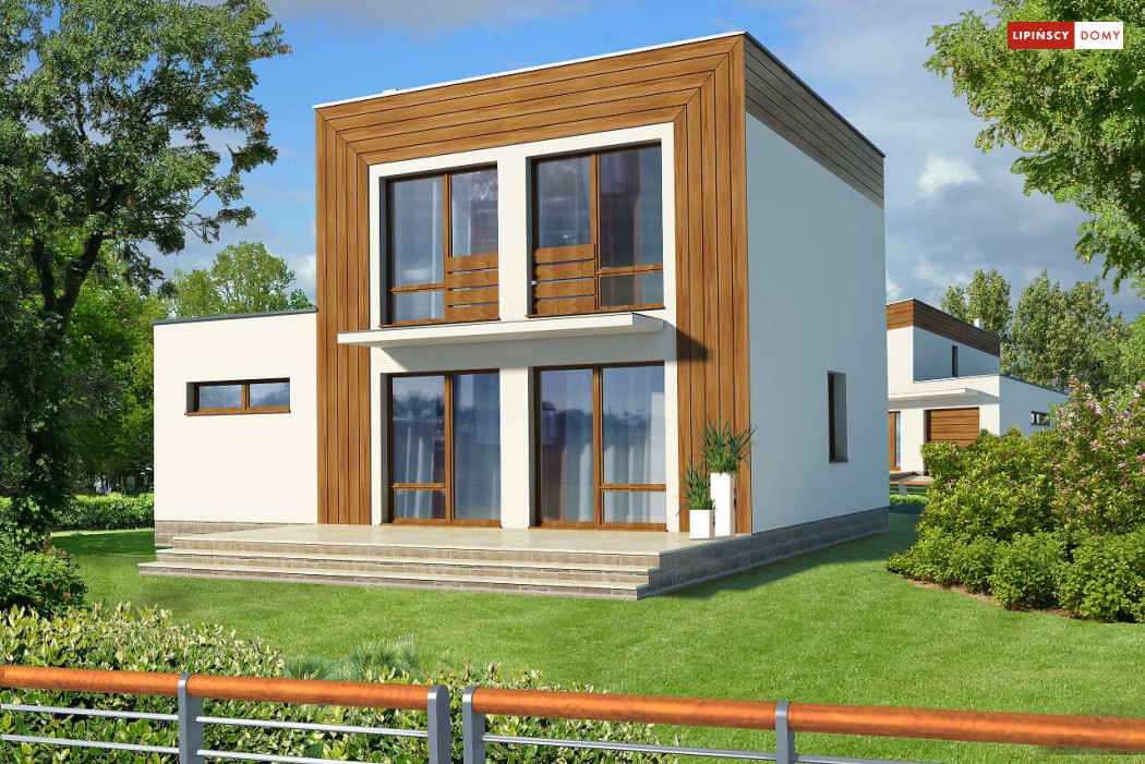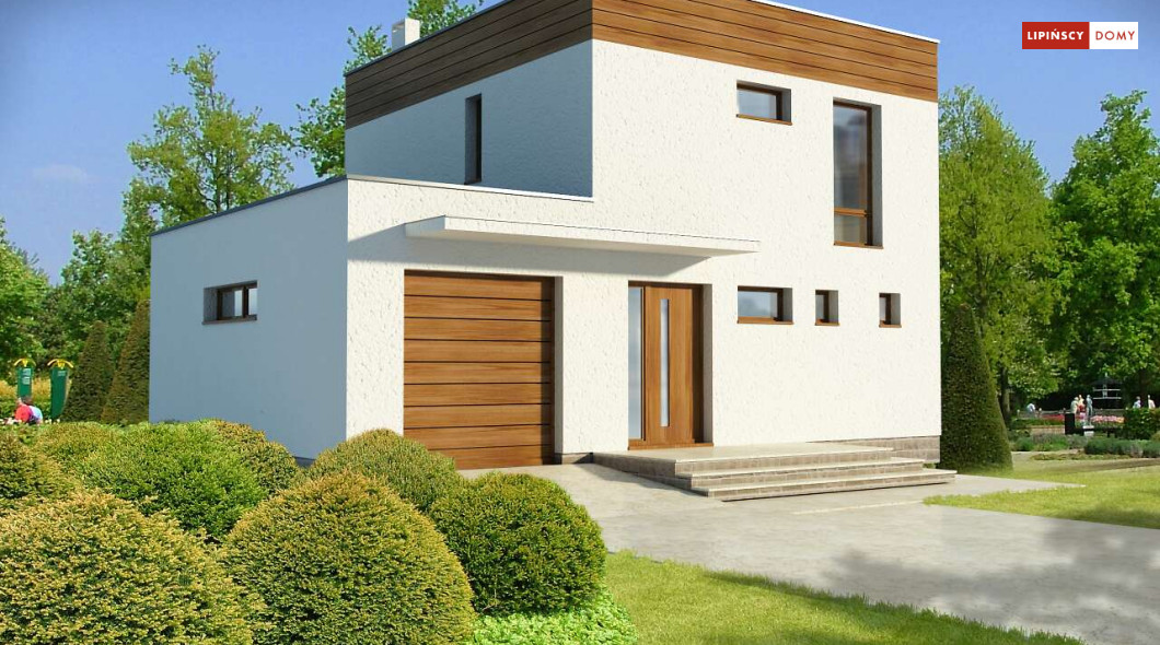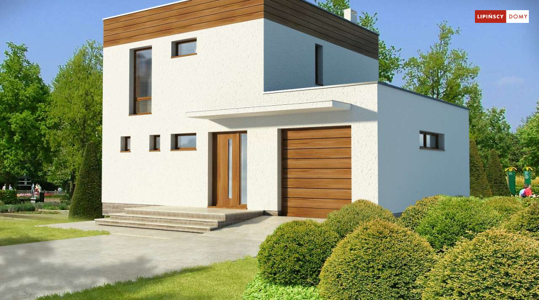 Funkcjonalny i nowoczesny dom jednorodzinny z płaskim dachem, przewidziany w standardzie energooszczędnym, idealny dla niewielkiej rodziny. Parter w całości przeznaczono na jedną część wspólną, do której należy kuchnia, jadalnia i salon z przeszklonym wyjściem na taras. Kręcone schody dodają pomieszczeniu uroku i prowadzą na drugą kondygnację, gdzie znajdują się trzy sypialnie i łazienka. W zwartą, prostą bryłę domu wpisano garaż na jedno auto, za którym znajduje się kotłownia.