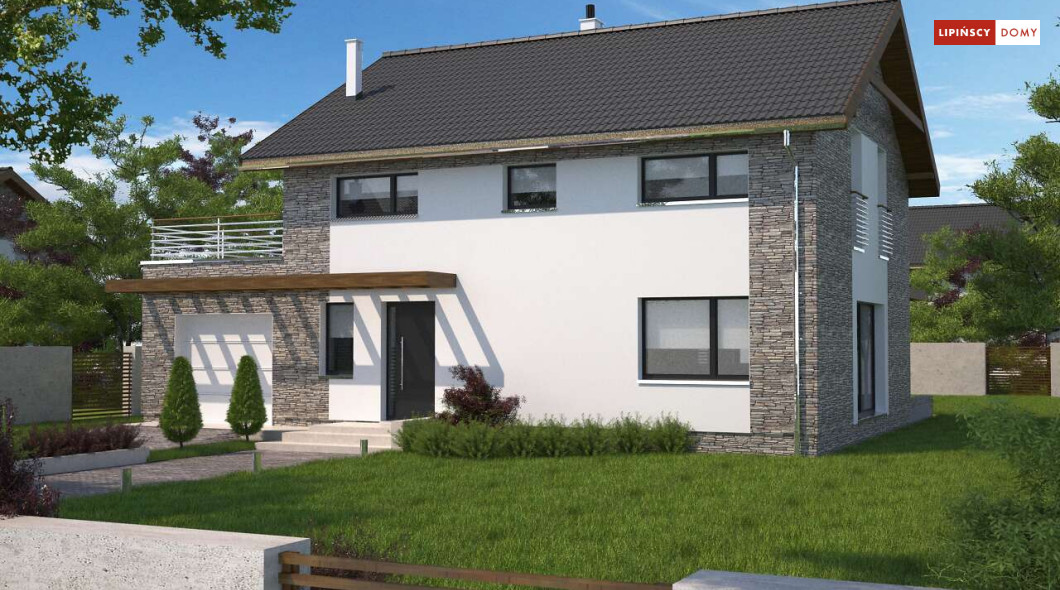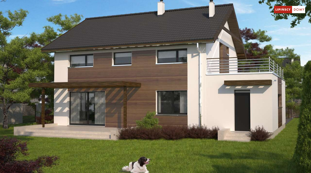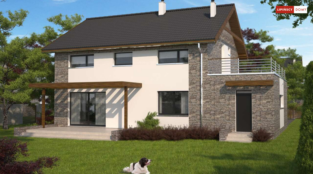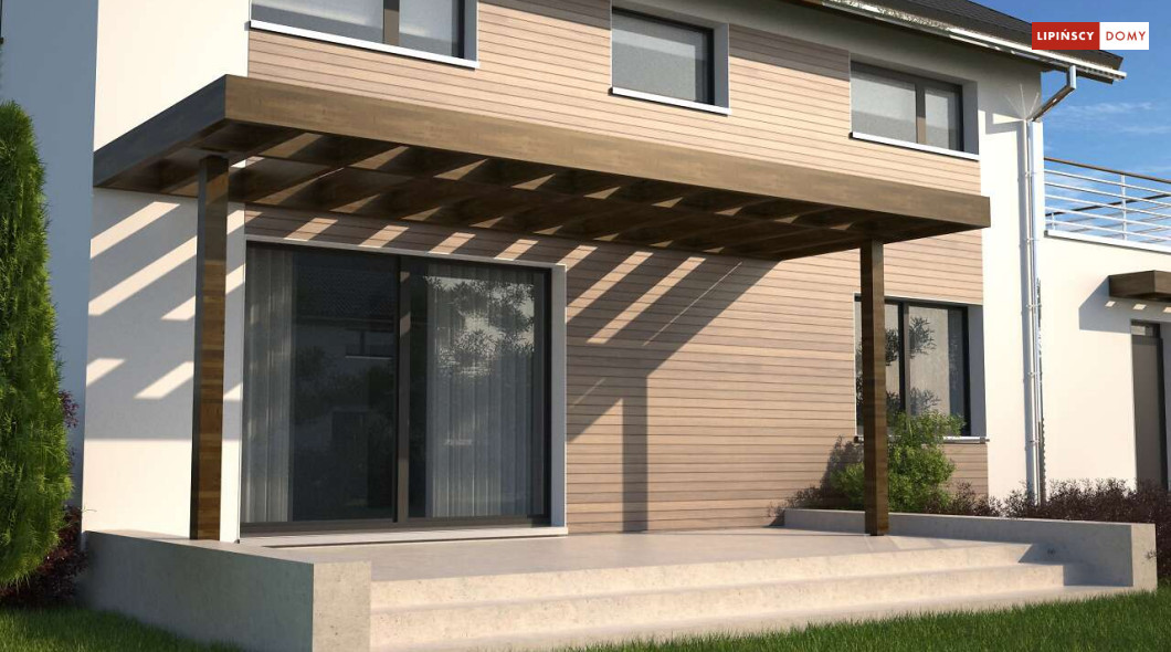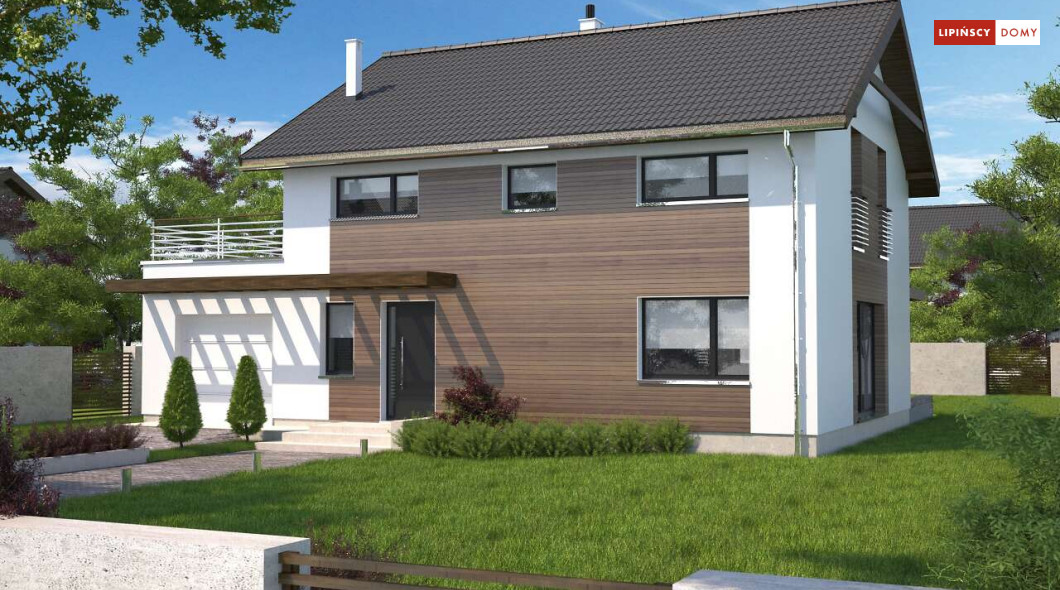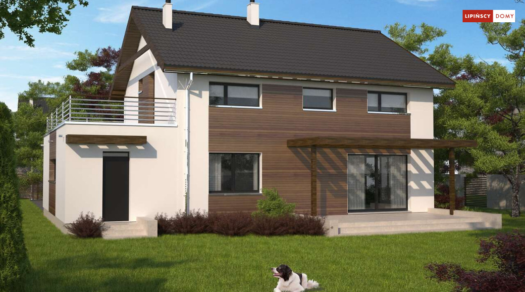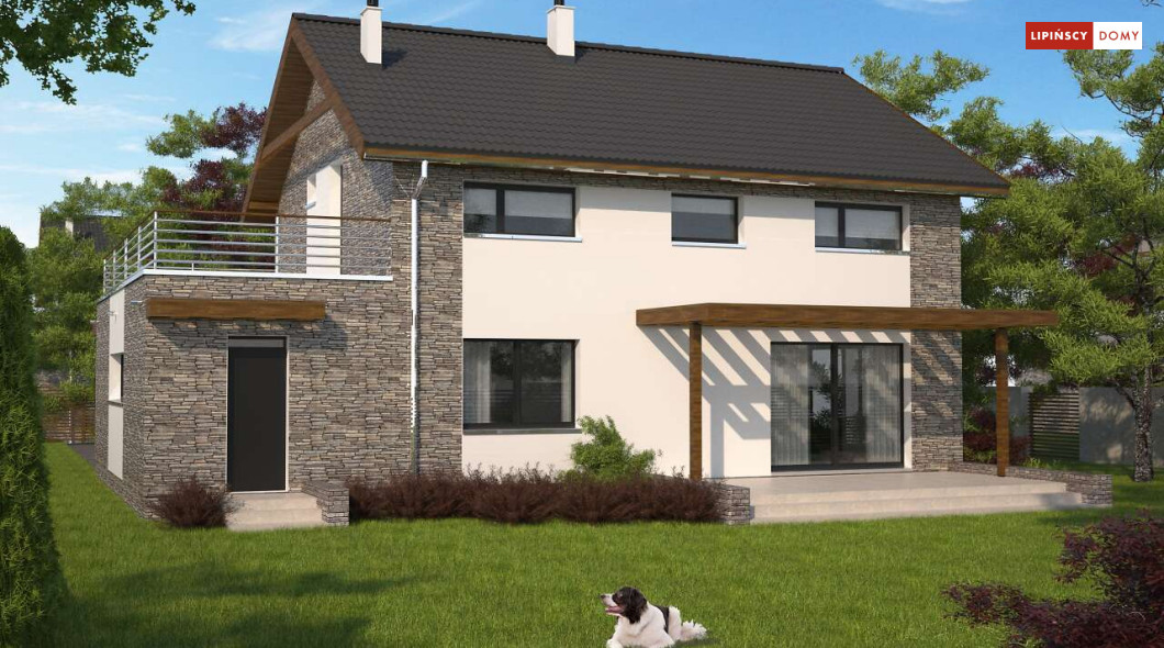 Wygodny dom energooszczędny z użytkowym poddaszem, kolejna wersja Nikko (DCP264), w której zrezygnowaliśmy z wykusza w pokoju dziennym oraz zaplanowaliśmy dodatkową sypialnię na poddaszu. Do dyspozycji mieszkańców jest więc część wspólna na parterze, z salonem z kominkiem, kuchnią ze spiżarnią, gabinetem, łazienką i wc oraz część nocna na poddaszu z czterema sypialniami, dwiema łazienkami i tarasem nad garażem. Zlokalizowana za garażem kotłownia ma niezależne wyjście na zewnątrz, a do garażu można wejść bezpośrednio z domu. Tras od strony ogrodowej został ozdobiony pergolą, która także chroni przed nadmiernym słońcem.