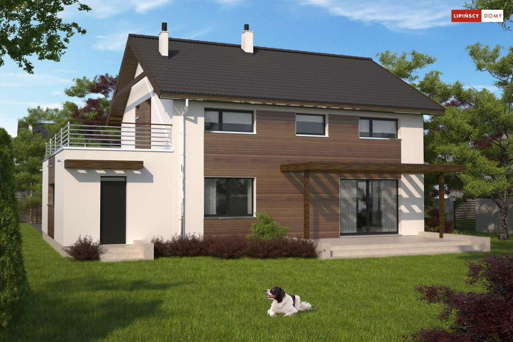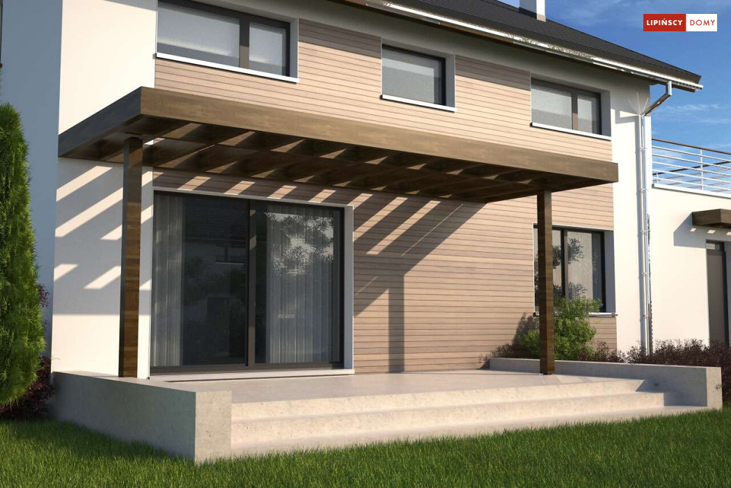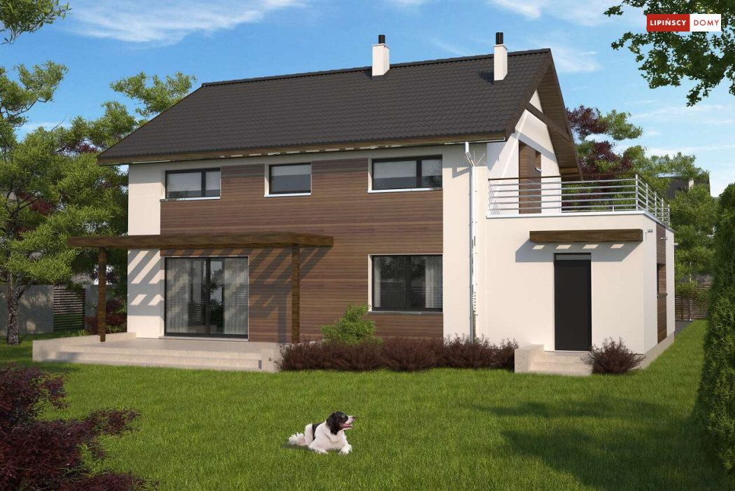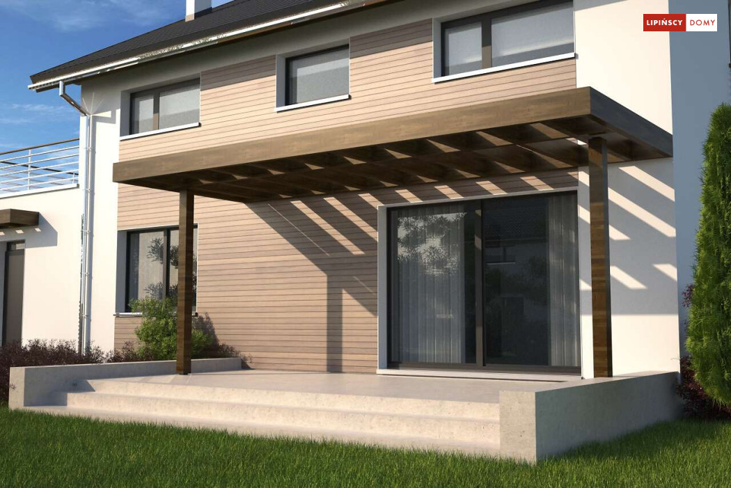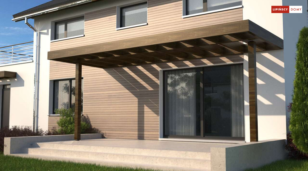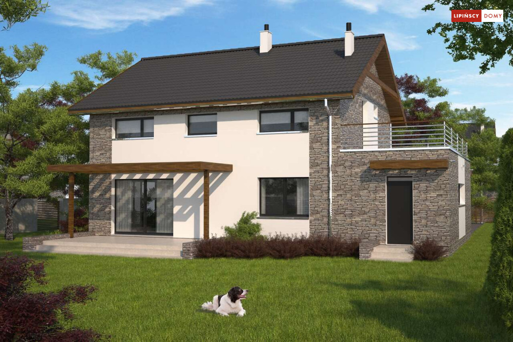 Wygodny dom energooszczędny z użytkowym poddaszem, kolejna wersja Nikko (DCP264), w której zrezygnowaliśmy z wykusza w pokoju dziennym oraz zaplanowaliśmy dodatkową sypialnię na poddaszu. Do dyspozycji mieszkańców jest więc część wspólna na parterze, z salonem z kominkiem, kuchnią ze spiżarnią, gabinetem, łazienką i wc oraz część nocna na poddaszu z czterema sypialniami, dwiema łazienkami i tarasem nad garażem. Zlokalizowana za garażem kotłownia ma niezależne wyjście na zewnątrz, a do garażu można wejść bezpośrednio z domu. Tras od strony ogrodowej został ozdobiony pergolą, która także chroni przed nadmiernym słońcem.