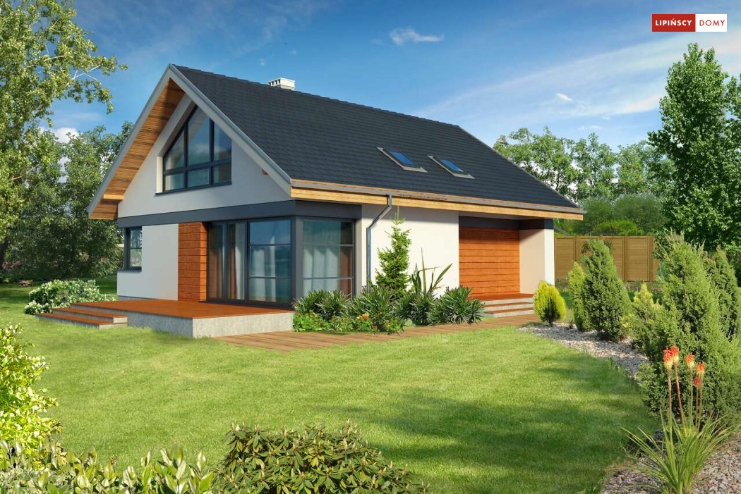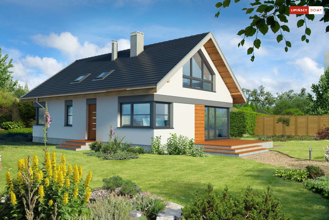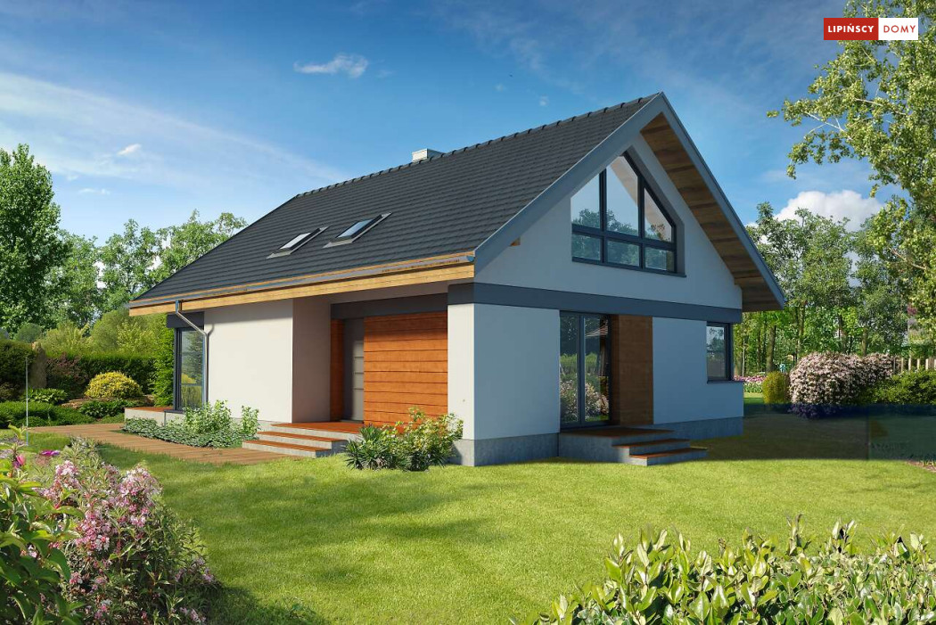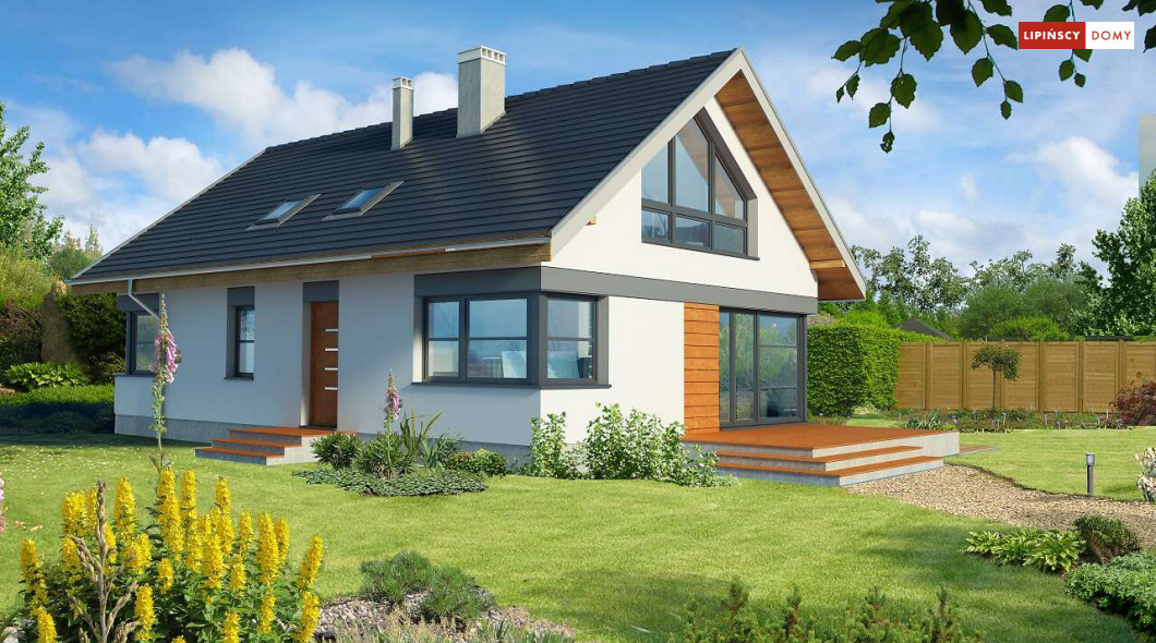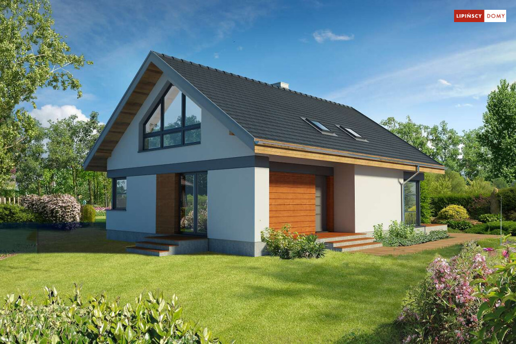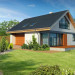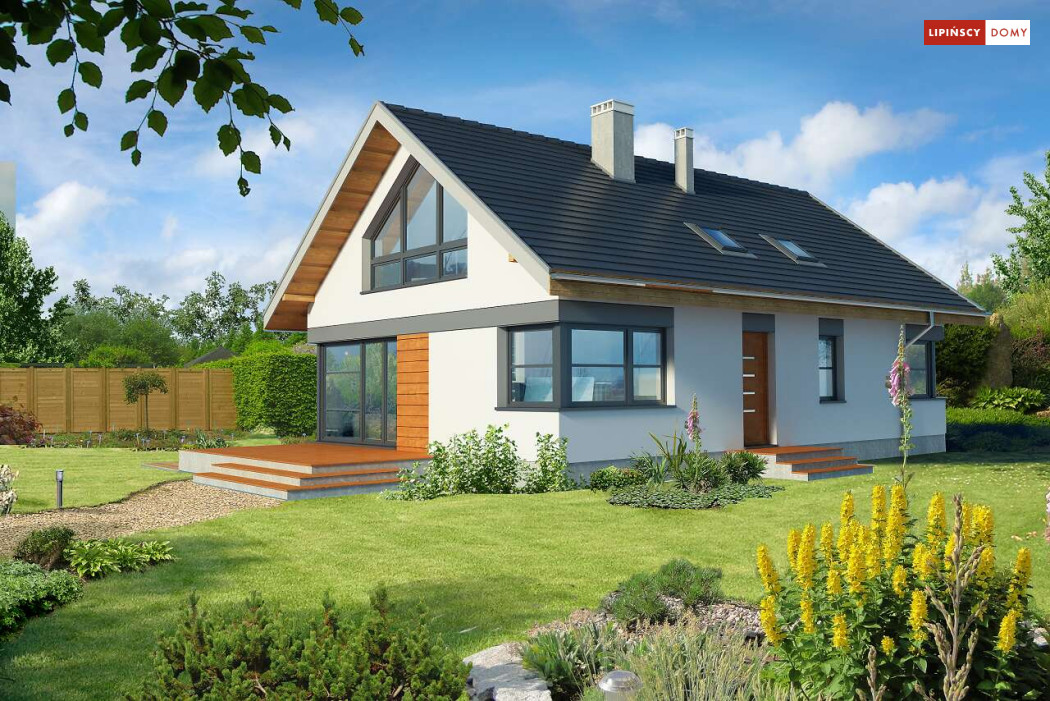 Ten projekt wyraźnie pasuje na działki z wjazdem od południa. Nowoczesny styl i prosto zarysowana bryła spodobają się miłośnikom czytelnych i prostych rozwiązań. Harmonijnie skomponowana elewacja z dodatkiem drewnianych elementów wykończenia jest lekka i czysta w odbiorze. Układ pomieszczeń to przestronna część dzienna, pięknie doświetlona oknami narożnymi. Dwie sypialnie na parterze pozwalają na etapową budowę domu. Plusem tego domu jest także to, że wszystkie pomieszczenia sanitarne są usytuowane w jednej części domu, co pozwala zaoszczędzić na instalacjach.