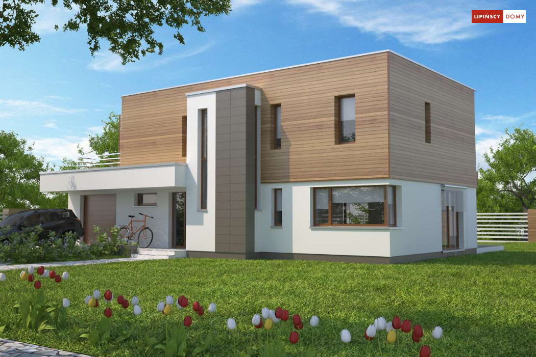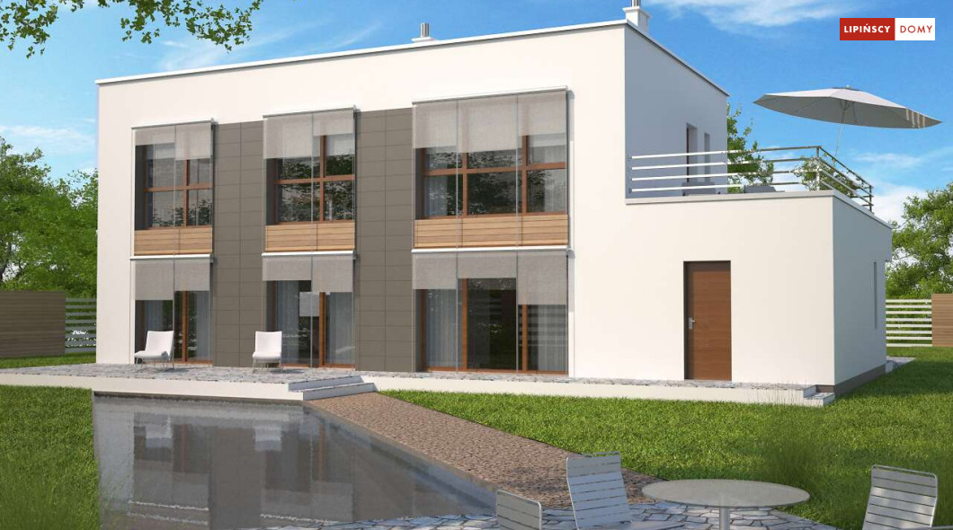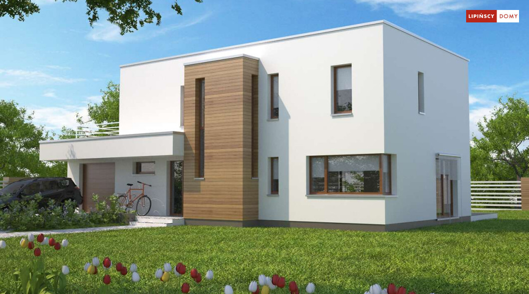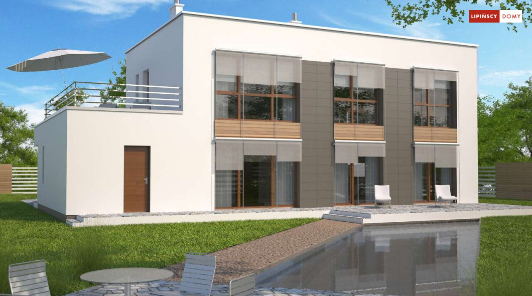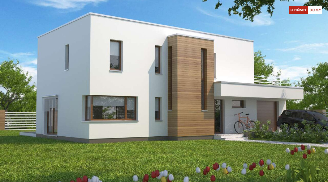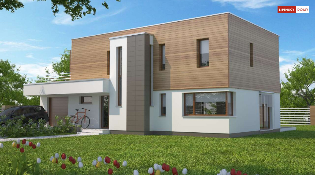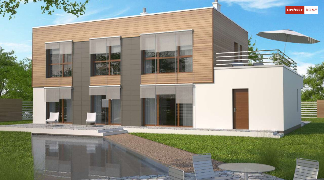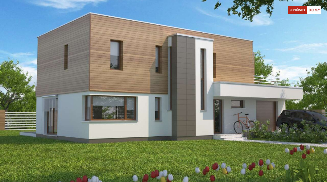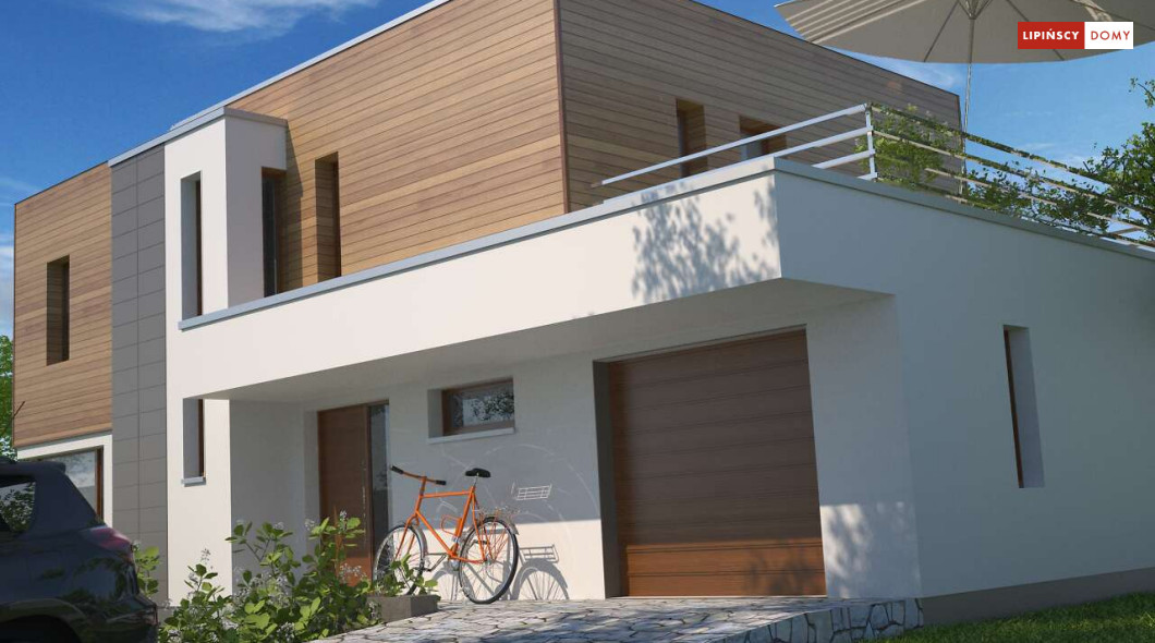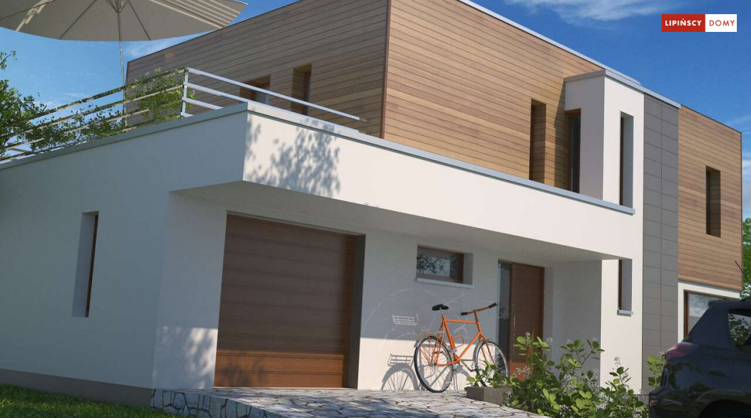 Nowoczesny dom energooszczędny z pełnym piętrem o bardzo funkcjonalnie zaplanowanych pomieszczeniach. Na uwagę zasługuje osobny apartament rodziców z własną garderobą i łazienką – obie oświetlone naturalnym światłem. Z apartamentu dostępny jest taras nad garażem. Przestronna część dzienna z salonem i jadalnią, a także dodatkowy pokój na parterze otwiera się na ogród, dzięki dużym przeszkleniom. Do garażu można przejść bezpośrednio z ładnie doświetlonego wiatrołapu z dużą szafą.