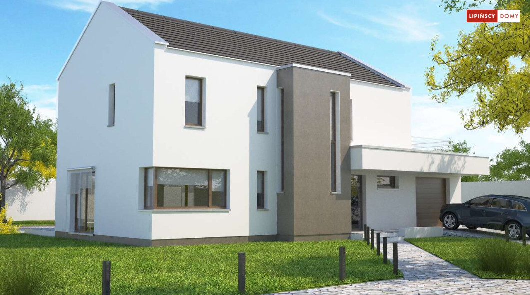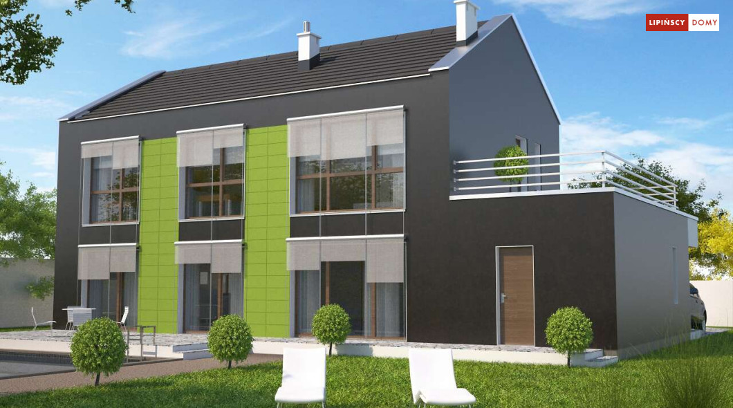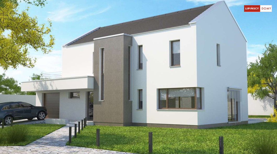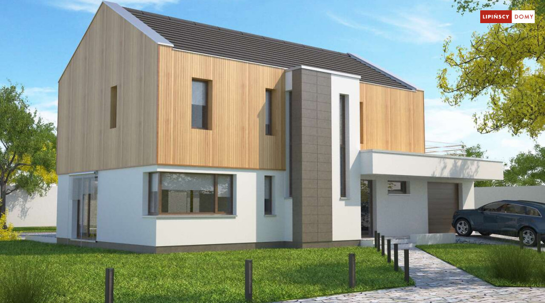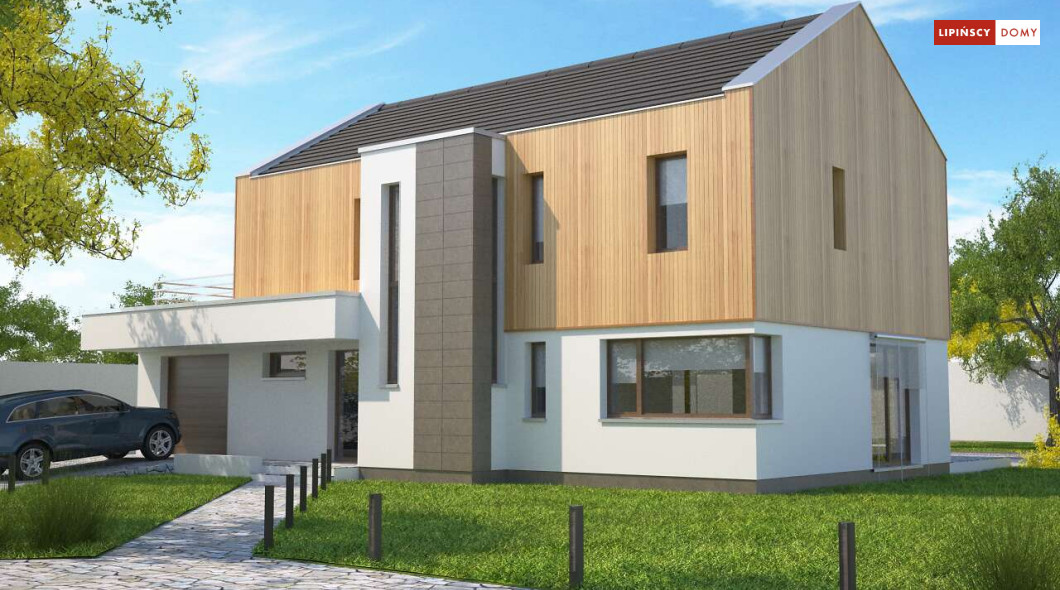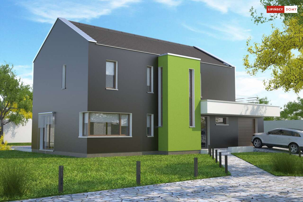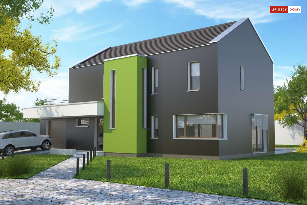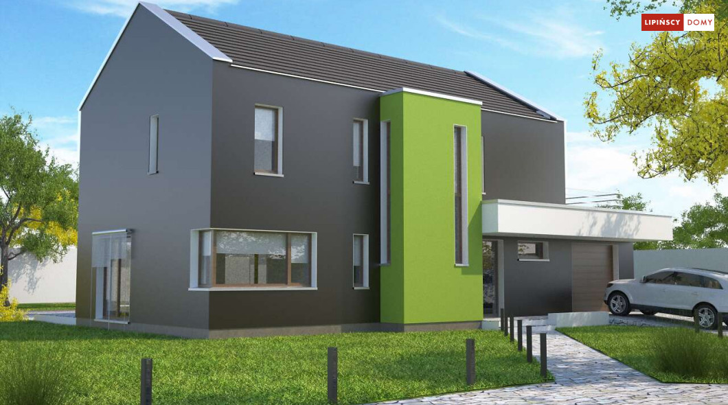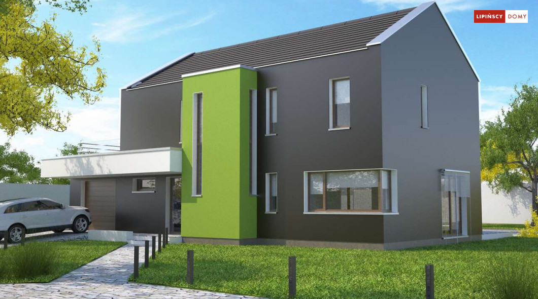 Kolejna, ciekawa odsłona projektu Santos, w którym wprowadzono dach spadzisty i przykuwającą wzrok czarną elewację, urozmaiconą zielonymi wstawkami. Wnętrza natomiast to bardzo funkcjonalny układ części dziennej, z nowoczesnym, otwartym salonem i dodatkowym pokojem, mogącym pełnić funkcję gabinetu. Na piętrze znajdują się trzy sypialnie, usytuowane od strony południowej. Największa z nich posiada osobną łazienkę i garderobą, a także wyjście na taras nad garażem. W domu znajduje się także szereg praktycznych pomieszczeń, jak pralnia spiżarnia, czy pomieszczenie techniczne za garażem. Dostępna jest również wersja projektu z podwójnym garażem, na wąska działkę.