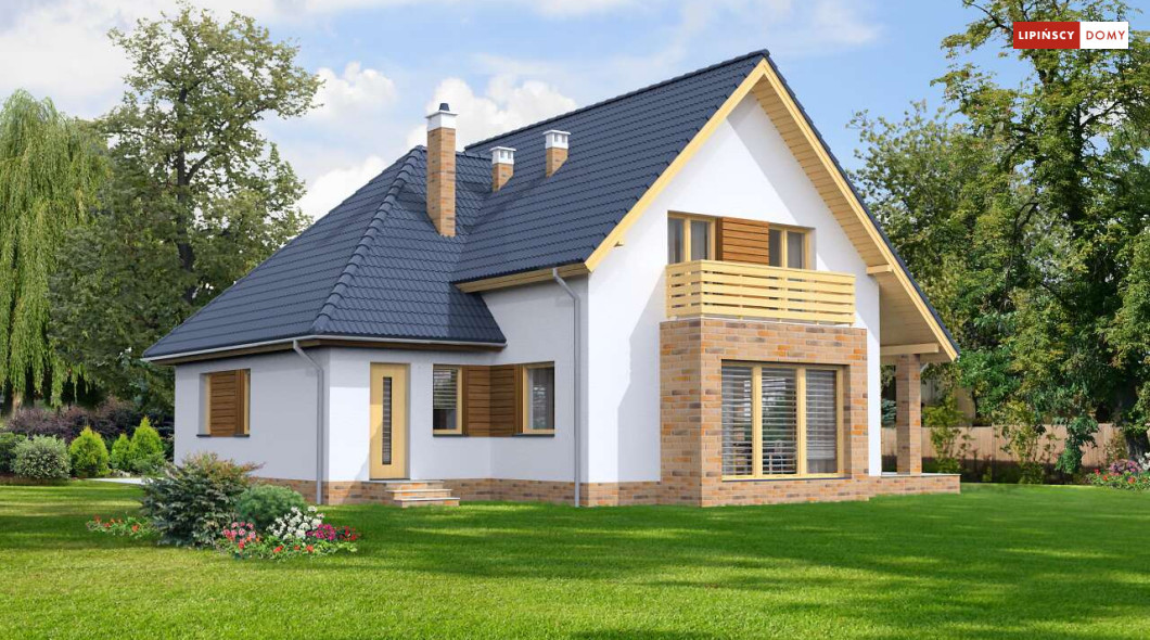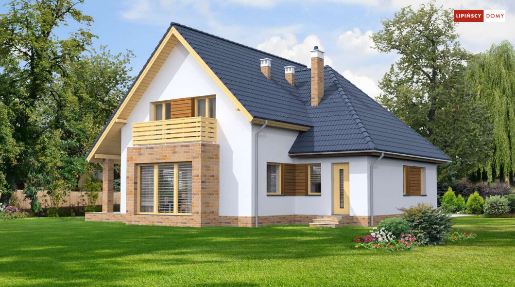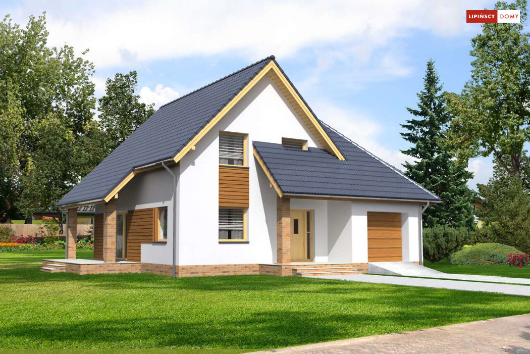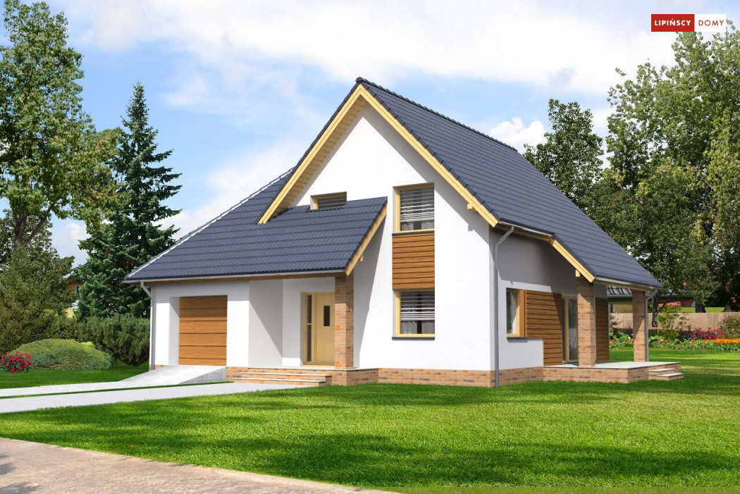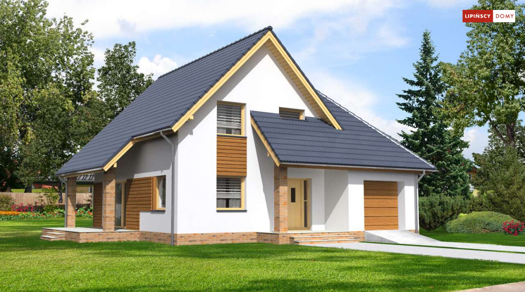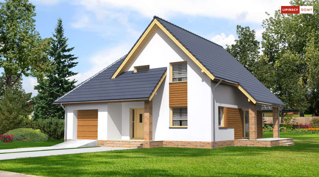 Klasyczny niewielki dom, w którym zmieścił się dodatkowy pokój na parterze. Dzięki usytuowaniu przy wejściu, może nadawać się na biuro, czy gabinet do pracy. Z wiatrołapu prowadzi bezpośrednie przejście do garażu, a następnie do kotłowni, w której można zastosować piec na paliwo stałe. Strefa dzienna to otwarta, wspólna przestrzeń salonu, jadalni i kuchni, z którą sąsiaduje mała spiżarnia pod schodami.