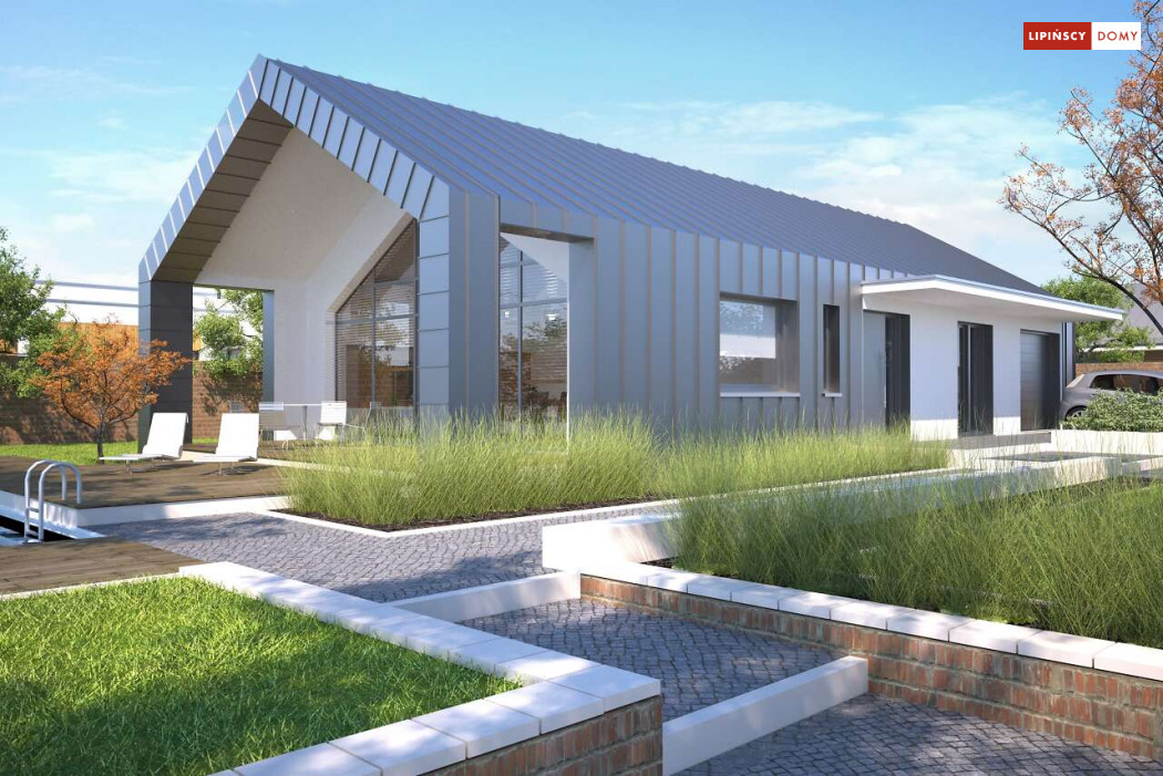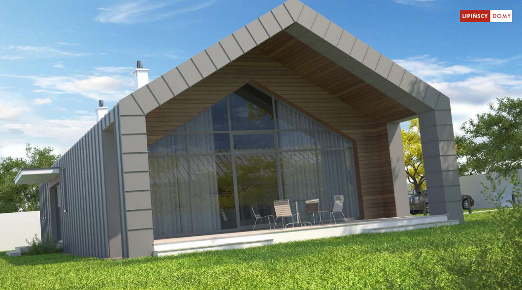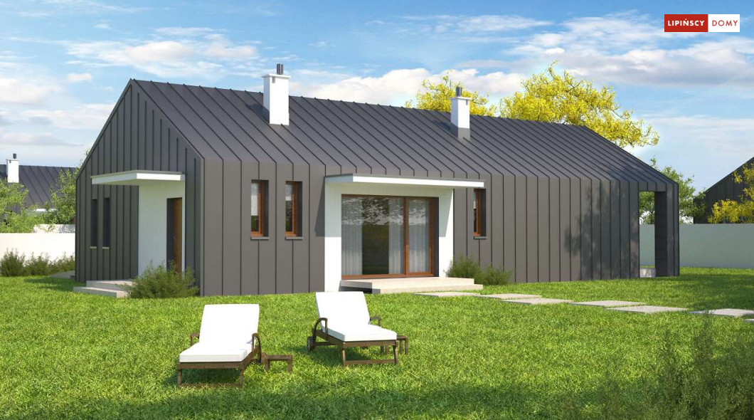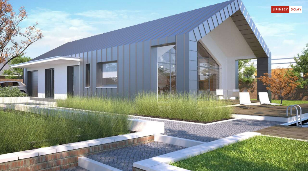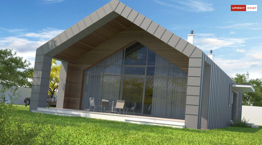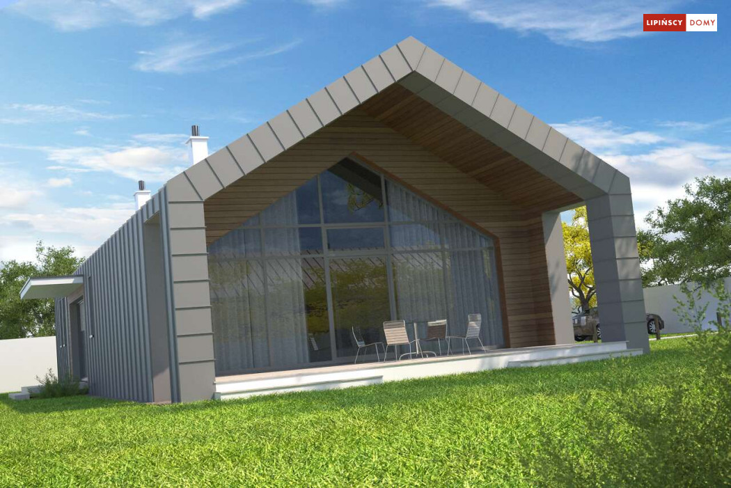 Kompaktowy parterowy dom o wyrazistym, nowoczesnym charakterze. Jest doskonały na działki z wjazdem od wschodu. Taras tego domu jest usytuowany z boku i tworzy wraz z zadaszeniem pokrytym drewnem intrygującą, przestronną przestrzeń. Stylistyka domu jest skierowana do osób o niestandardowych potrzebach estetycznych, dla tych którzy chcą się wyróżnić i podkreślić swoją oryginalność. Jednocześnie jest to dom o niewielkich parametrach powierzchniowych przez co jest atrakcyjny dla ludzi młodych i dla niewielkich rodzin. Wygodnie rozplanowany dom mieści w sobie przestrzeń pokoju dziennego, kuchnię z jadalnia i spiżarką, łazienkę i dwa pokoje, przy czym sypialnia większa ma niepowtarzalny charakter, dzięki dużym przeszkleniom. Dostępna jest również wersja tego projektu z płaskim dachem.