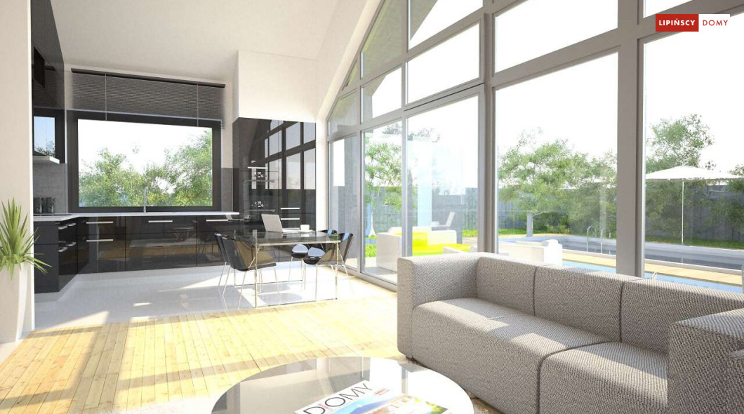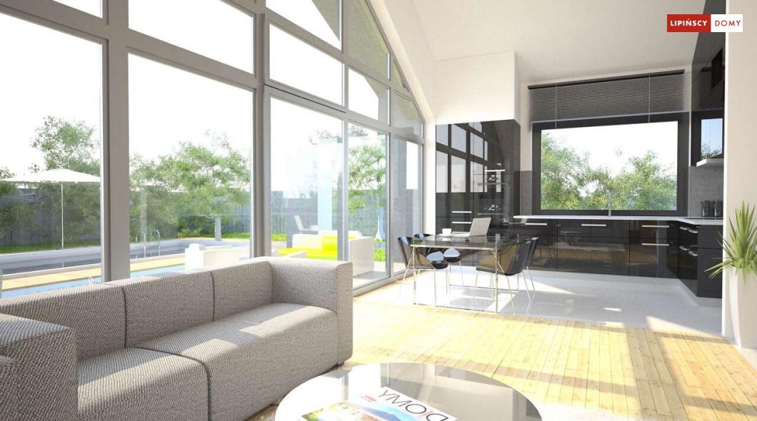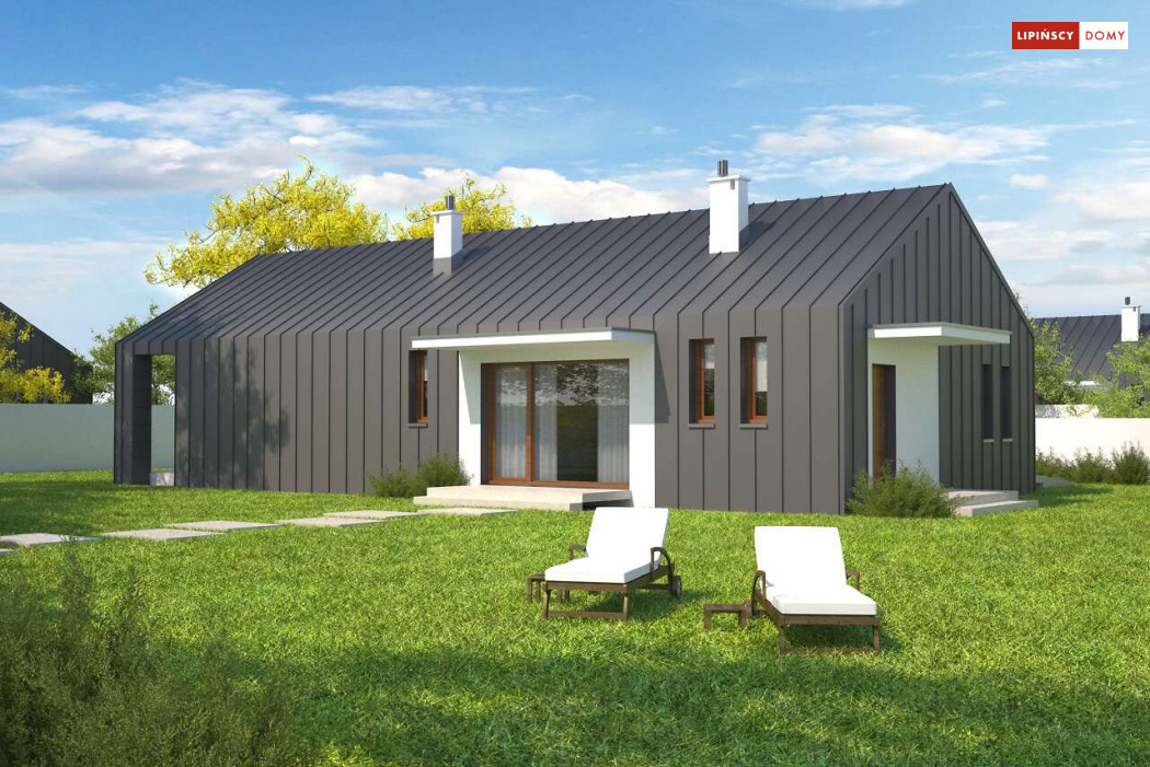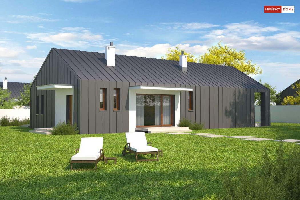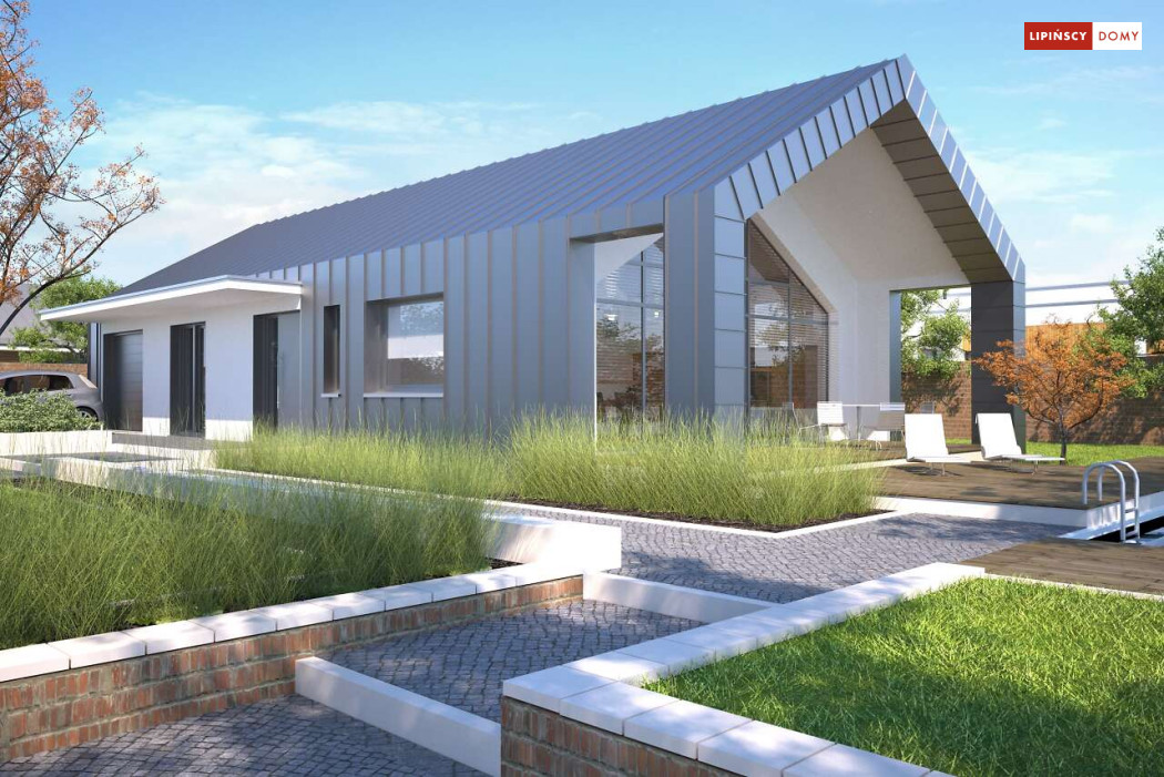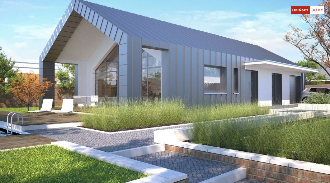 Kompaktowy parterowy dom o wyrazistym, nowoczesnym charakterze. Jest doskonały na działki z wjazdem od wschodu. Taras tego domu jest usytuowany z boku i tworzy wraz z zadaszeniem pokrytym drewnem intrygującą, przestronną przestrzeń. Stylistyka domu jest skierowana do osób o niestandardowych potrzebach estetycznych, dla tych którzy chcą się wyróżnić i podkreślić swoją oryginalność. Jednocześnie jest to dom o niewielkich parametrach powierzchniowych przez co jest atrakcyjny dla ludzi młodych i dla niewielkich rodzin. Wygodnie rozplanowany dom mieści w sobie przestrzeń pokoju dziennego, kuchnię z jadalnia i spiżarką, łazienkę i dwa pokoje, przy czym sypialnia większa ma niepowtarzalny charakter, dzięki dużym przeszkleniom. Dostępna jest również wersja tego projektu z płaskim dachem.