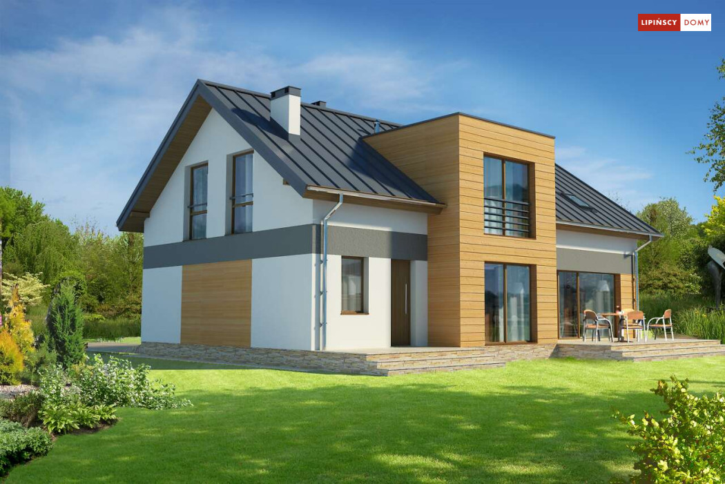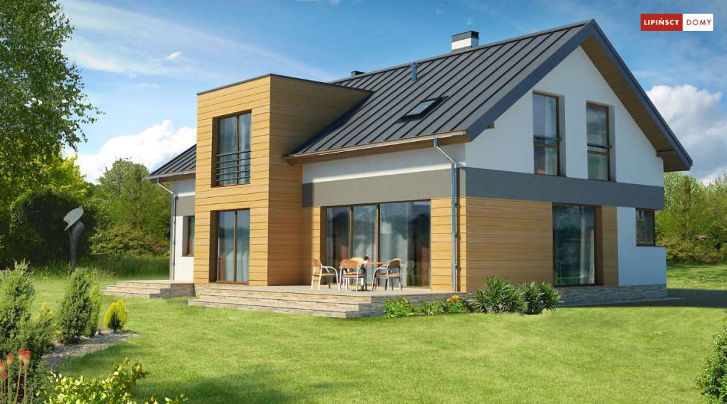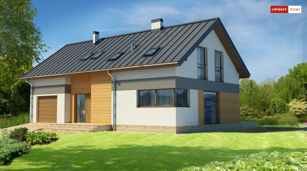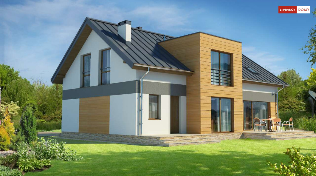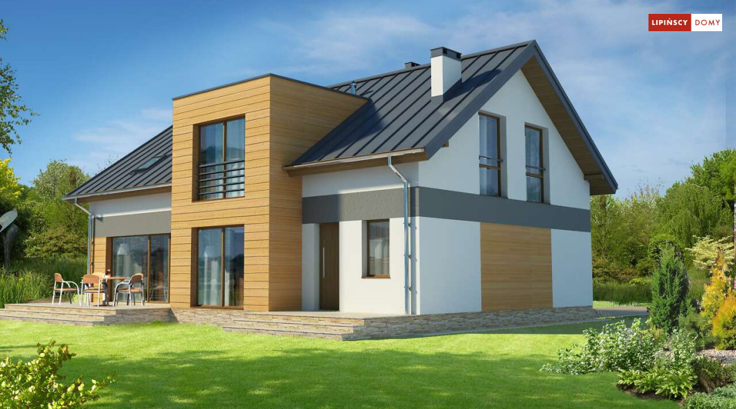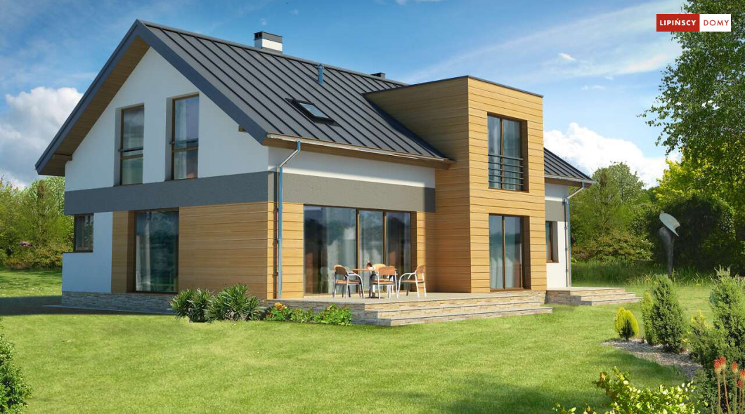 Domy z dachami dwuspadowymi mają w sobie elegancki urok prostoty. Jeśli jeszcze zastosuje się odpowiednie materiały wykończeniowe, z prostego domu robi się nowoczesny dom na miarę XXI wieku. Wnętrza tego domu są także rozwiązane bardzo pomysłowo i praktycznie. Schody zostały umieszczone nieco z boku, a jednocześnie w części dziennej domu, a przestrzeń pod nimi została praktycznie wykorzystana na spiżarnię. Do garażu można przejść bezpośrednio z wiatrołapu, co jest bardzo wygodne. Na poddaszu znajdują się aż cztery sypialnie, więc spokojnie może w nim zamieszkać rodzina wielodzietna, w razie potrzeby wykorzystując na sypialnię jeszcze dodatkowy pokój na parterze.<br>