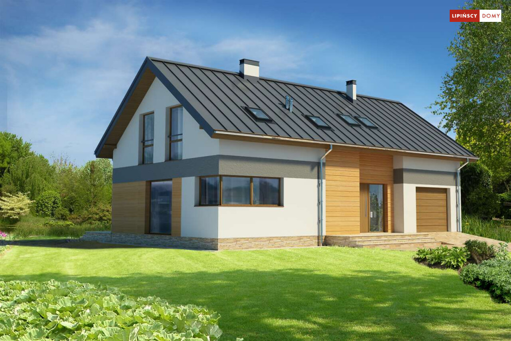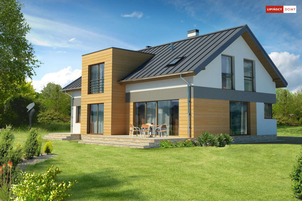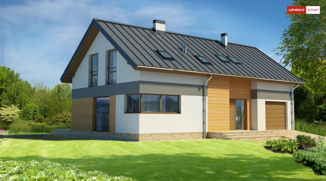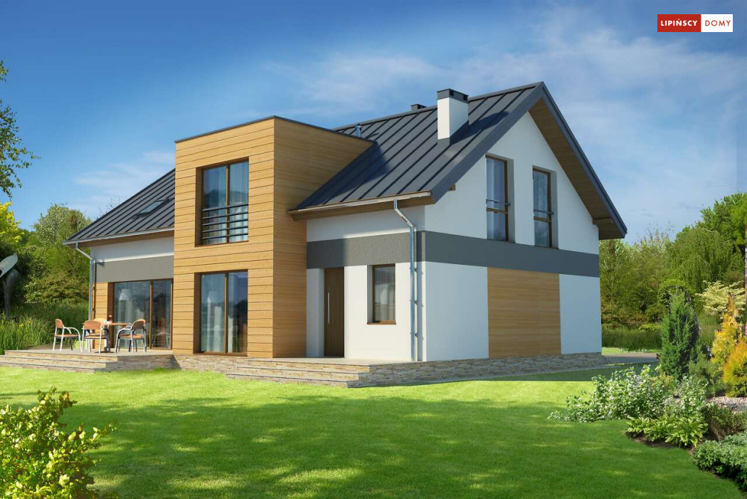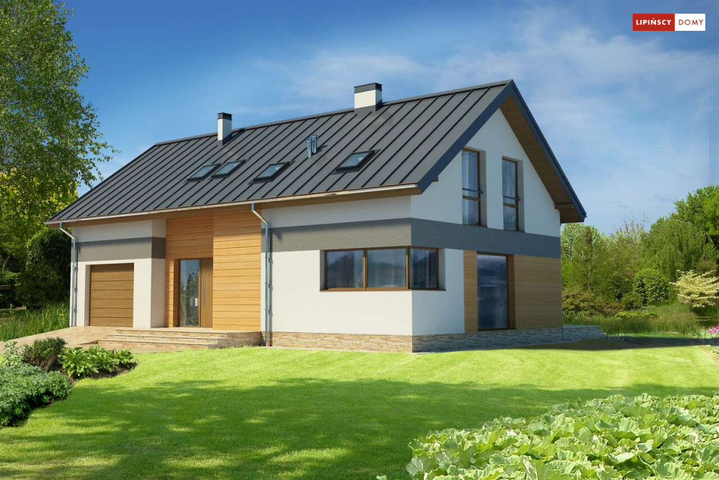 Domy z dachami dwuspadowymi mają w sobie elegancki urok prostoty. Jeśli jeszcze zastosuje się odpowiednie materiały wykończeniowe, z prostego domu robi się nowoczesny dom na miarę XXI wieku. Wnętrza tego domu są także rozwiązane bardzo pomysłowo i praktycznie. Schody zostały umieszczone nieco z boku, a jednocześnie w części dziennej domu, a przestrzeń pod nimi została praktycznie wykorzystana na spiżarnię. Do garażu można przejść bezpośrednio z wiatrołapu, co jest bardzo wygodne. Na poddaszu znajdują się aż cztery sypialnie, więc spokojnie może w nim zamieszkać rodzina wielodzietna, w razie potrzeby wykorzystując na sypialnię jeszcze dodatkowy pokój na parterze.<br>
