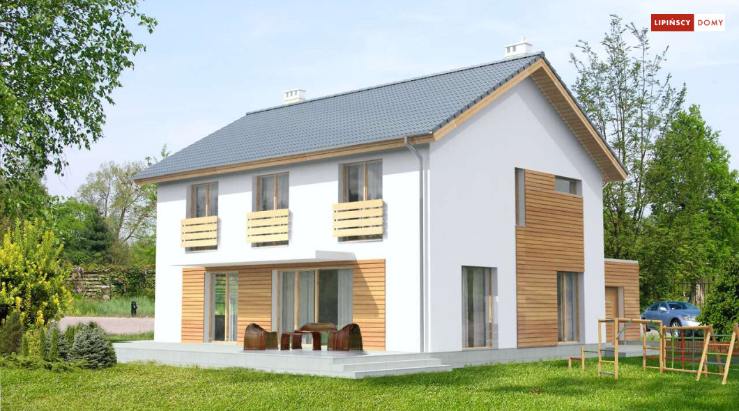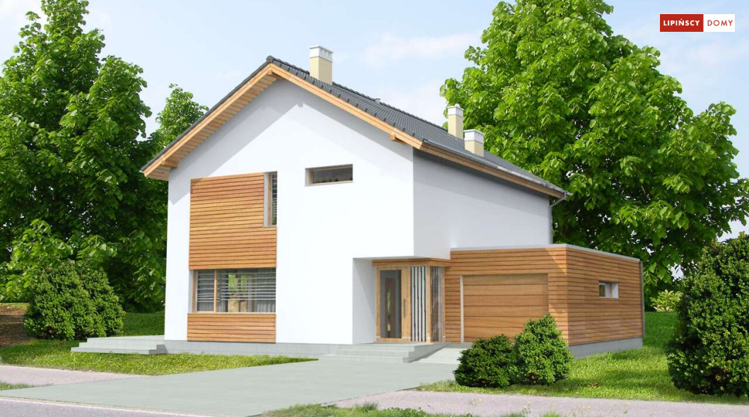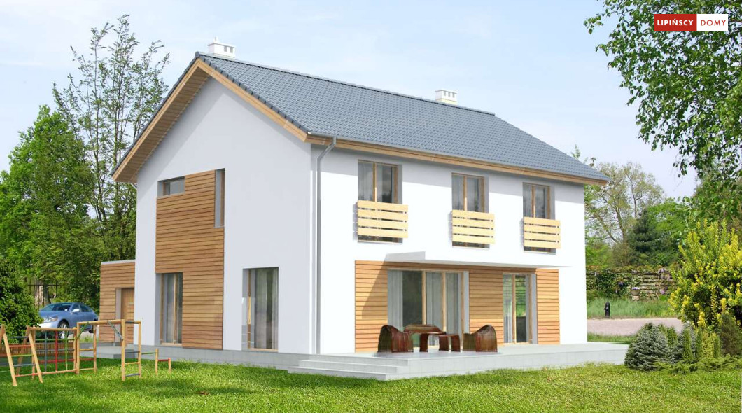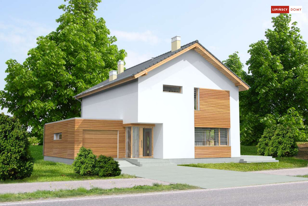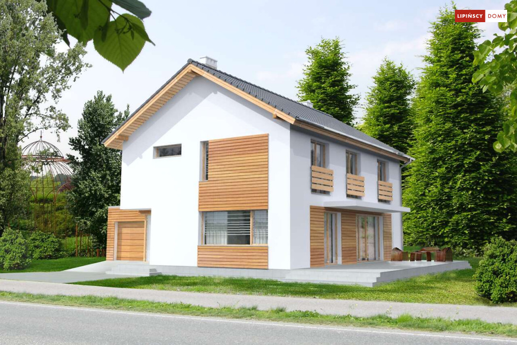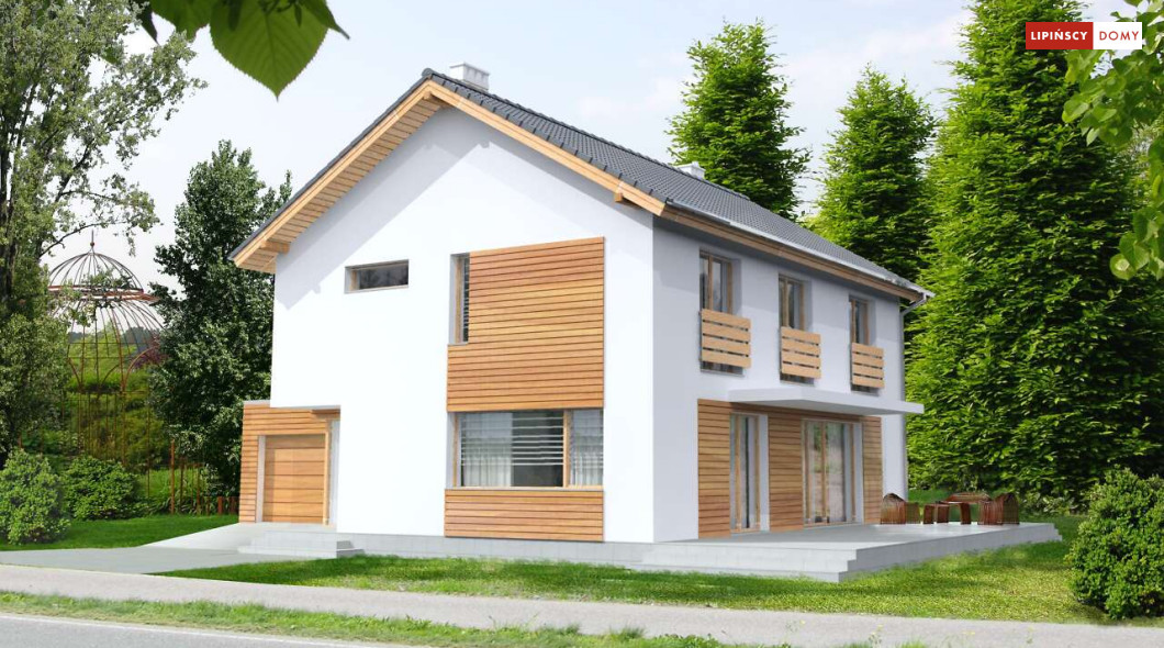 Ładny, nowoczesny w wyrazie dom z pełnym piętrem. Jest niedrogą i wygodną ofertą na małe, spójne osiedla domów. Wykorzystane na elewacjach drewno uatrakcyjnia prostą bryłę i nadaje mu przytulnego charakteru, nawiązującego do stylistyki skandynawskiej. Wnętrze do bardzo komfortowa i przestrzenna część dzienna, którą dzięki przesuwnym drzwiom balkonowym można powiększyć o taras pełniący rolę letniego salonu. Na piętrze znajduje się apartament dla rodziców z garderobą i łazienką. Praktyczne jest też usytuowanie pralni/prasowalni na tym poziomie.