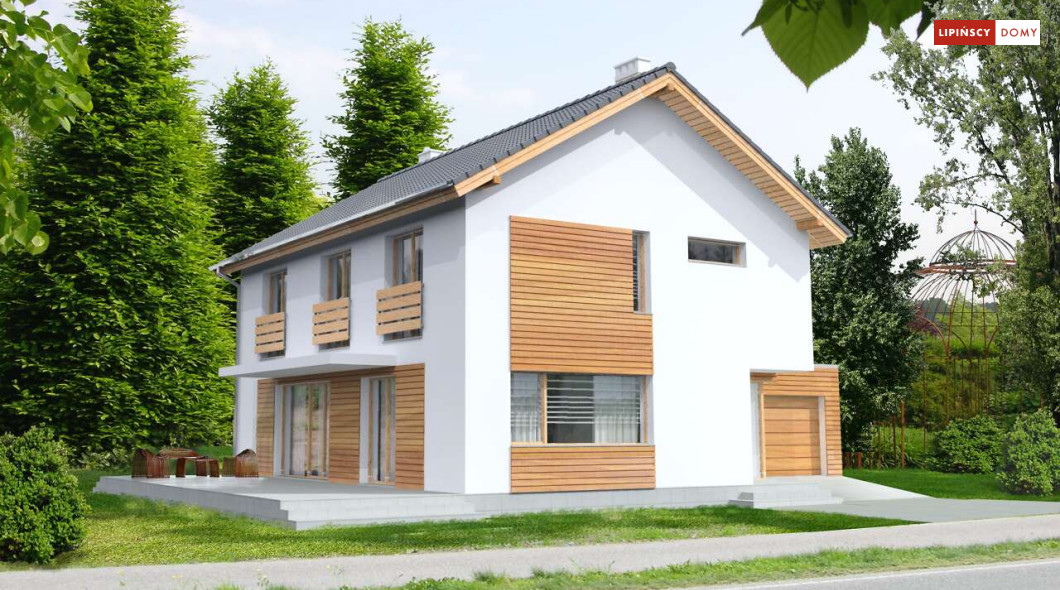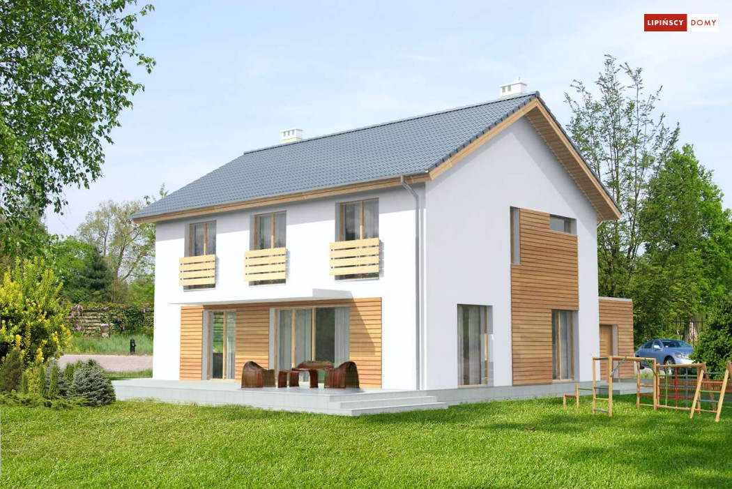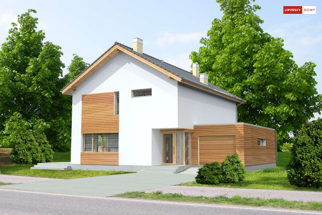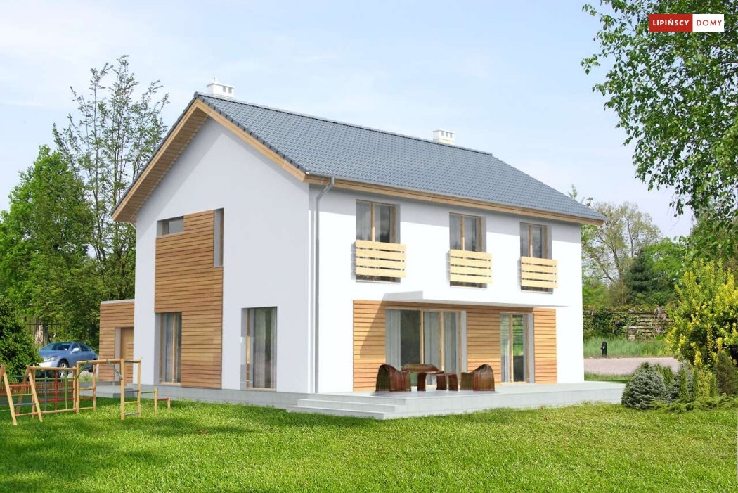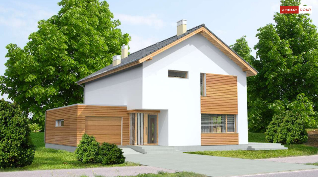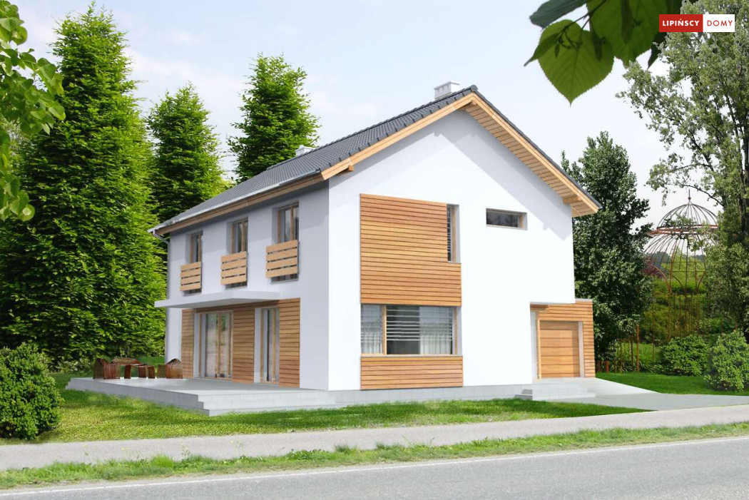 Ładny, nowoczesny w wyrazie dom z pełnym piętrem. Jest niedrogą i wygodną ofertą na małe, spójne osiedla domów. Wykorzystane na elewacjach drewno uatrakcyjnia prostą bryłę i nadaje mu przytulnego charakteru, nawiązującego do stylistyki skandynawskiej. Wnętrze do bardzo komfortowa i przestrzenna część dzienna, którą dzięki przesuwnym drzwiom balkonowym można powiększyć o taras pełniący rolę letniego salonu. Na piętrze znajduje się apartament dla rodziców z garderobą i łazienką. Praktyczne jest też usytuowanie pralni/prasowalni na tym poziomie.