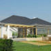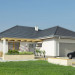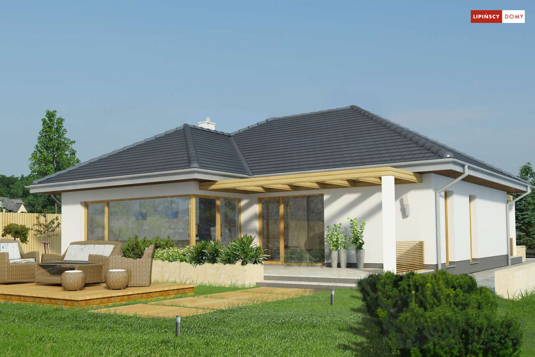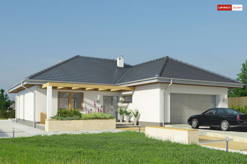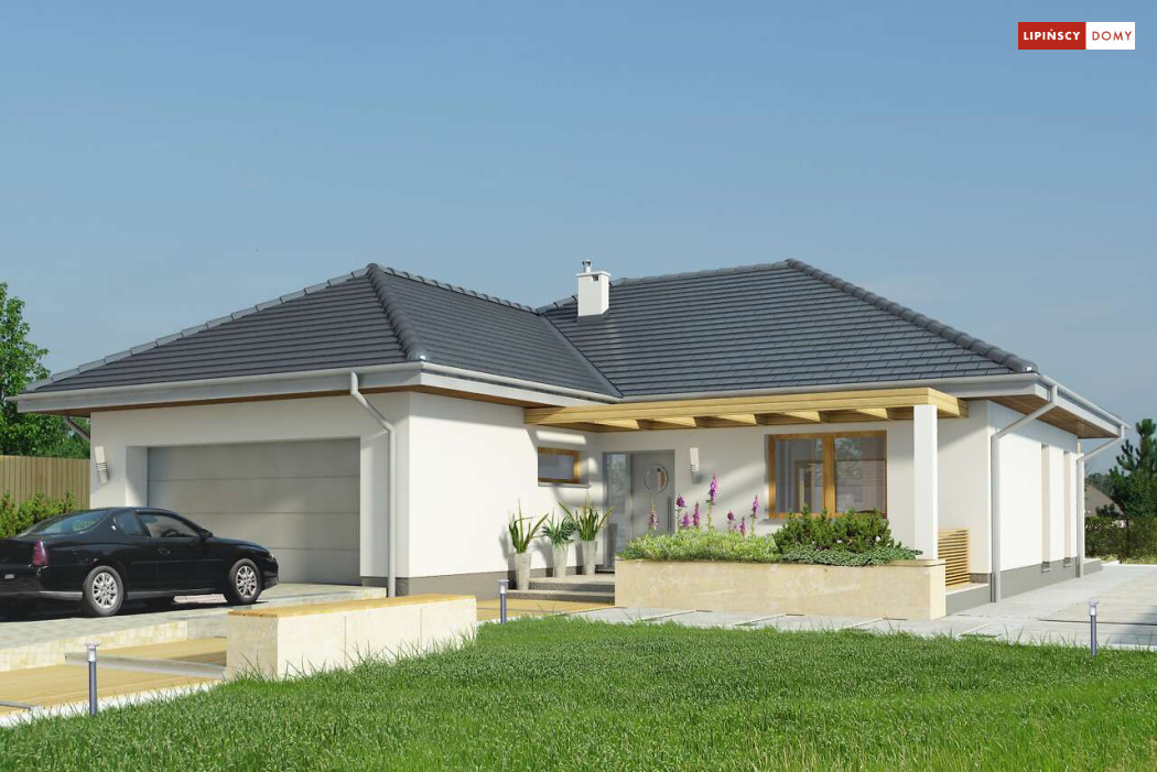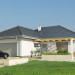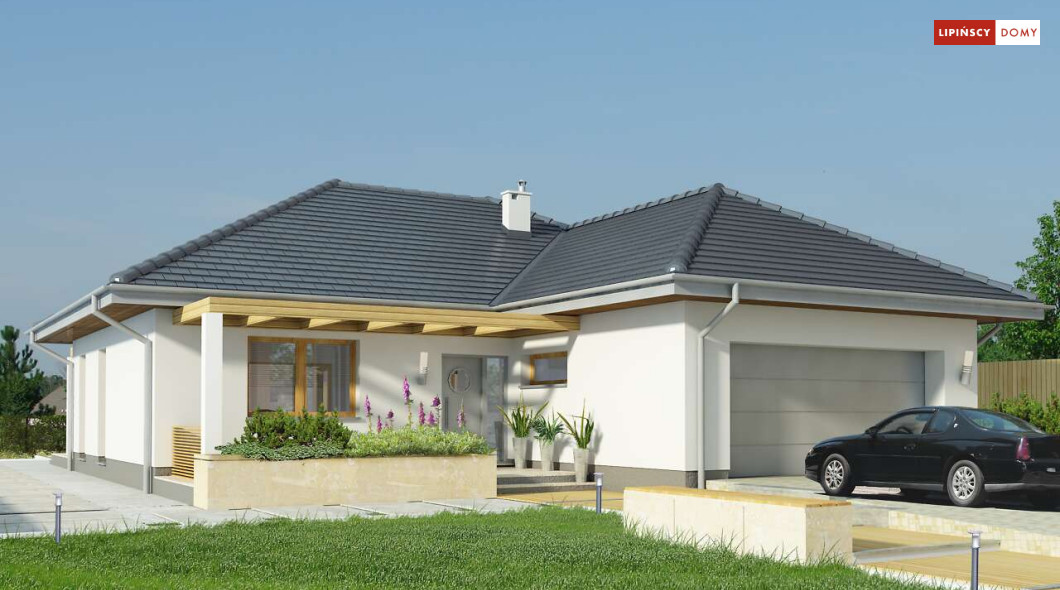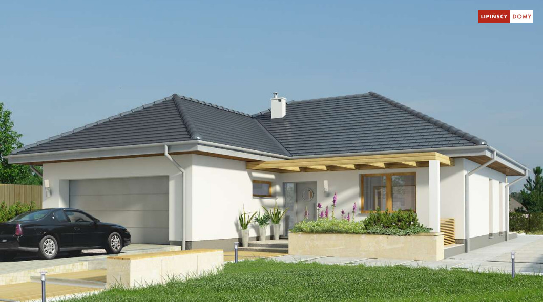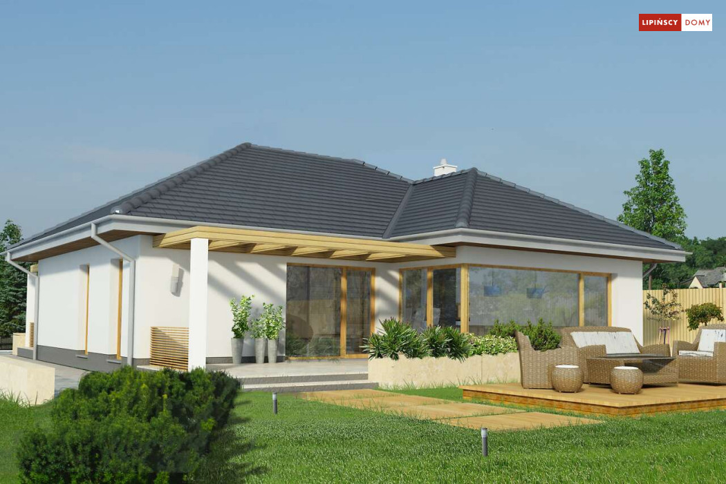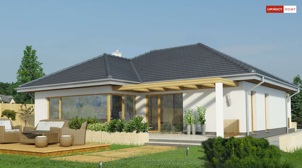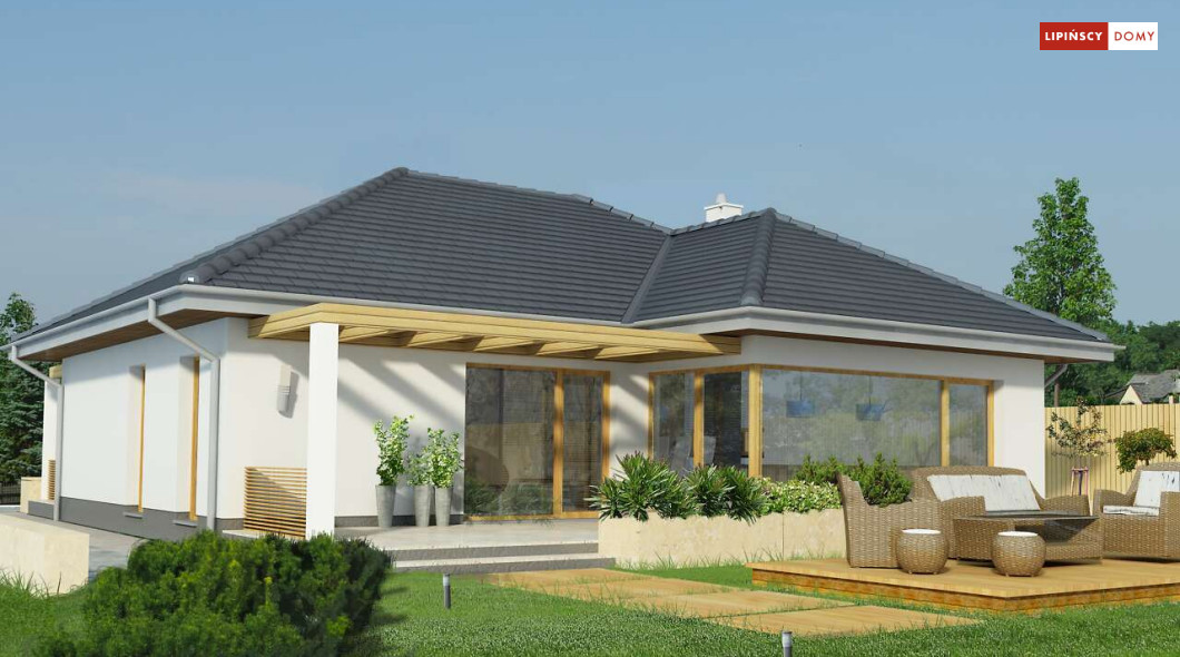 Wygodny dom parterowy dla tych, którzy pomimo małej rodziny nie chcą rezygnować z przestronnych pomieszczeń i nowoczesnych aranżacji. Świadczy o tym m.in. bardzo duża sypialnia z wyjściem na taras i własną garderobą o dużej pojemności. Przy dwóch sypialniach nie ma potrzeby robić dodatkowej łazienki i jedna, ale za to spora, w zupełności wystarczy. Drugi pokój może być zarówno sypialnią, lub też pokojem do pracy, w razie potrzeby pełniący rolę pokoju gościnnego. Salon z jadalnią tworzą otwartą przestrzeń, do której ogród przenika przez ogromne przeszklenia. Usytuowany centralnie kominek oddziela salon od kuchni, która może być wyposażona w nowoczesne stylistycznie meble i sprzęty, stając się tym samym ozdobą domu i centrum przyjęć.