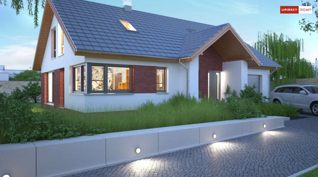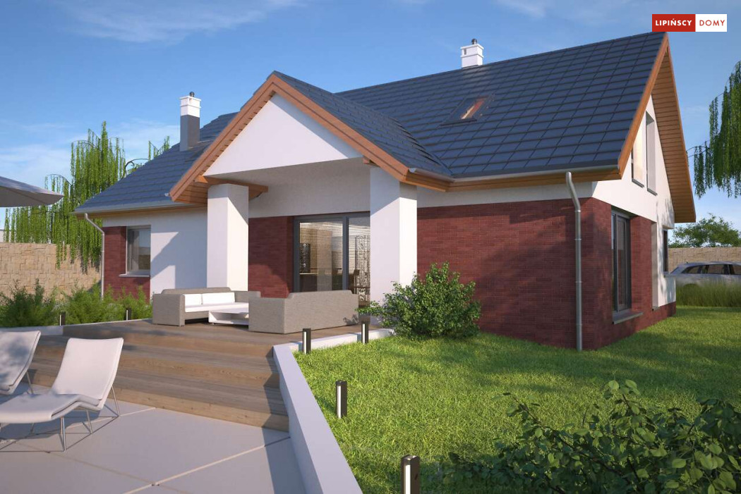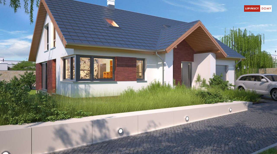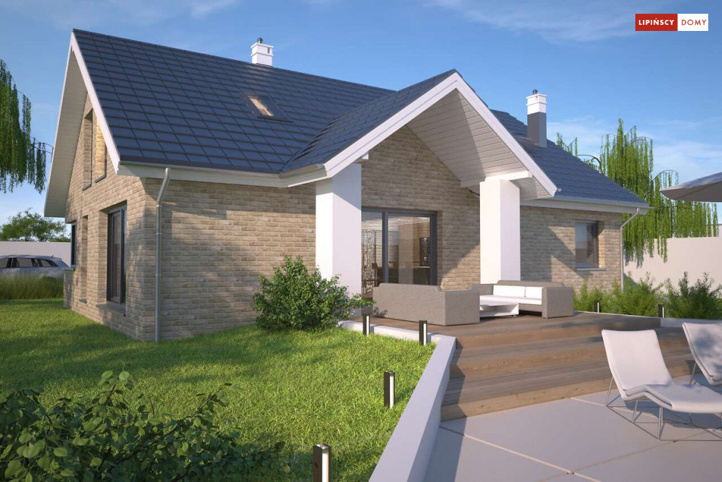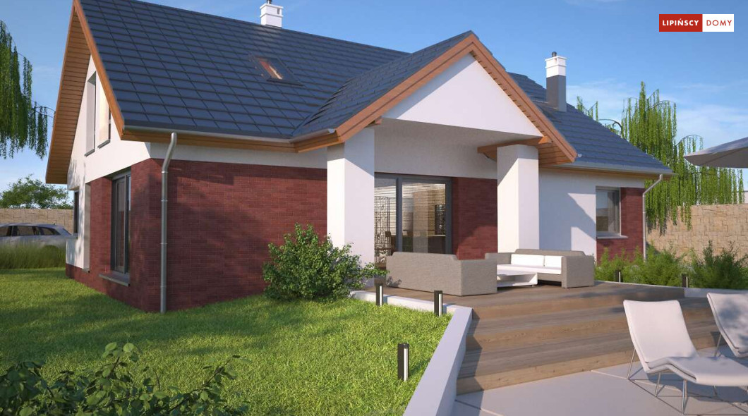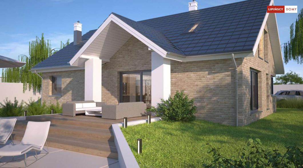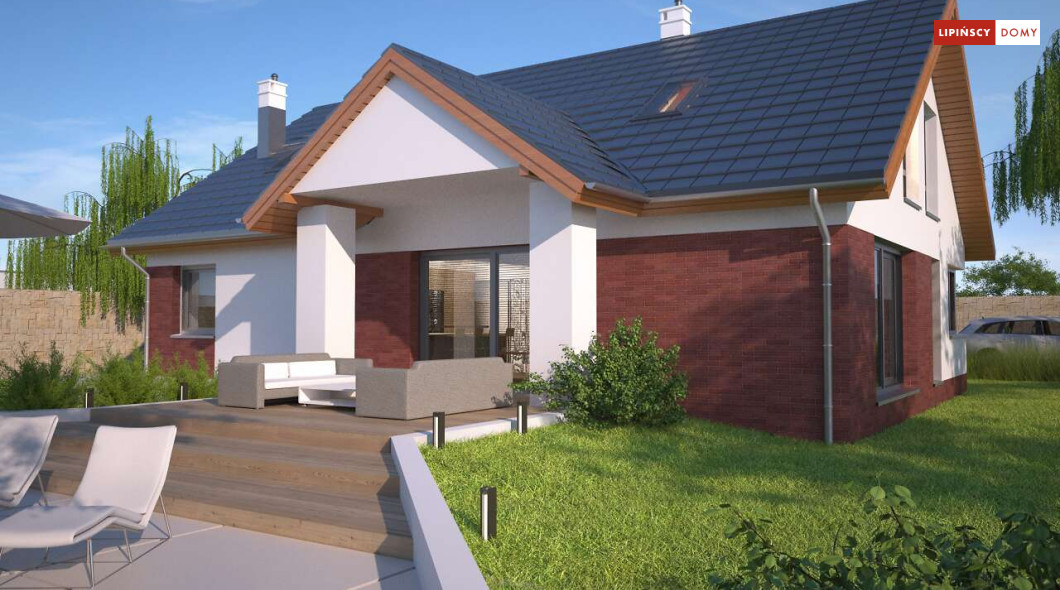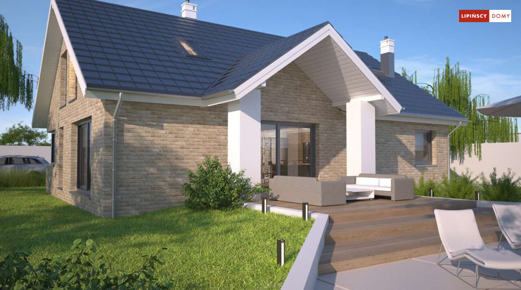 Tradycyjny dom o dwuspadowym dachu, który kryje w sobie bardzo funkcjonalny układ pomieszczeń. Sercem domu jest otwarta przestrzeń dzienna, gdzie w nowoczesny sposób połączono salon z kominkiem, jadalnię i kuchnię, w której można także zastosować tzw. wyspę. Na parterze znajduje się także duża sypialnia z łazienką obok, więc może nadawać się na sypialnię dla rodziców. Natomiast na poddaszu znajdują się trzy spore pokoje dla dzieci, w tym jeden z garderobą oraz łazienka.