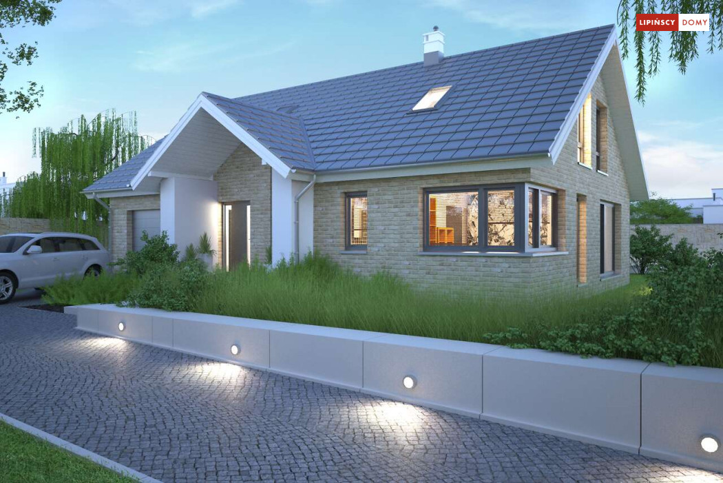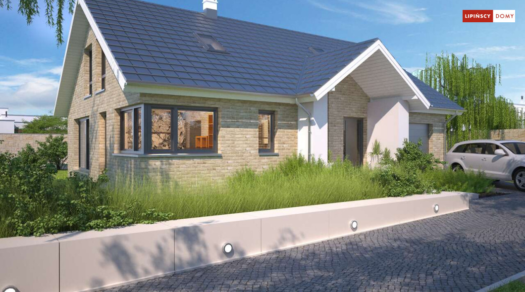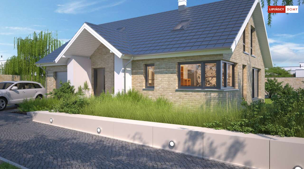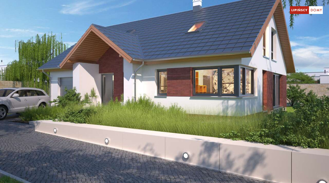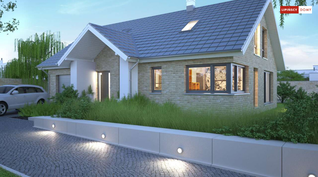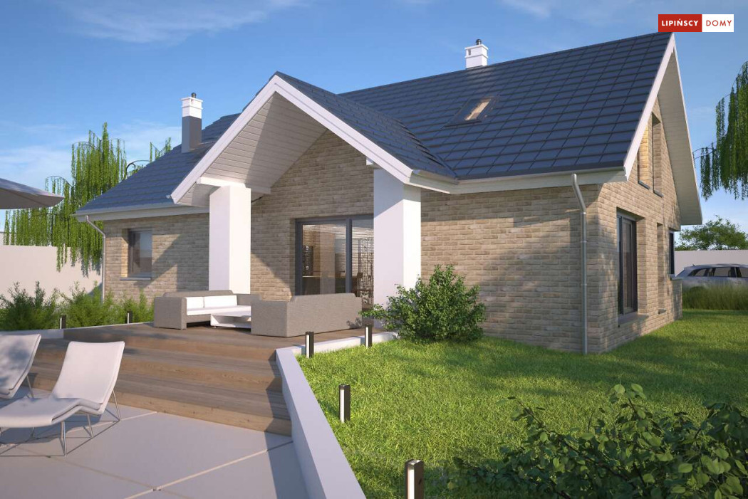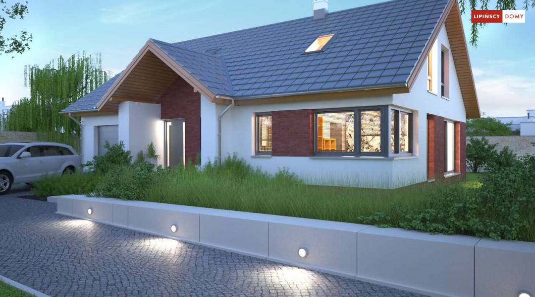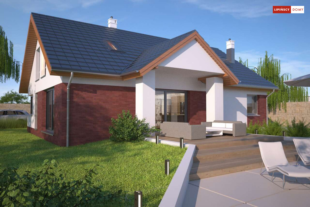Tradycyjny dom o dwuspadowym dachu, który kryje w sobie bardzo funkcjonalny układ pomieszczeń. Sercem domu jest otwarta przestrzeń dzienna, gdzie w nowoczesny sposób połączono salon z kominkiem, jadalnię i kuchnię, w której można także zastosować tzw. wyspę. Na parterze znajduje się także duża sypialnia z łazienką obok, więc może nadawać się na sypialnię dla rodziców. Natomiast na poddaszu znajdują się trzy spore pokoje dla dzieci, w tym jeden z garderobą oraz łazienka.