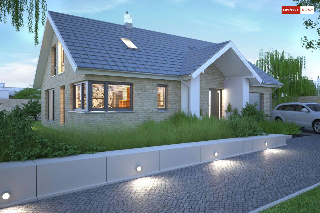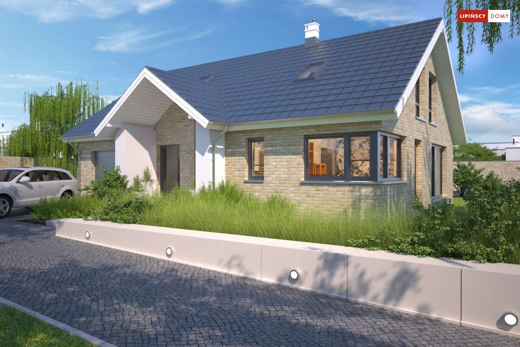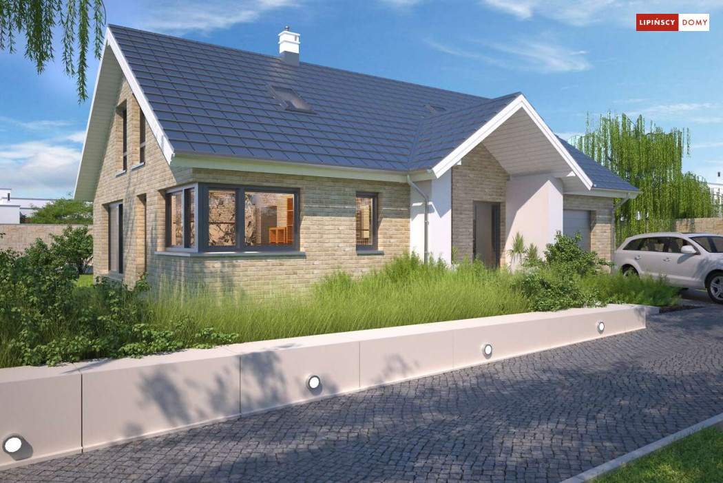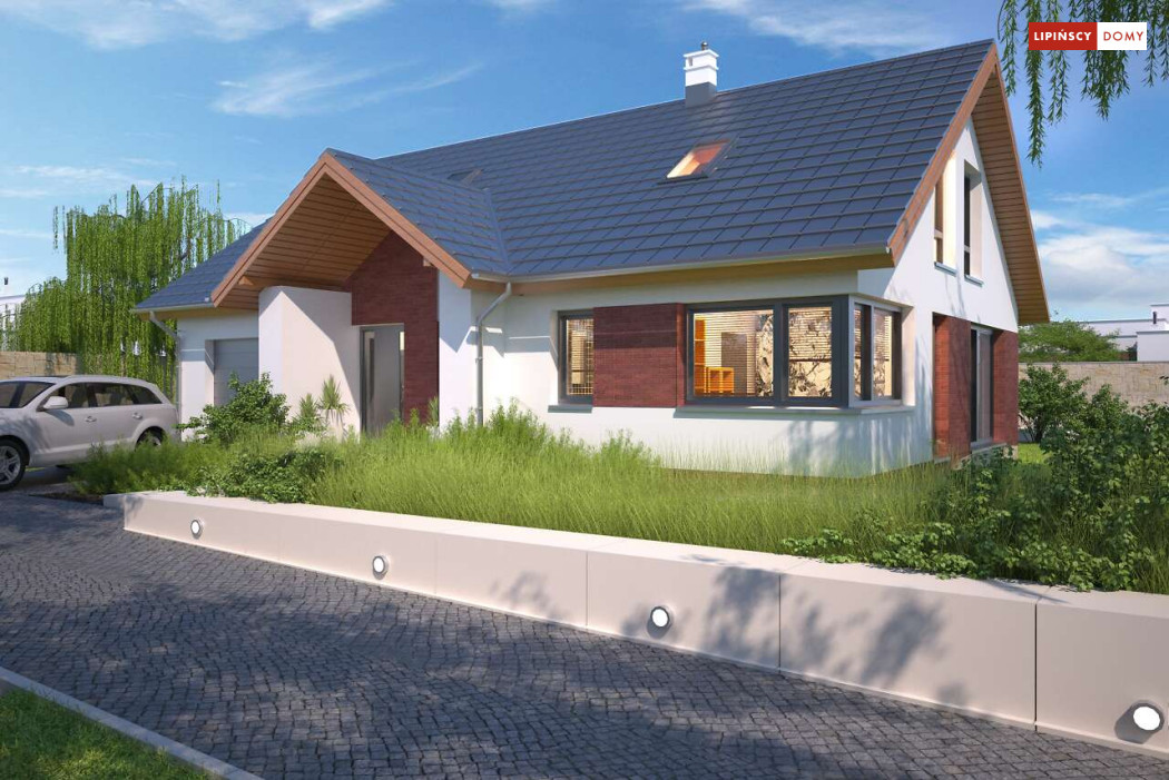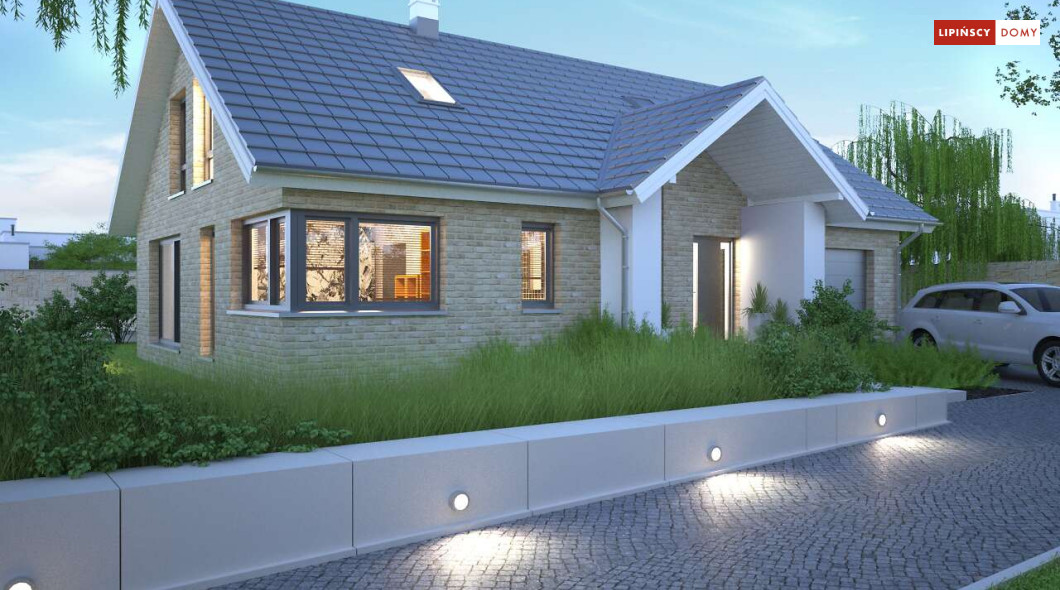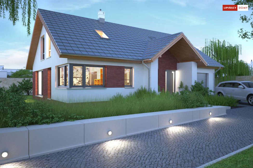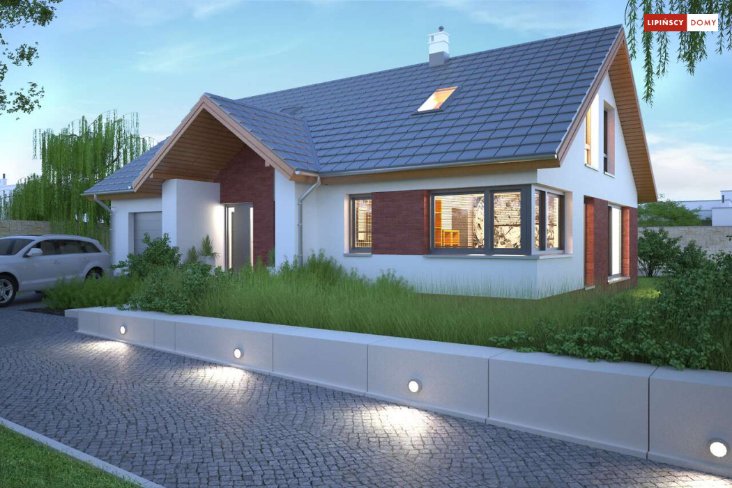 Tradycyjny dom o dwuspadowym dachu, który kryje w sobie bardzo funkcjonalny układ pomieszczeń. Sercem domu jest otwarta przestrzeń dzienna, gdzie w nowoczesny sposób połączono salon z kominkiem, jadalnię i kuchnię, w której można także zastosować tzw. wyspę. Na parterze znajduje się także duża sypialnia z łazienką obok, więc może nadawać się na sypialnię dla rodziców. Natomiast na poddaszu znajdują się trzy spore pokoje dla dzieci, w tym jeden z garderobą oraz łazienka.