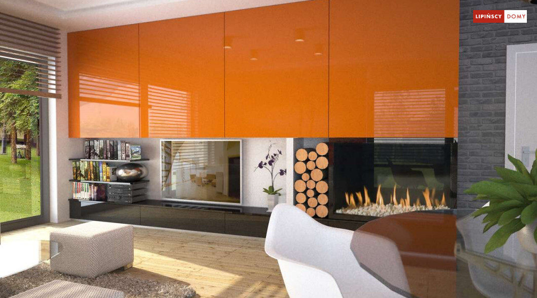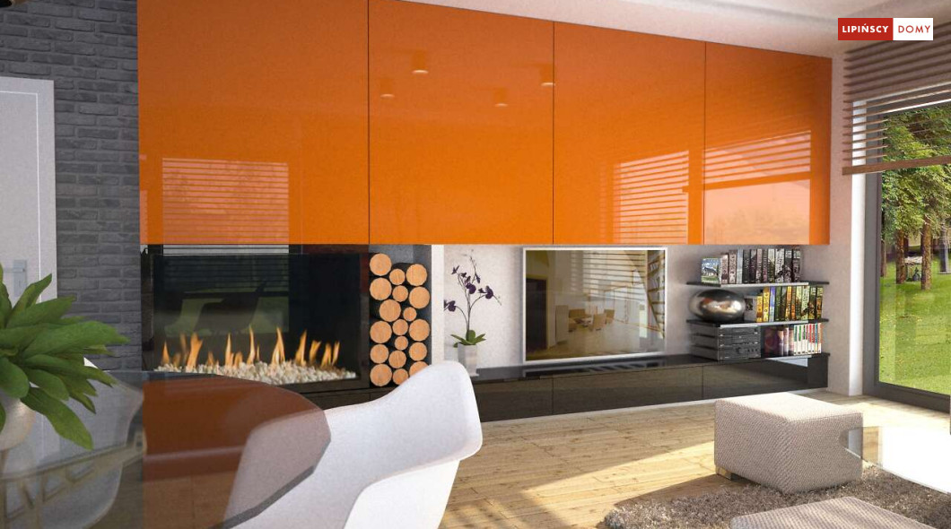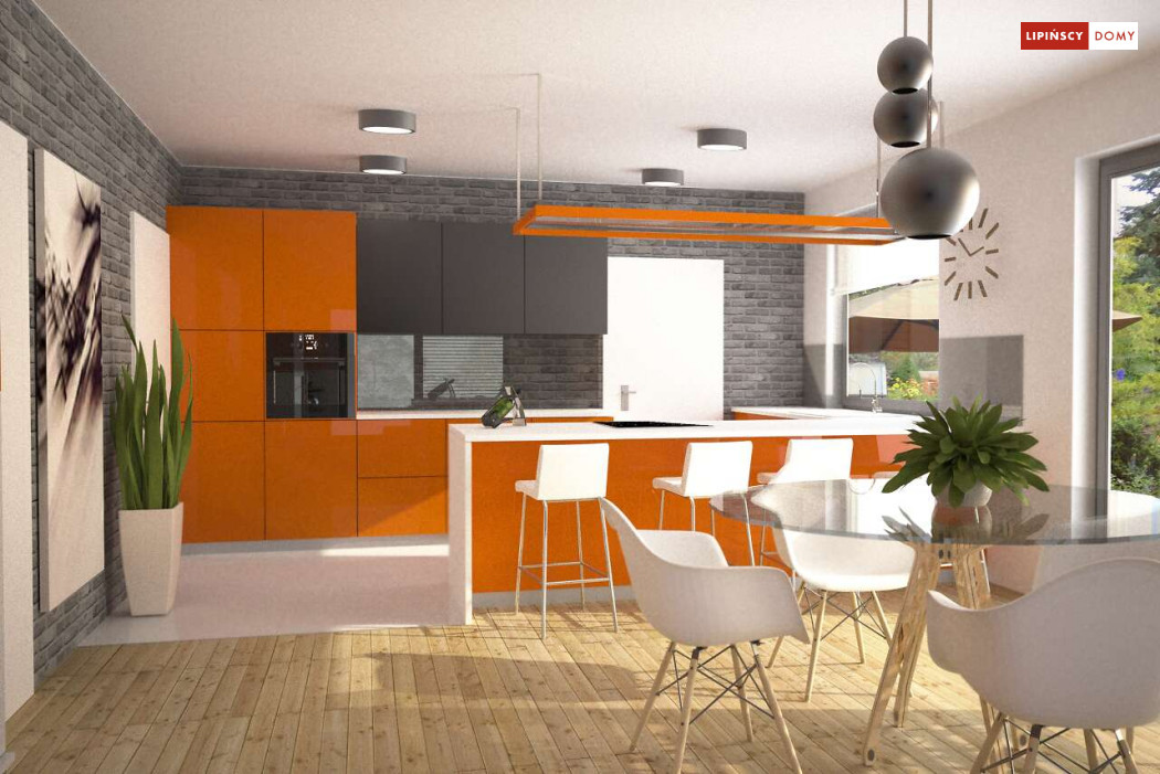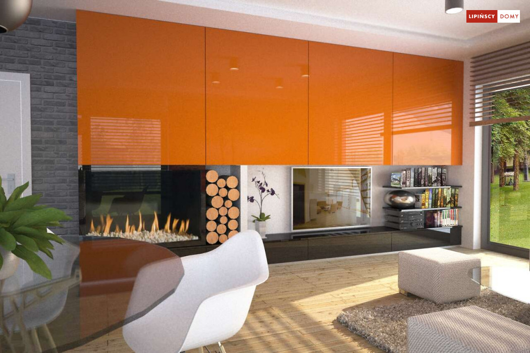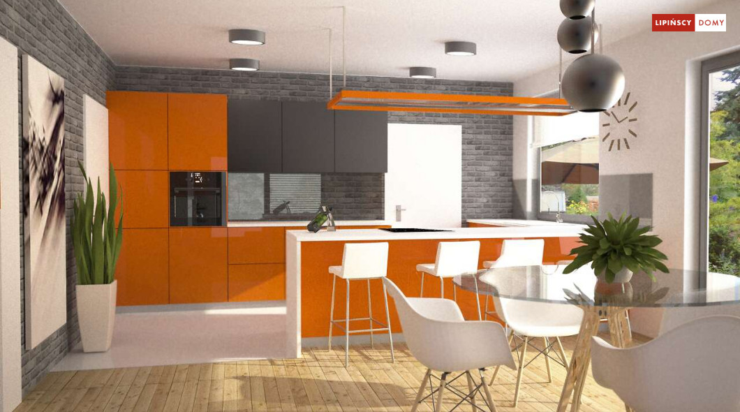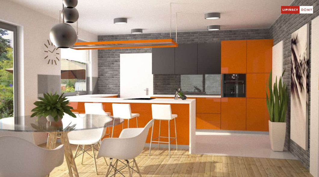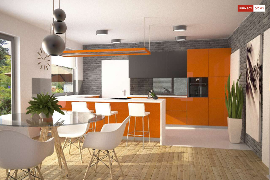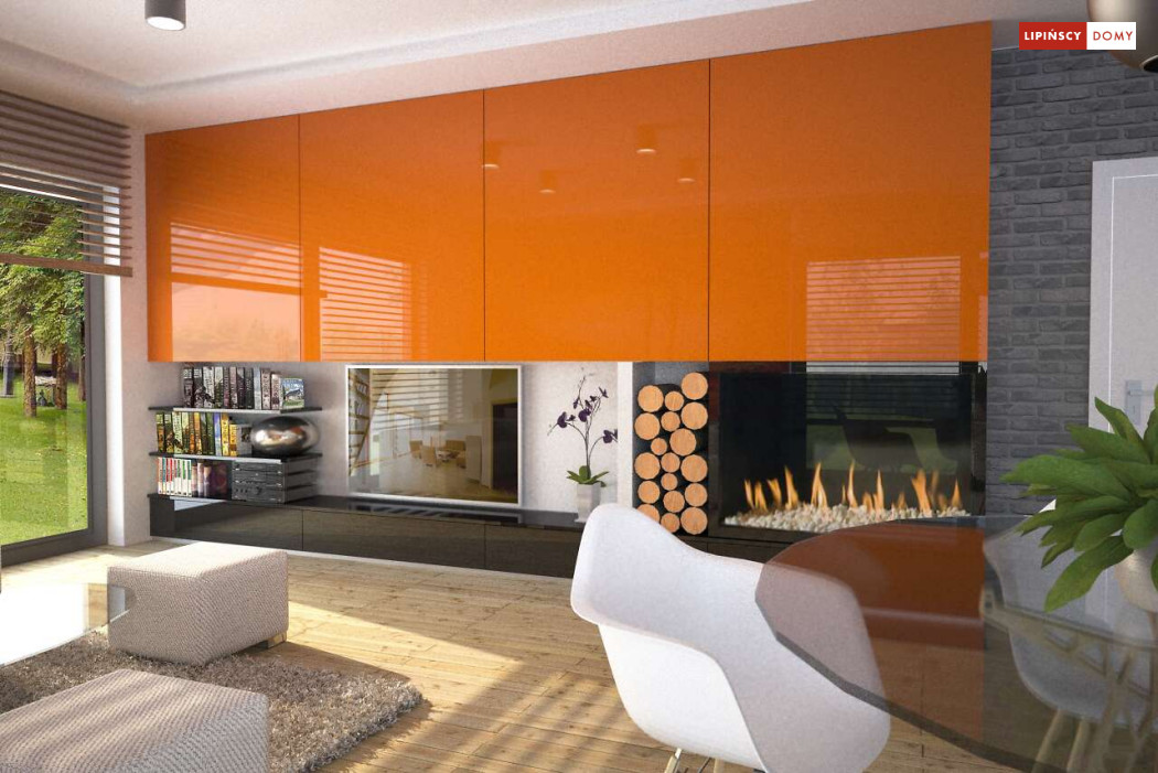 Tradycyjny dom o dwuspadowym dachu, który kryje w sobie bardzo funkcjonalny układ pomieszczeń. Sercem domu jest otwarta przestrzeń dzienna, gdzie w nowoczesny sposób połączono salon z kominkiem, jadalnię i kuchnię, w której można także zastosować tzw. wyspę. Na parterze znajduje się także duża sypialnia z łazienką obok, więc może nadawać się na sypialnię dla rodziców. Natomiast na poddaszu znajdują się trzy spore pokoje dla dzieci, w tym jeden z garderobą oraz łazienka.